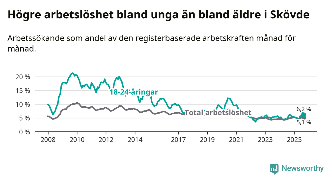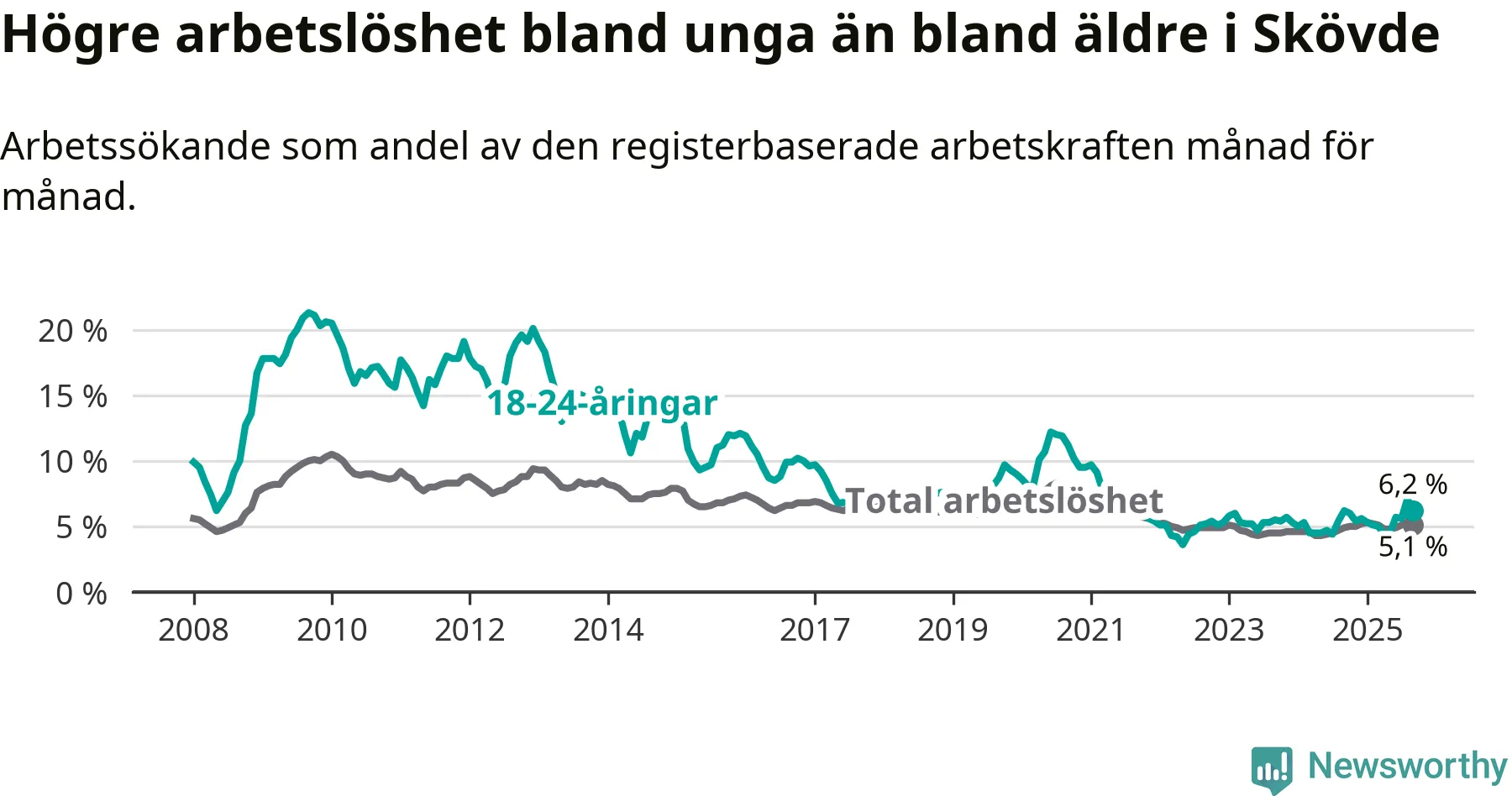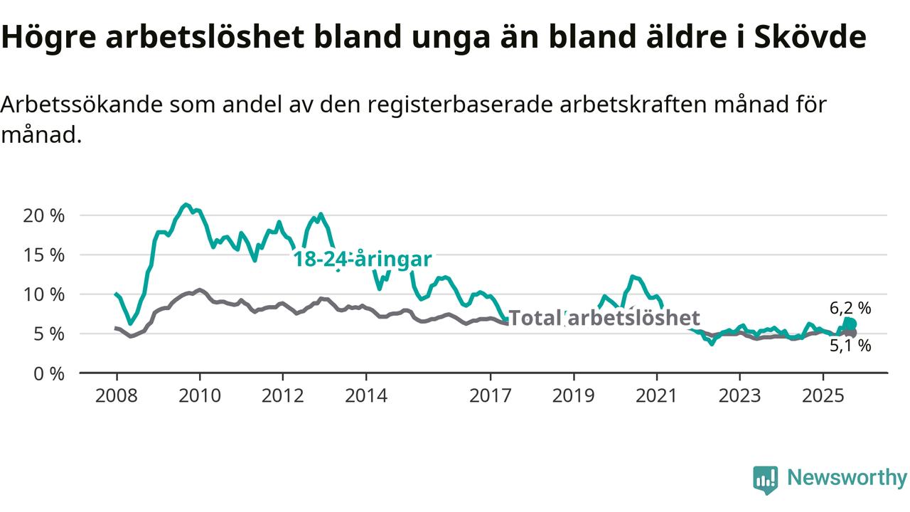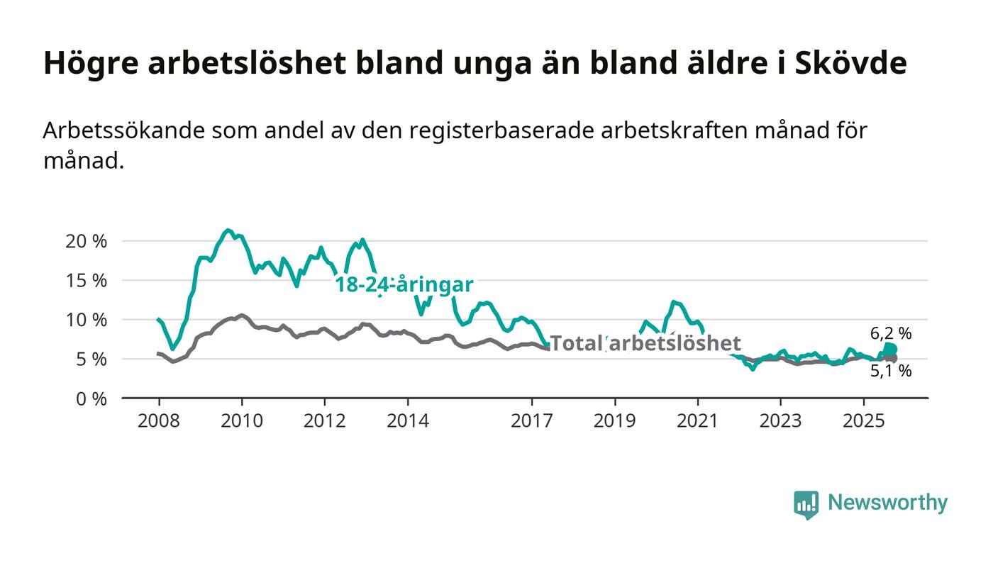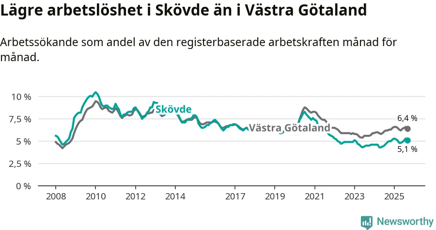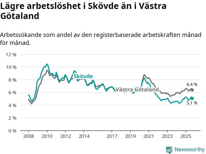 Under september månad rapporterade Skövde kommun en total arbetslöshet på 5,1 procent. Det är en ökning jämfört med samma tidpunkt i fjol (+0,2 procentenheter). Även i Västra Götalands län stiger arbetslösheten .