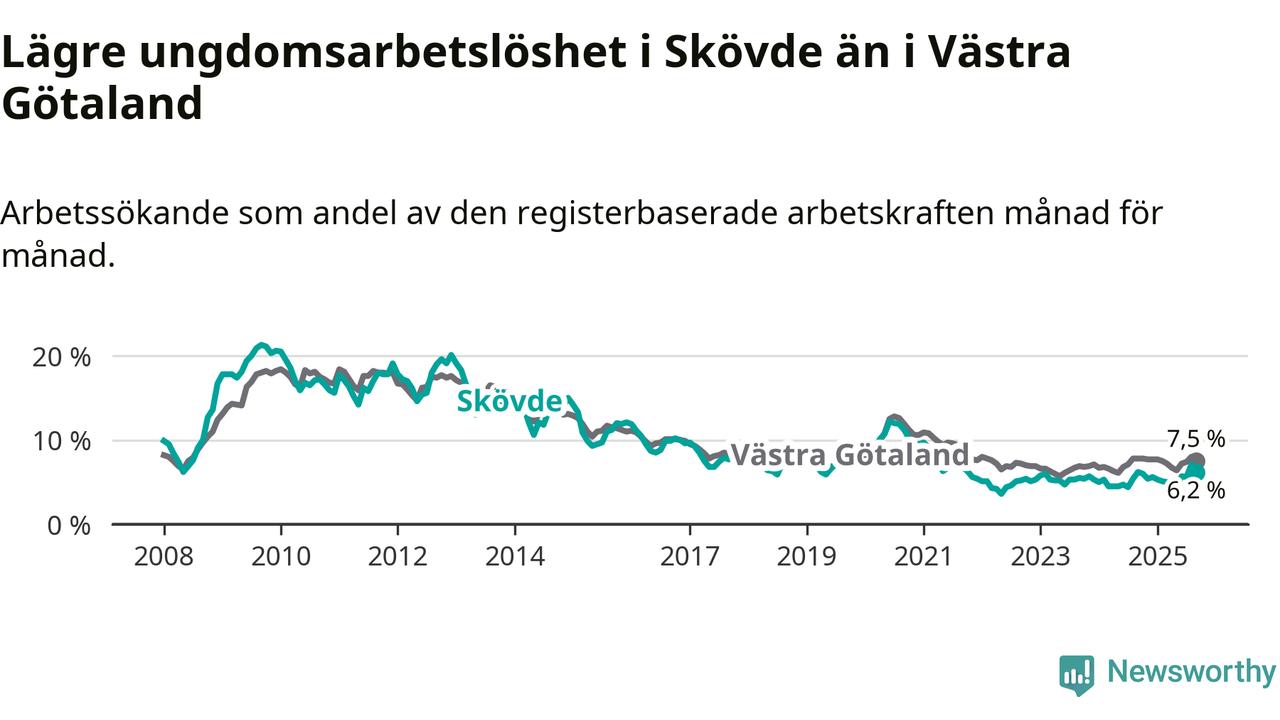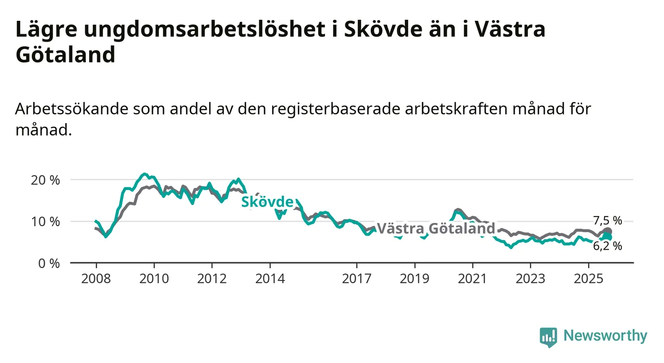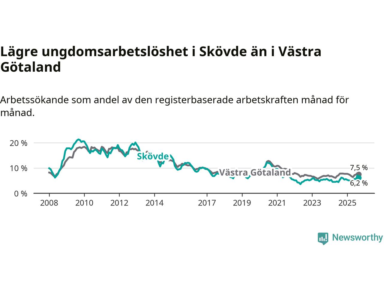 Precis som den totala arbetslösheten ligger ungdomsarbetslösheten i Skövde lägre än i Västra Götaland som helhet. Skillnaden mellan kommunen och länet är 1,3 procentenheter.