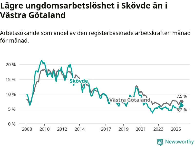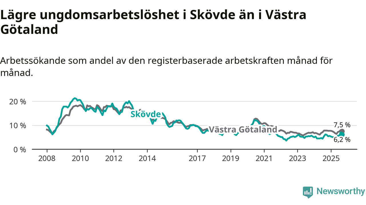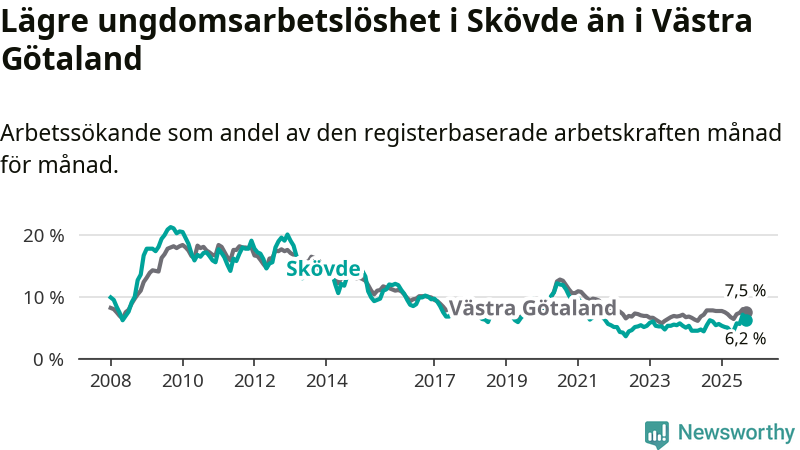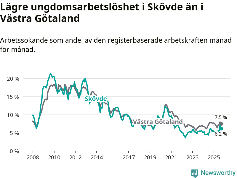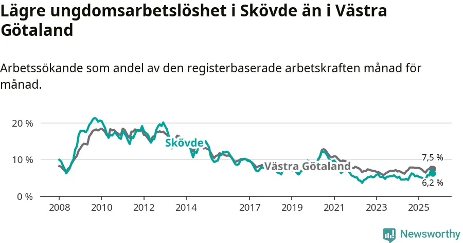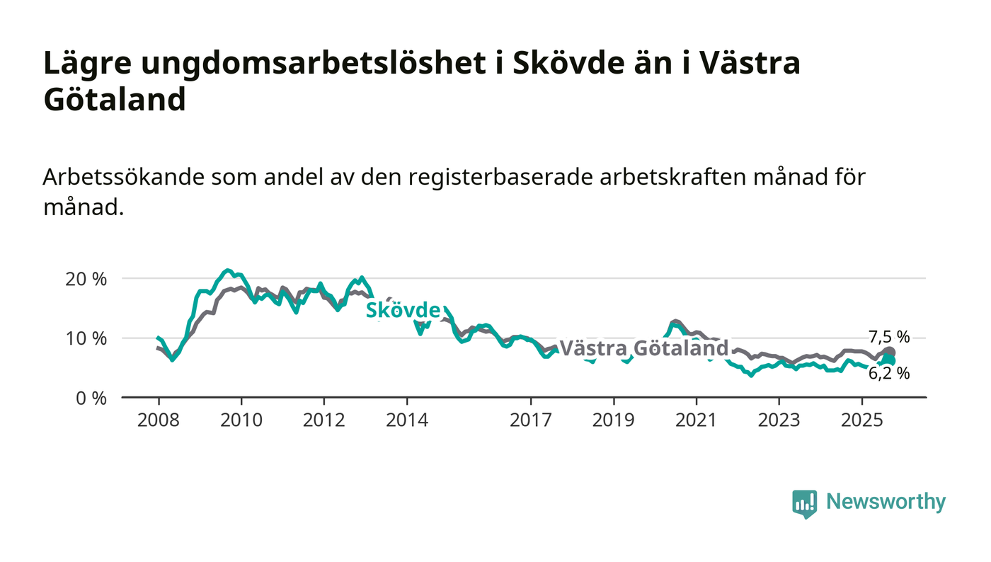 Precis som den totala arbetslösheten ligger ungdomsarbetslösheten i Skövde lägre än i Västra Götaland som helhet. Skillnaden mellan kommunen och länet är 1,3 procentenheter.