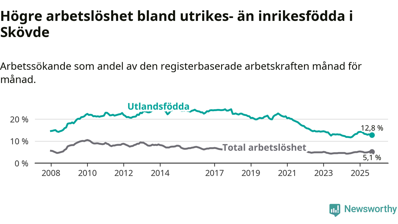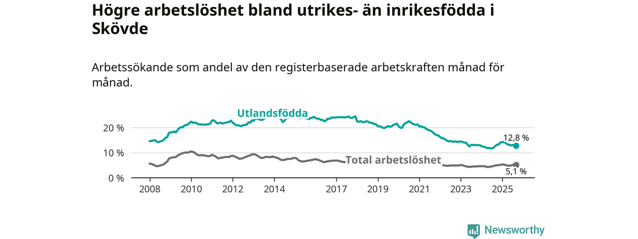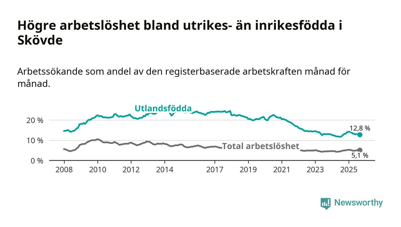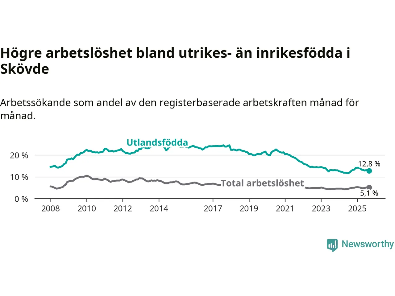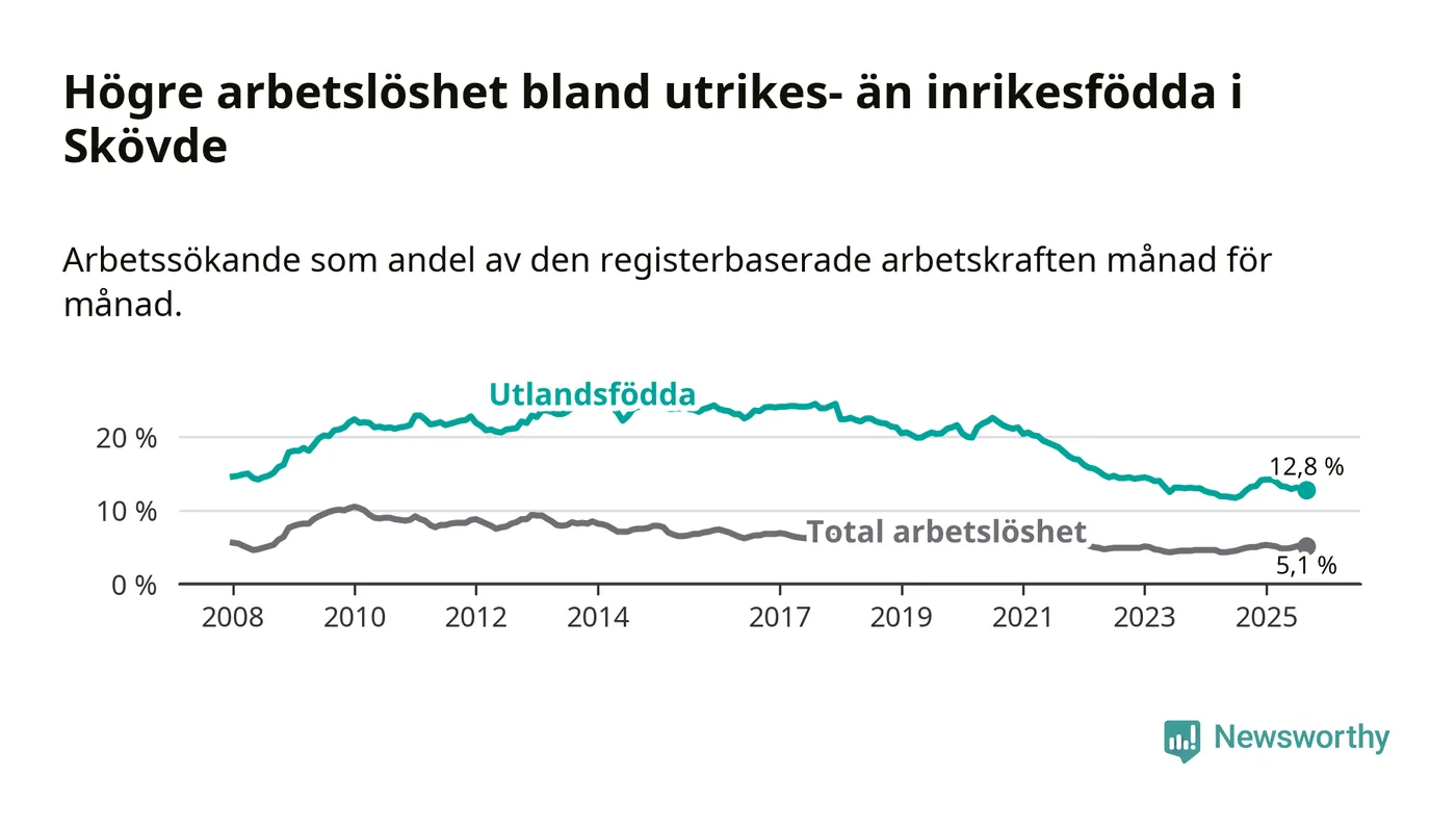 Arbetslösheten bland utlandsfödda var 12,8 procent i Skövde under september månad, motsvarande 752 av 5 875 personer. Det är 0,1 procentenheter fler än vid samma tidpunkt i fjol (+25 om man räknar personer). Därmed är de utlandsföddas arbetslöshet högre än vid samma tidpunkt i fjol för tolfte månaden i följd.