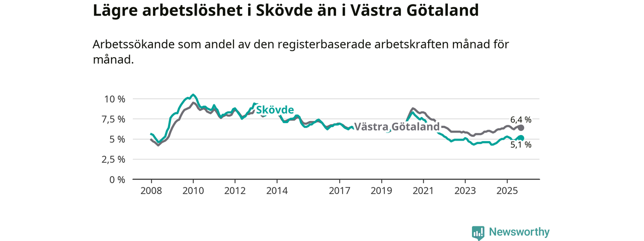 Även om arbetslösheten i Skövde alltså ökar, så ligger den fortfarande under snittet i hela Västra Götalands län (5,1 procent i kommunen, jämfört med 6,4 procent i hela länet). Öckerö har den lägsta arbetslösheten i länet (2,7 procent), medan Gullspång har den högsta (8,5 procent). För att Skövde skulle komma ner i samma arbetslöshetsnivå som Öckerö skulle 718 personer behöva sysselsättas.