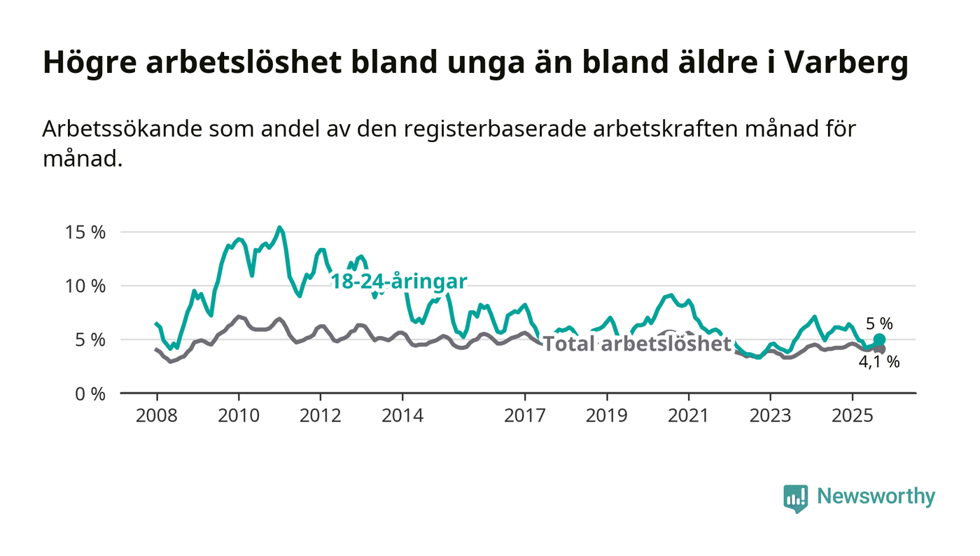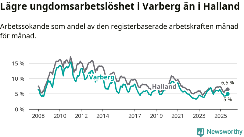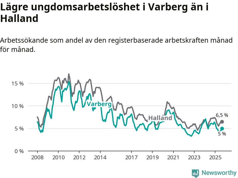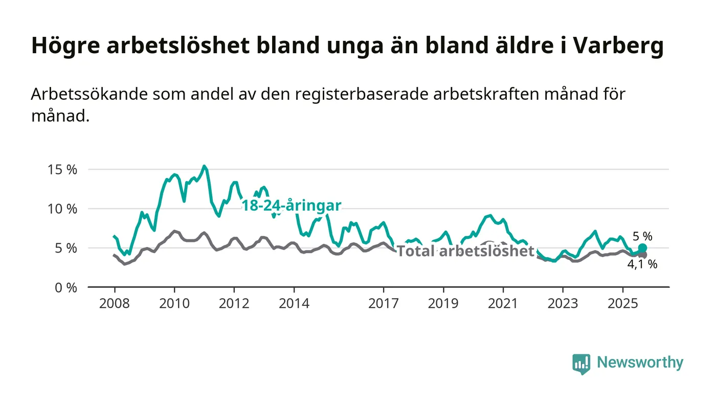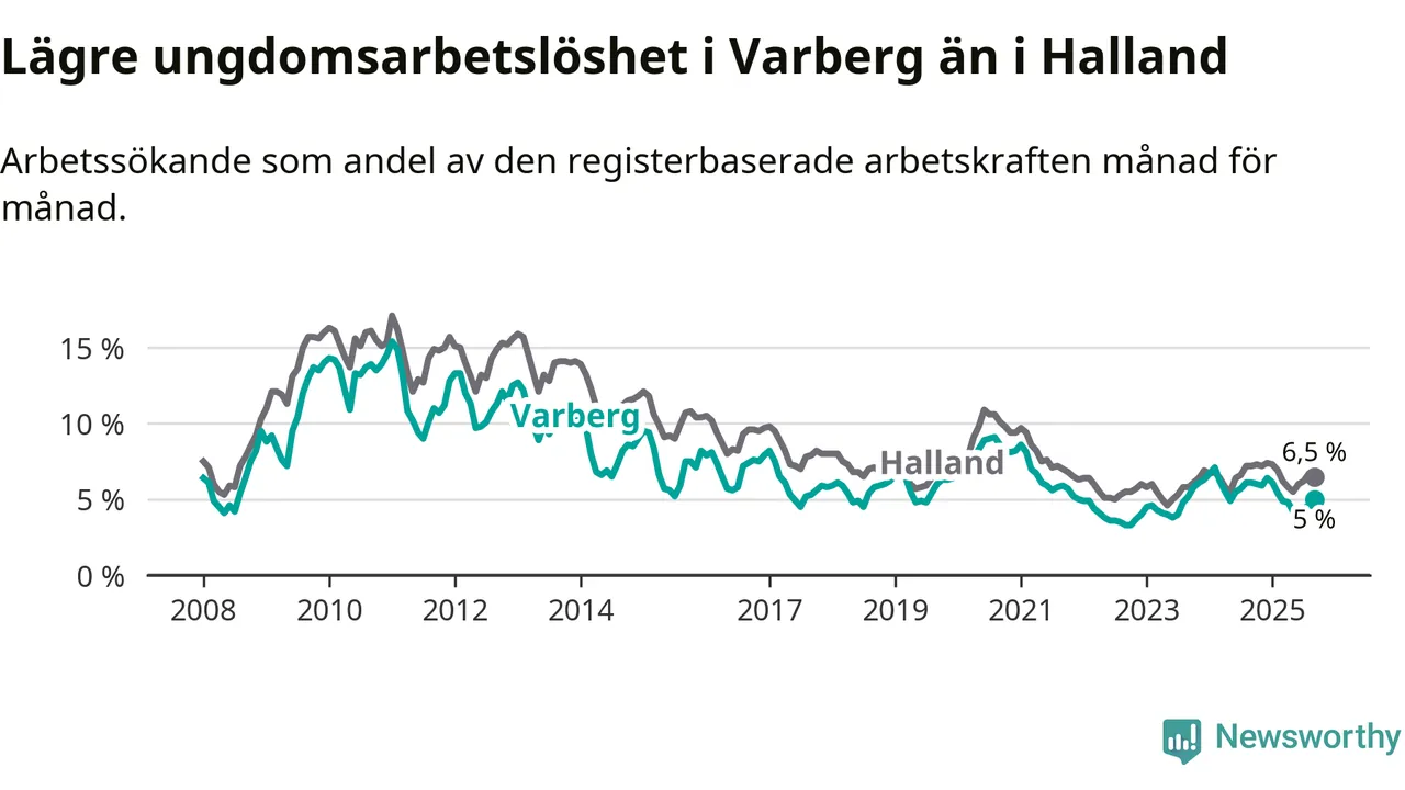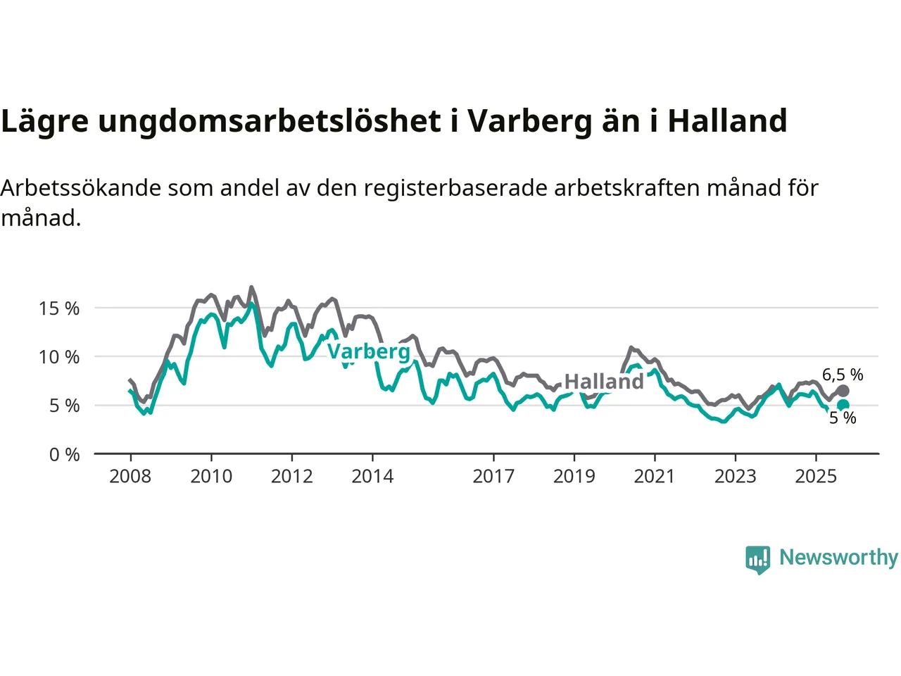 I och med den senaste månadens nedgång har de ungas arbetslöshet i Varberg sjunkit nio månader i följd (ner från 6,4 procent i december 2024 till 5,0 procent nu).