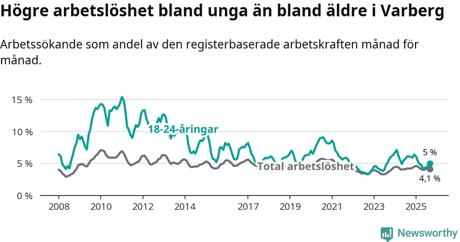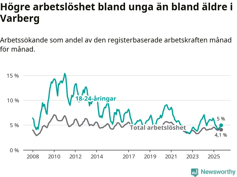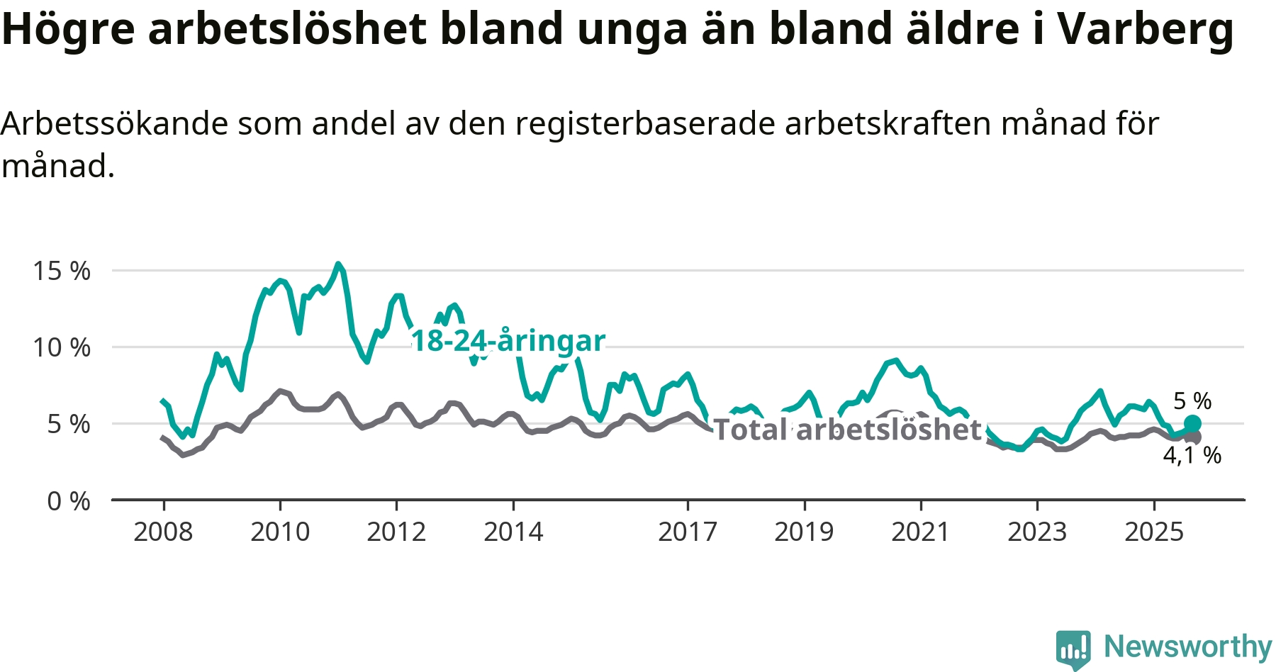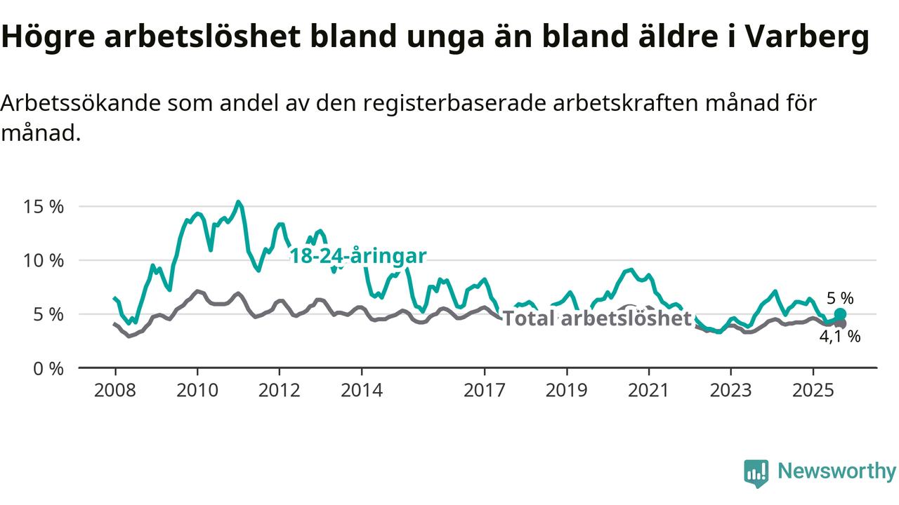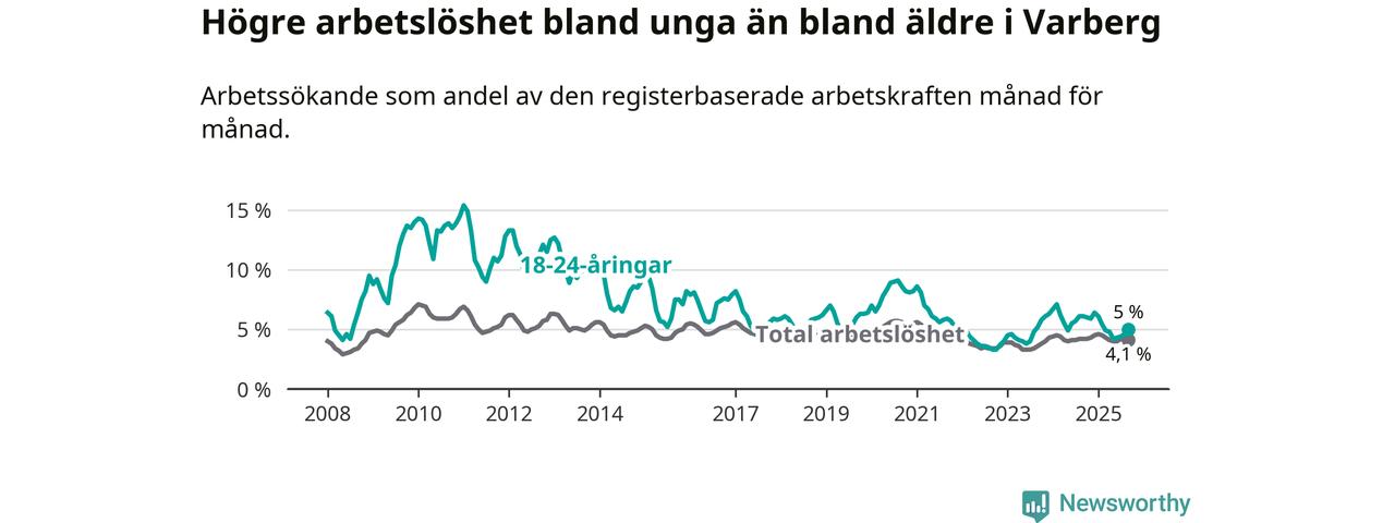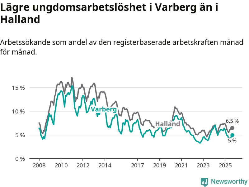 I och med den senaste månadens nedgång har de ungas arbetslöshet i Varberg sjunkit nio månader i följd (ner från 6,4 procent i december 2024 till 5,0 procent nu).