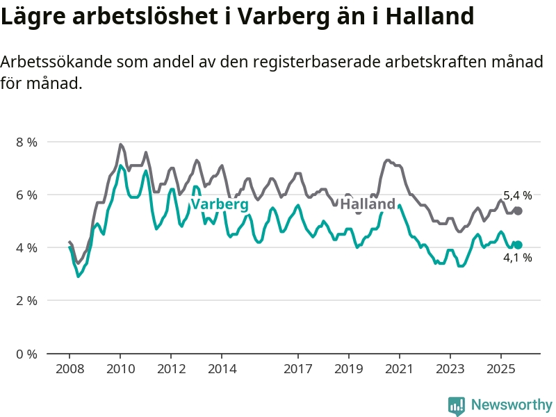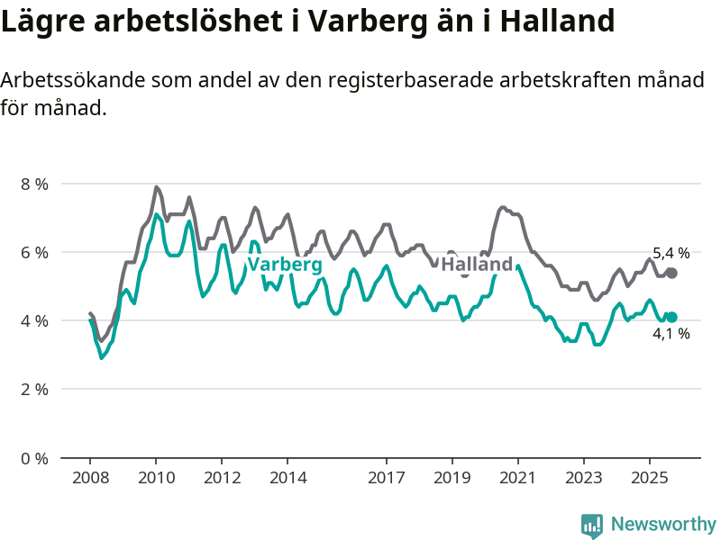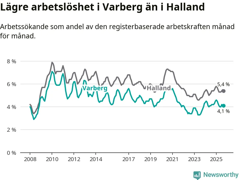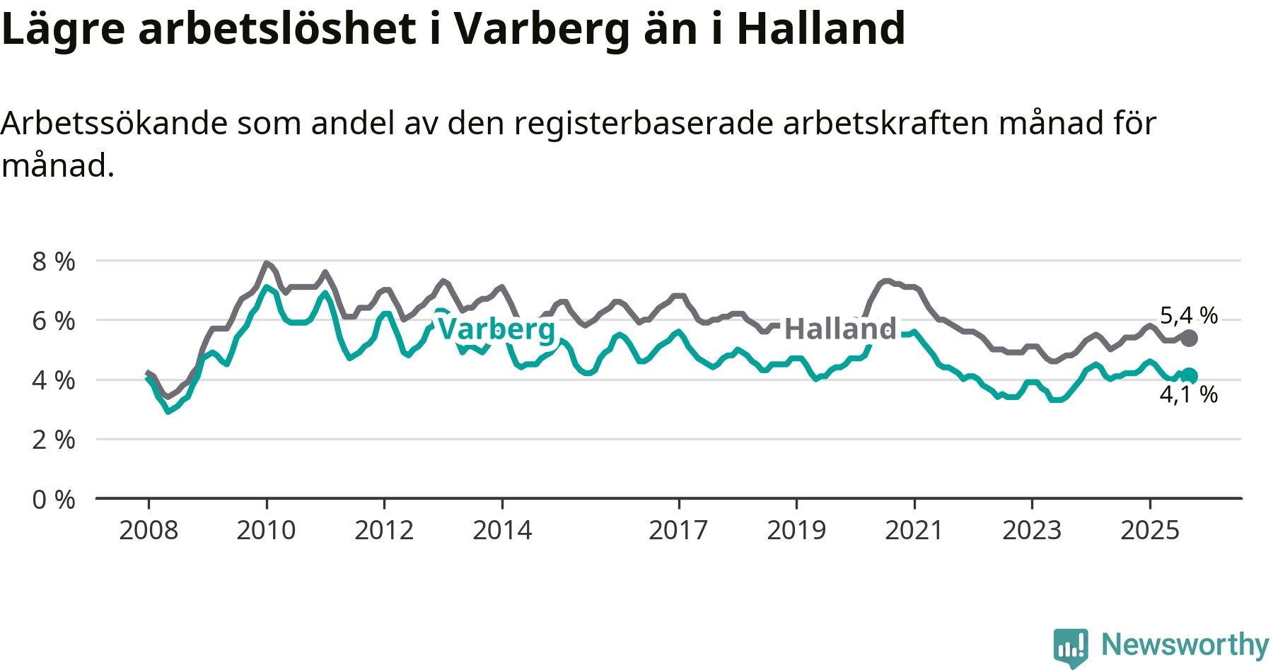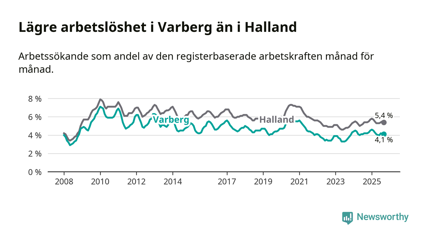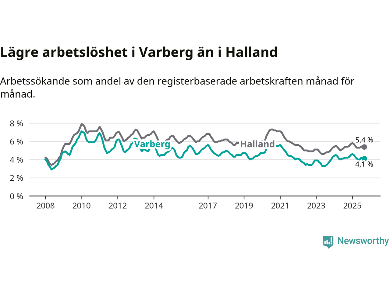 Varberg hade redan tidigare lägre arbetslöshet än snittet i hela Hallands län och nu växer klyftan (4,1 procent i kommunen, jämfört med 5,4 procent i hela länet). Kungsbacka har den lägsta arbetslösheten i länet (3,3 procent), medan Hylte har den högsta (8,2 procent). För att Varberg skulle komma ner i samma arbetslöshetsnivå som Kungsbacka skulle 269 personer behöva sysselsättas.