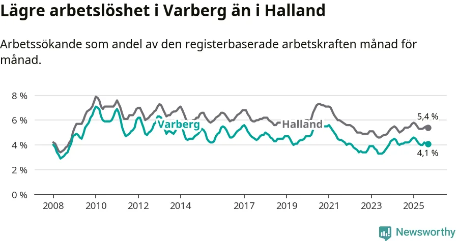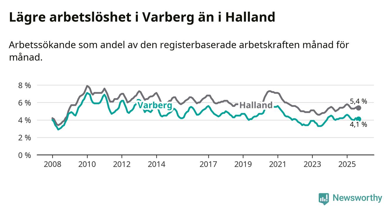 Under september månad rapporterade Varbergs kommun en total arbetslöshet på 4,1 procent. Det är en minskning jämfört med samma tidpunkt i fjol (−0,1 procentenheter). I Hallands län däremot står arbetslösheten stilla.
