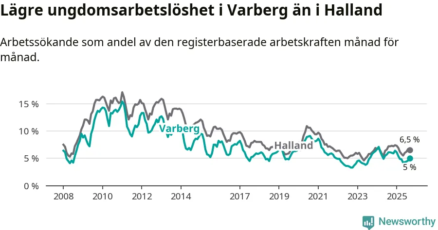 Precis som den totala arbetslösheten ligger ungdomsarbetslösheten i Varberg lägre än i Halland som helhet. Skillnaden mellan kommunen och länet är 1,5 procentenheter.
