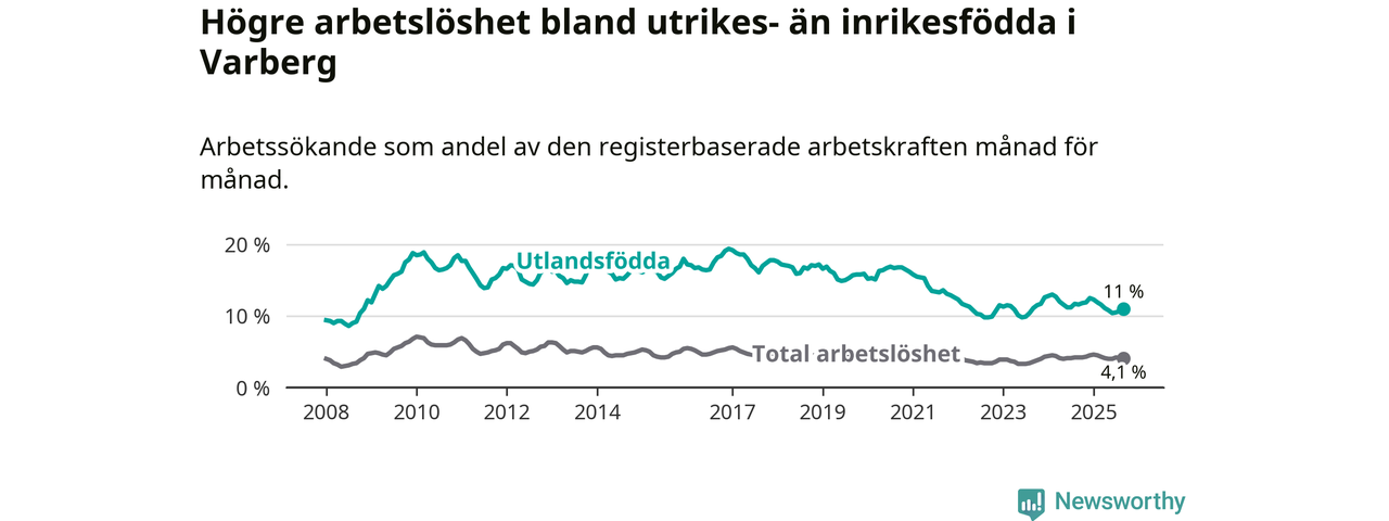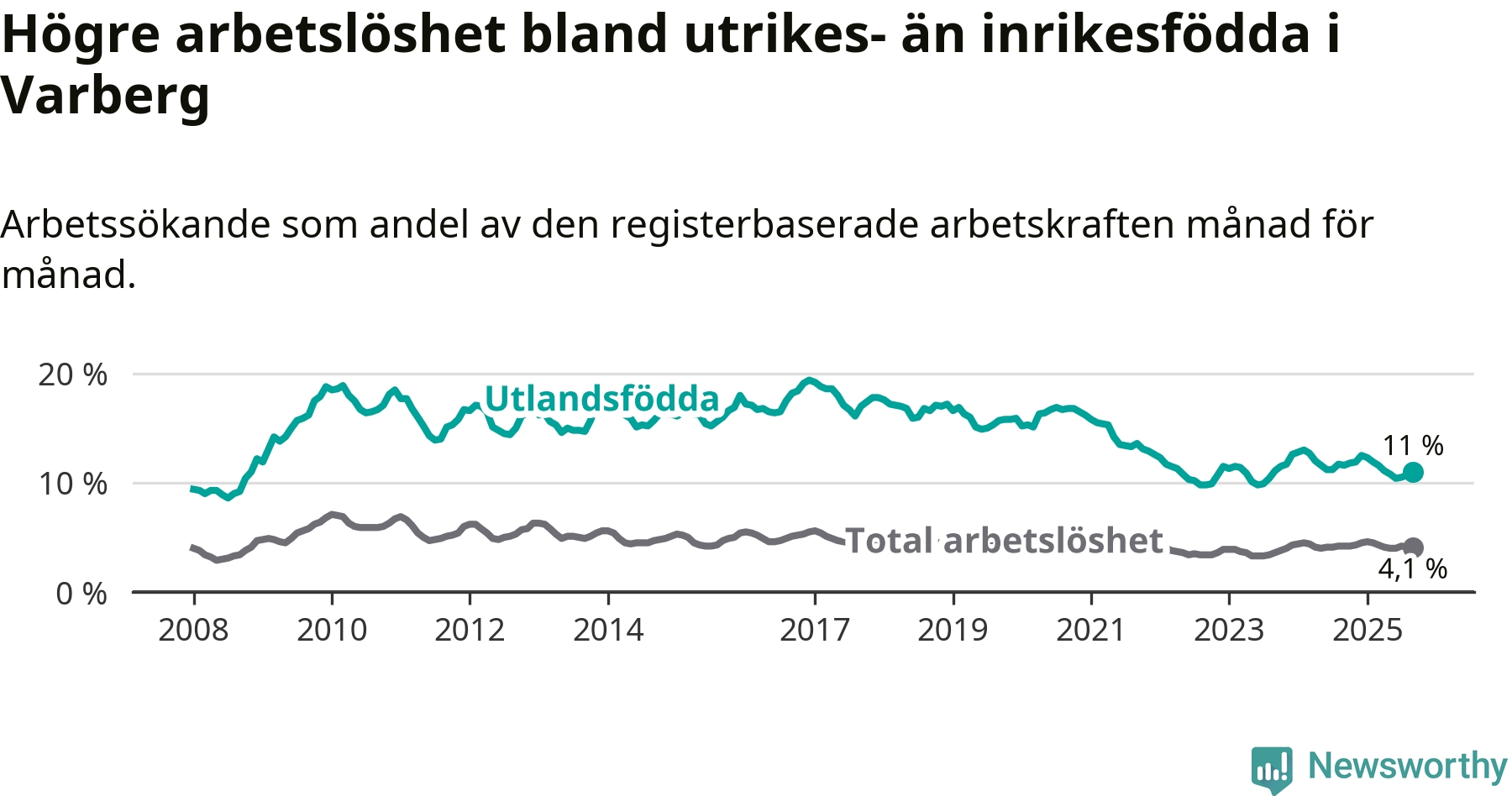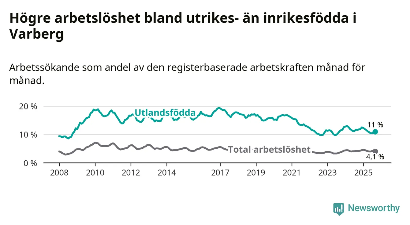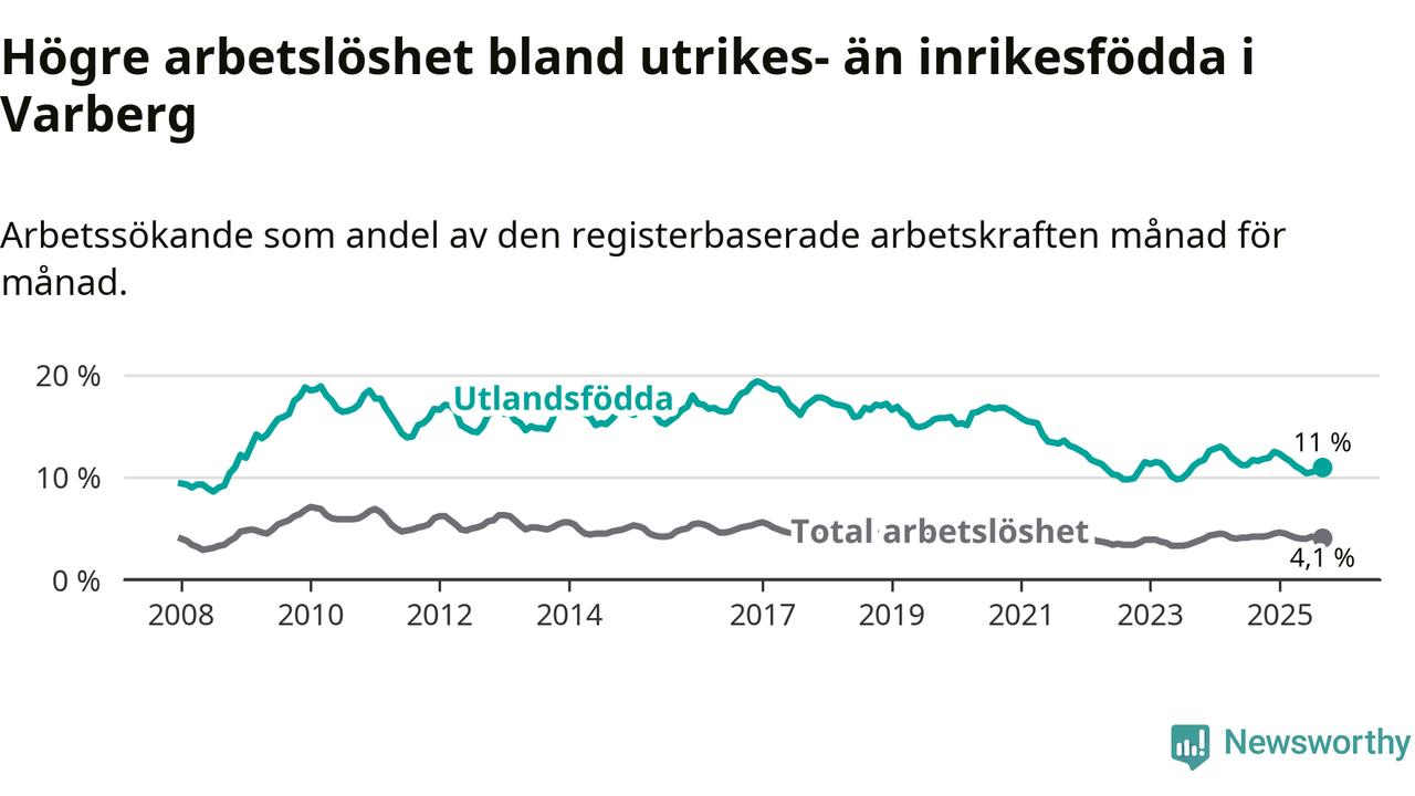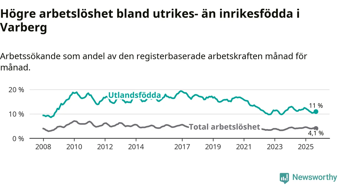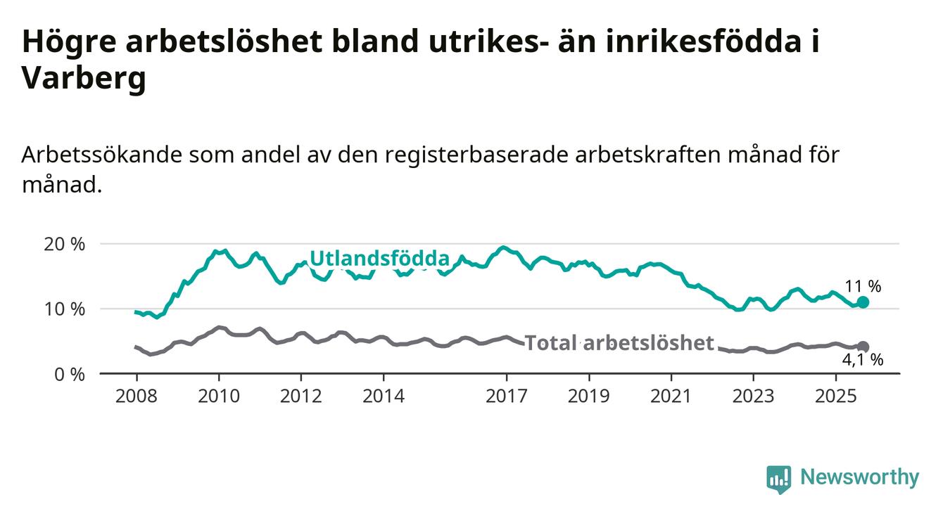 Arbetslösheten bland utlandsfödda var 11,0 procent i Varberg under september månad, motsvarande 534 av 4 855 personer. Det är 0,6 procentenheter färre än vid samma tidpunkt i fjol (−30 om man räknar personer). Därmed är de utlandsföddas arbetslöshet lägre än vid samma tidpunkt i fjol för tionde månaden i följd.