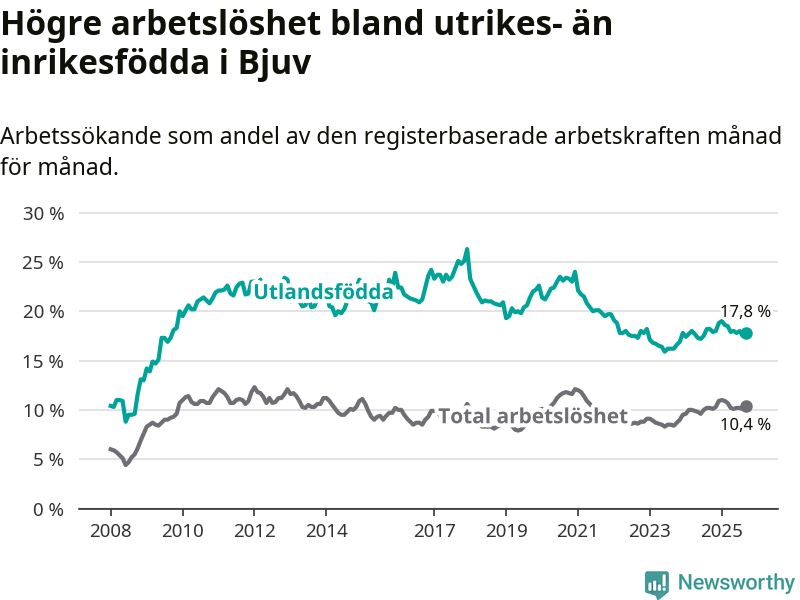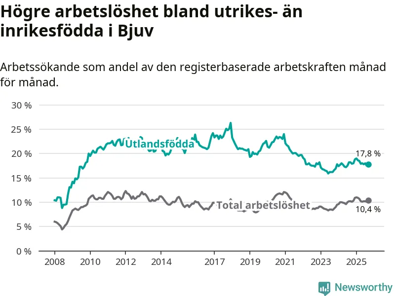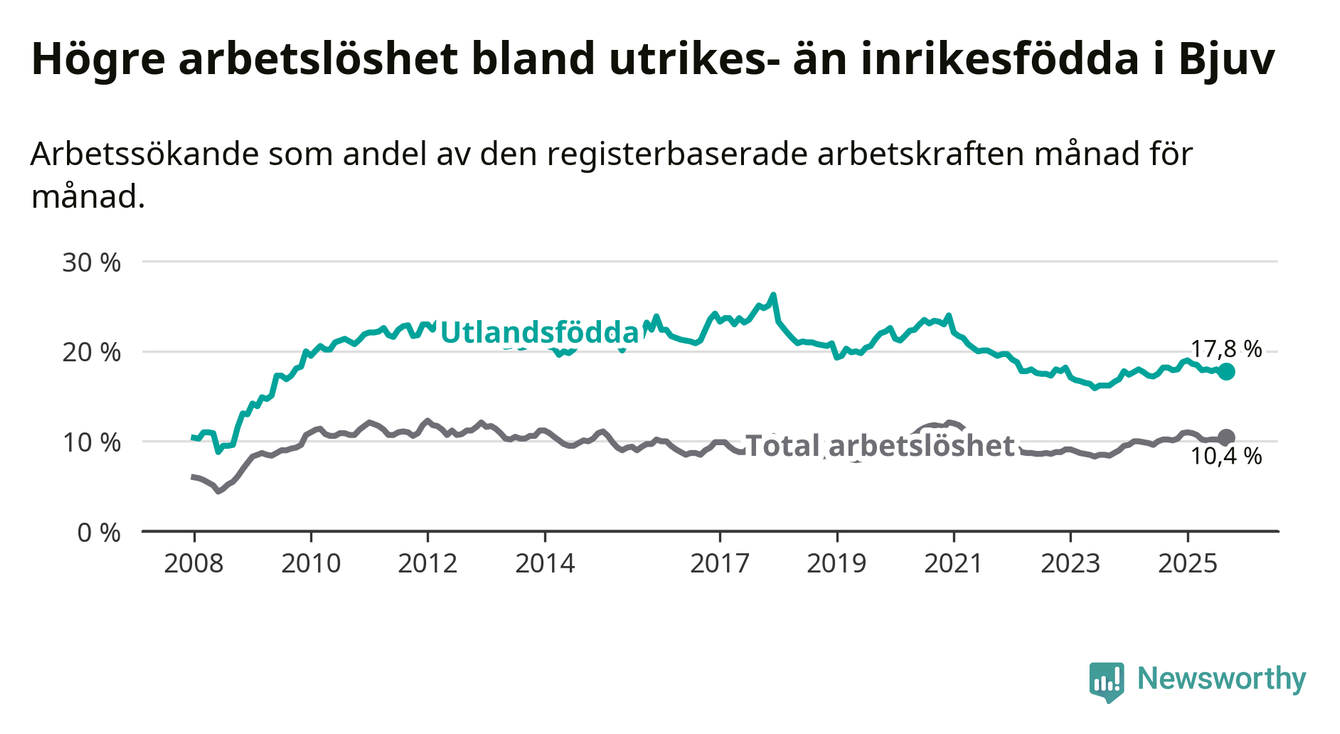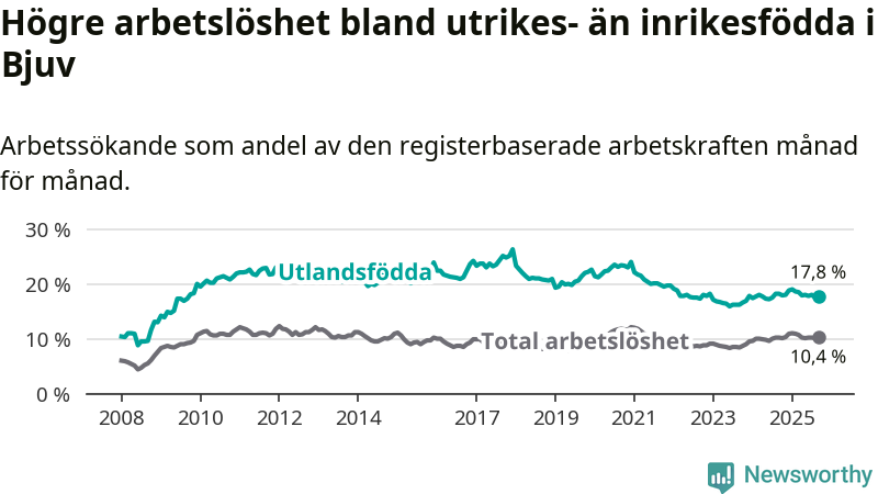 Arbetslösheten bland utlandsfödda var 17,8 procent i Bjuv under september månad, motsvarande 444 av 2 494 personer. Det är 0,4 procentenheter färre än vid samma tidpunkt i fjol (−1 om man räknar personer).