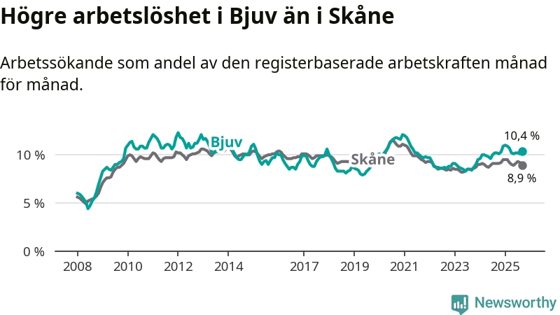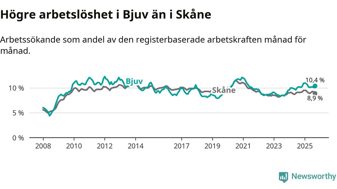 Bjuv hade redan tidigare högre arbetslöshet än snittet i hela Skåne län och nu växer klyftan (10,4 procent i kommunen, jämfört med 8,9 procent i hela länet). Lomma har den lägsta arbetslösheten i länet (4,1 procent), medan Perstorp har den högsta (13,6 procent). För att Bjuv skulle komma ner i samma arbetslöshetsnivå som Lomma skulle 491 personer behöva sysselsättas.