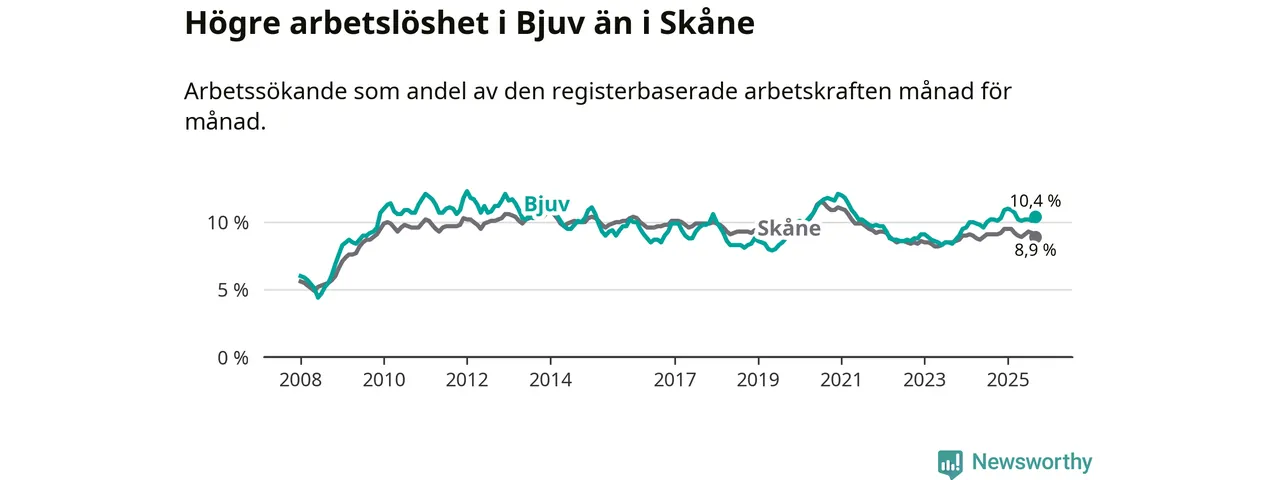 Under september månad rapporterade Bjuvs kommun en total arbetslöshet på 10,4 procent. Det är en ökning jämfört med samma tidpunkt i fjol (+0,2 procentenheter). I Skåne län däremot sjunker arbetslösheten .