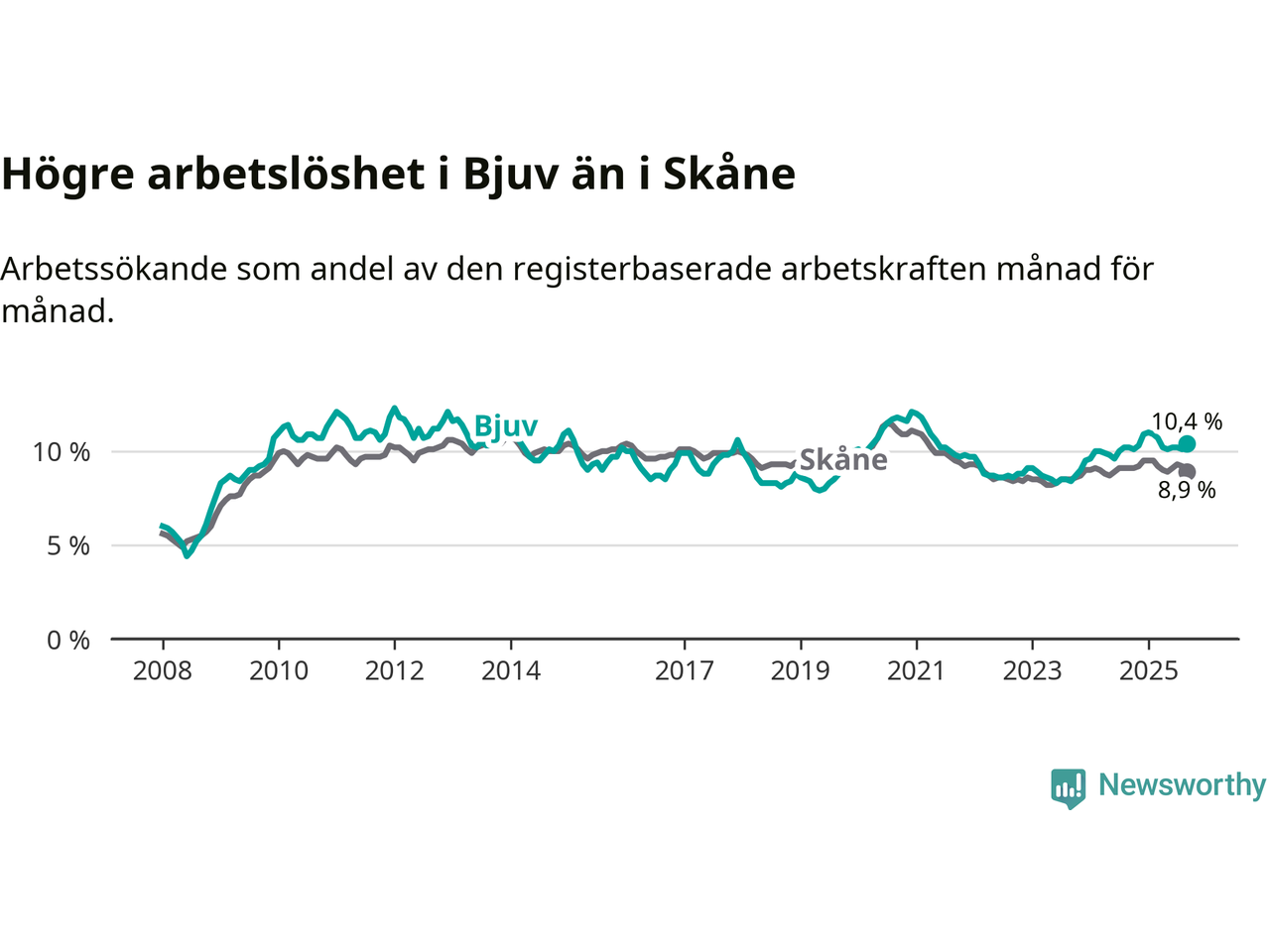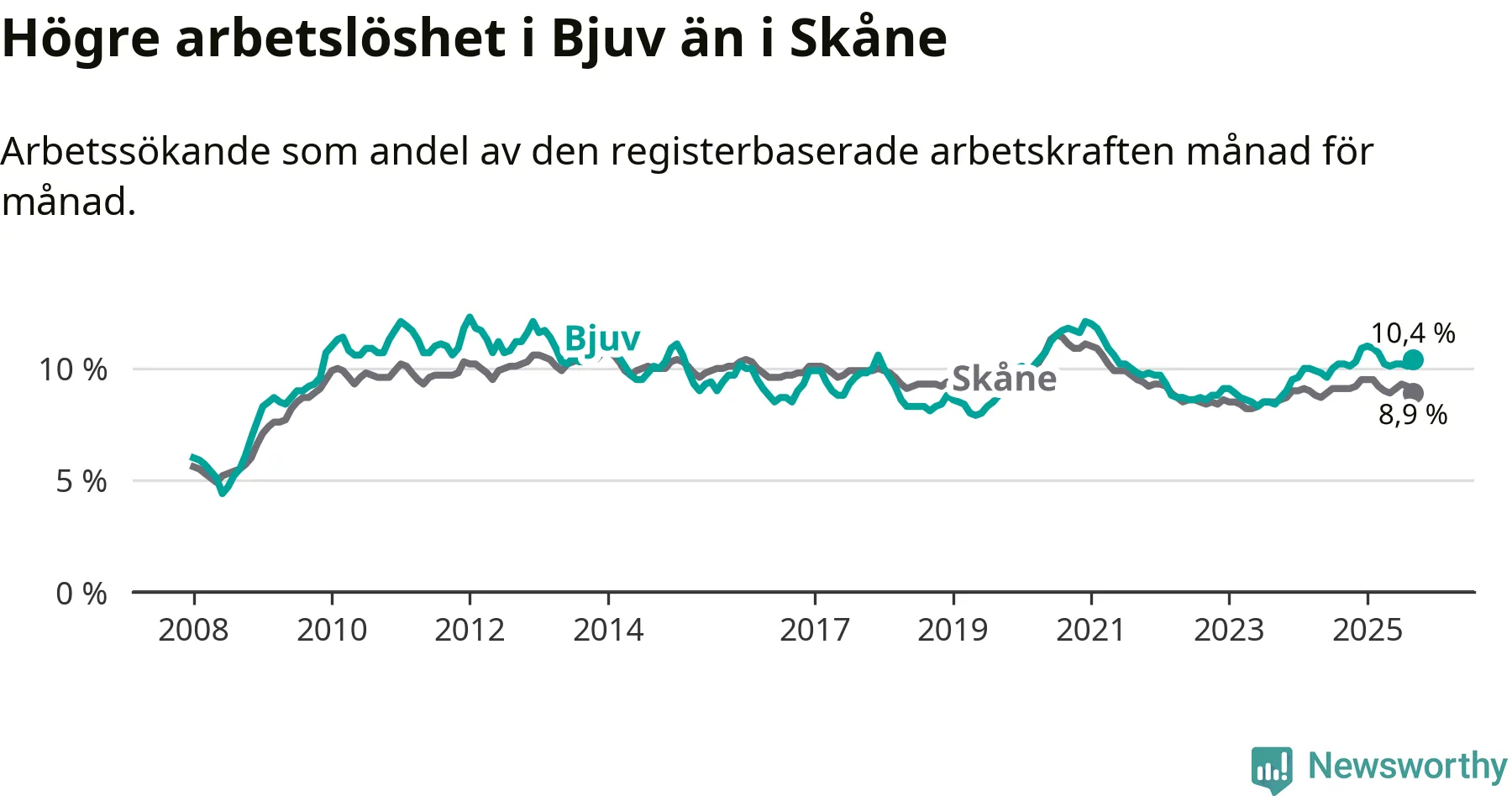 Graf: Arbetslöshet i Bjuvs kommun och Skåne län