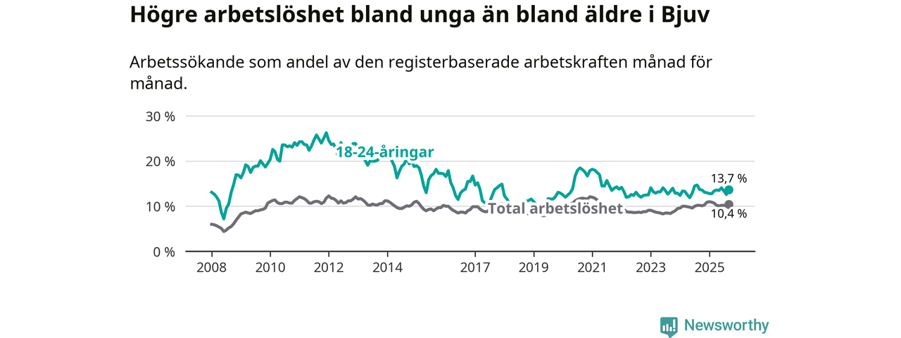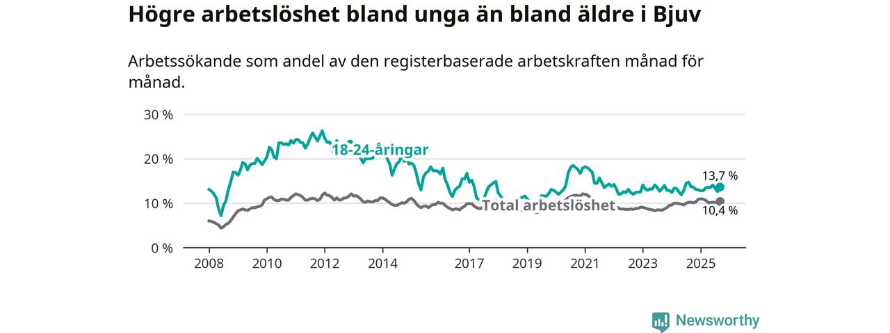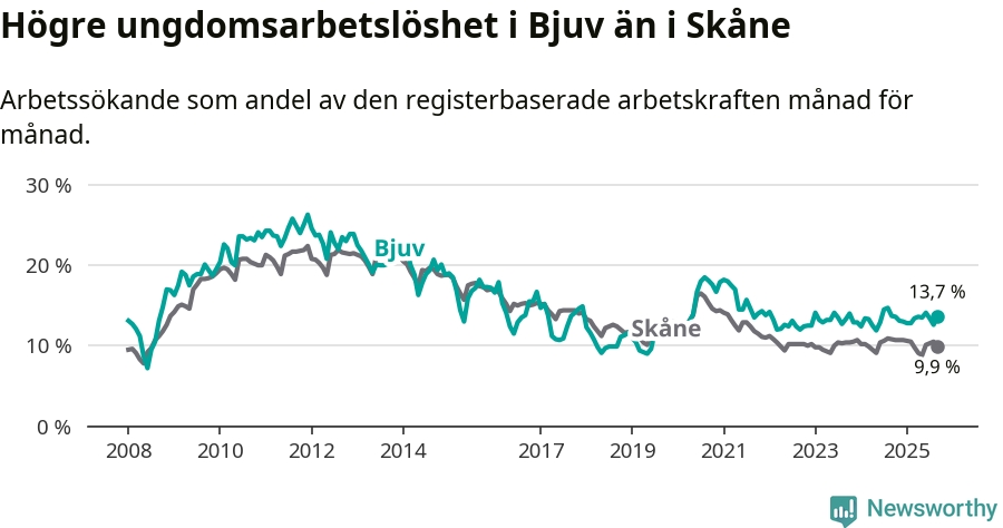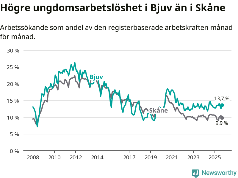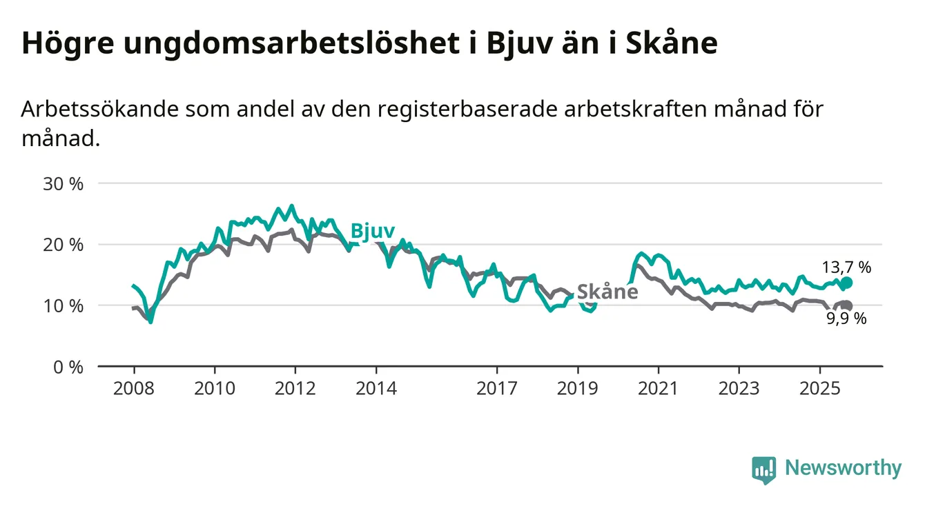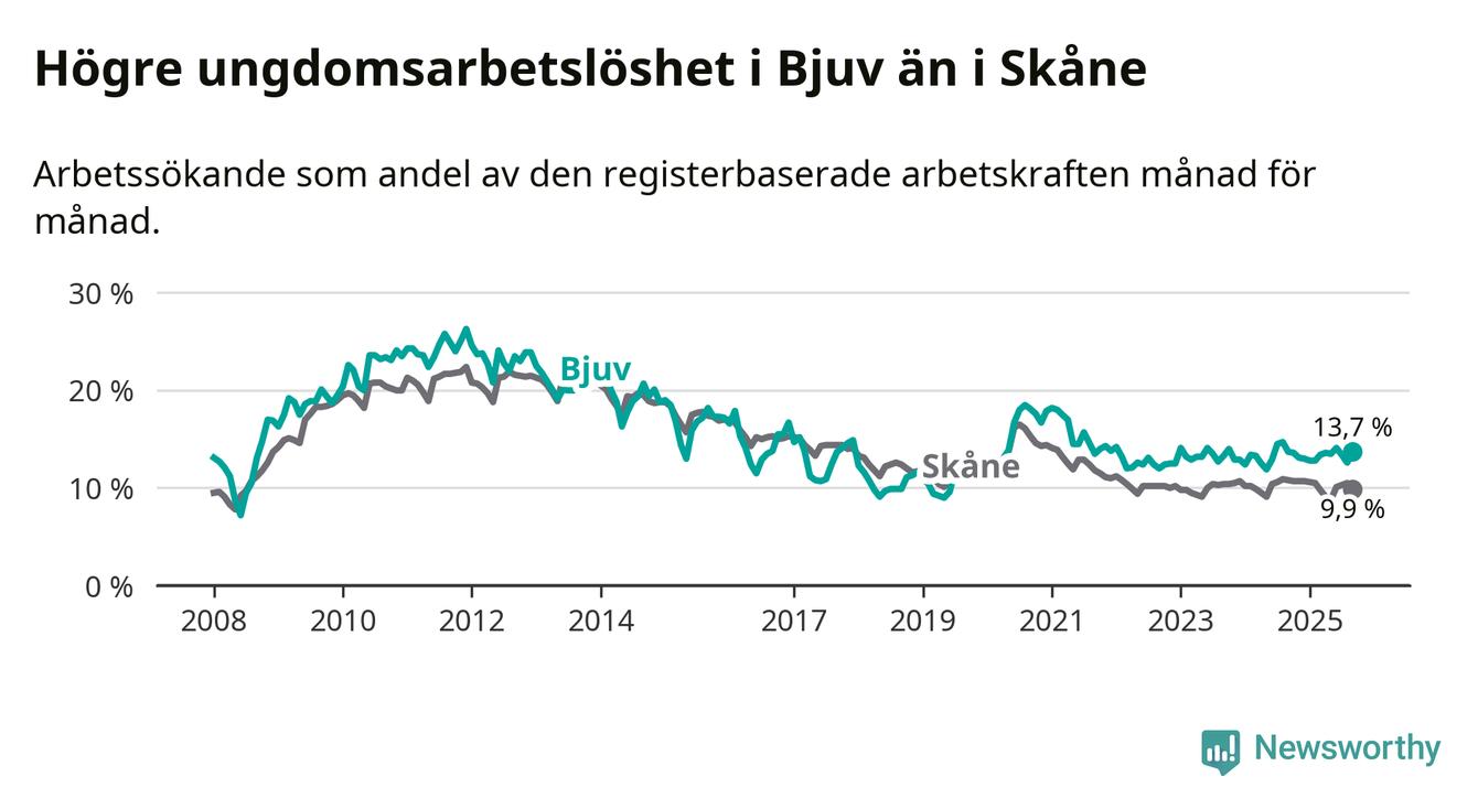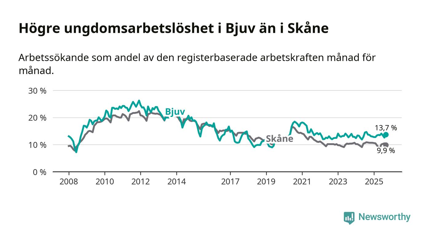 Precis som den totala arbetslösheten ligger ungdomsarbetslösheten i Bjuv högre än i Skåne som helhet. Skillnaden mellan kommunen och länet är 3,8 procentenheter.