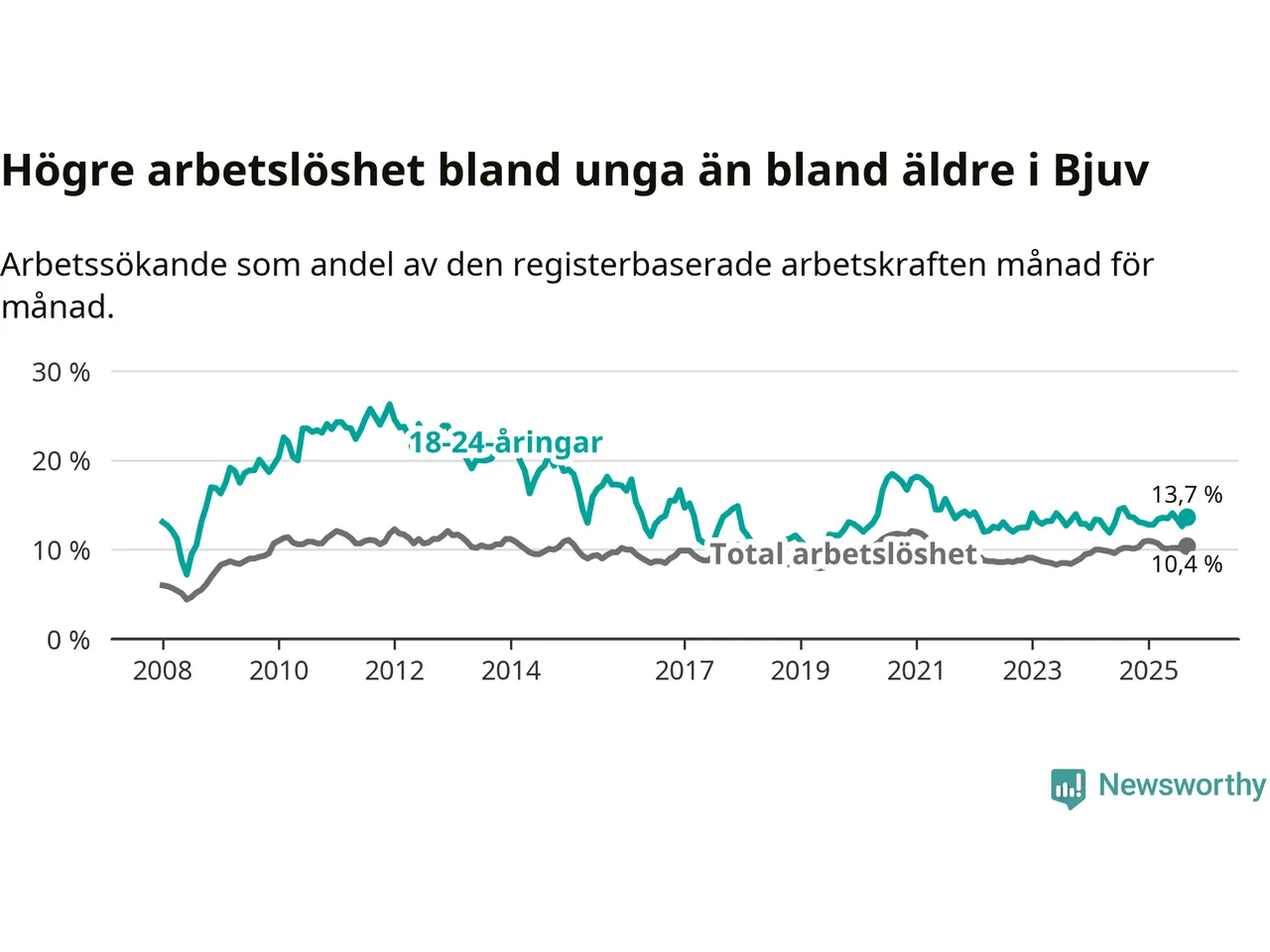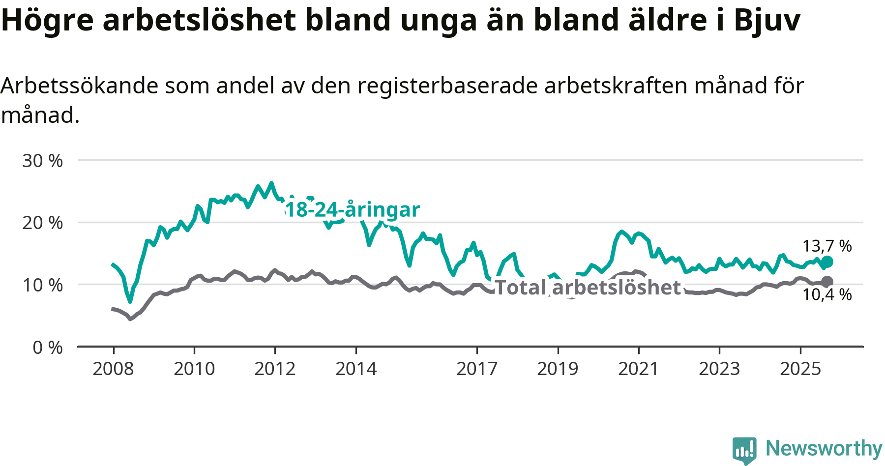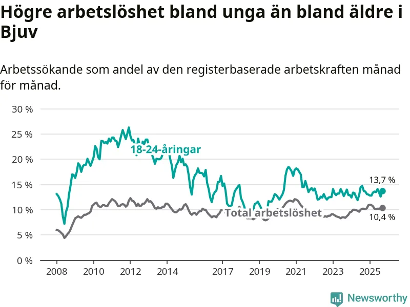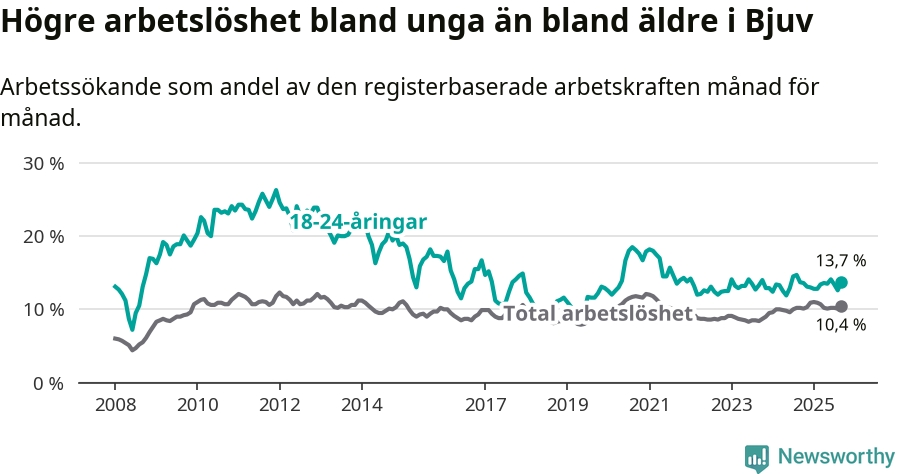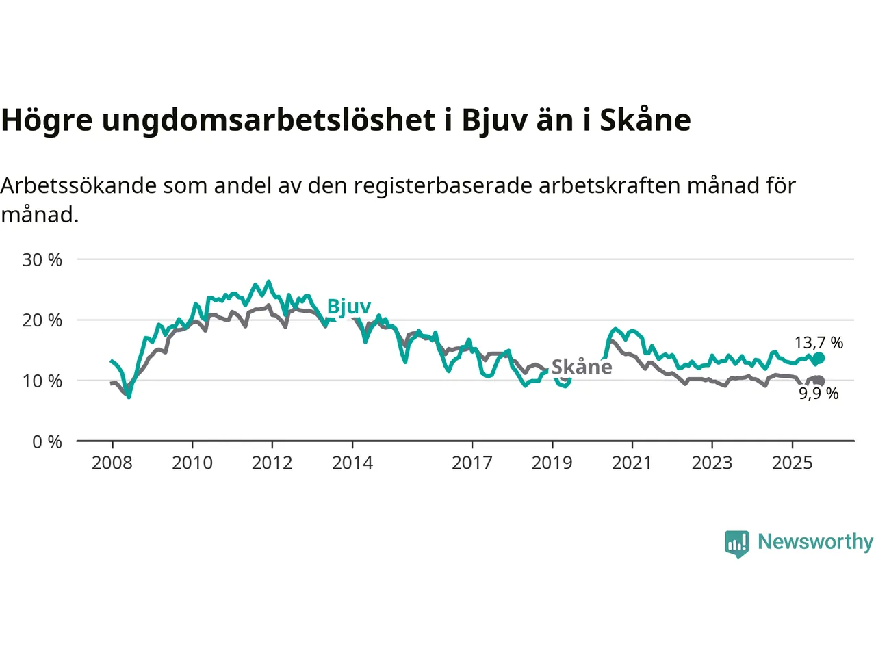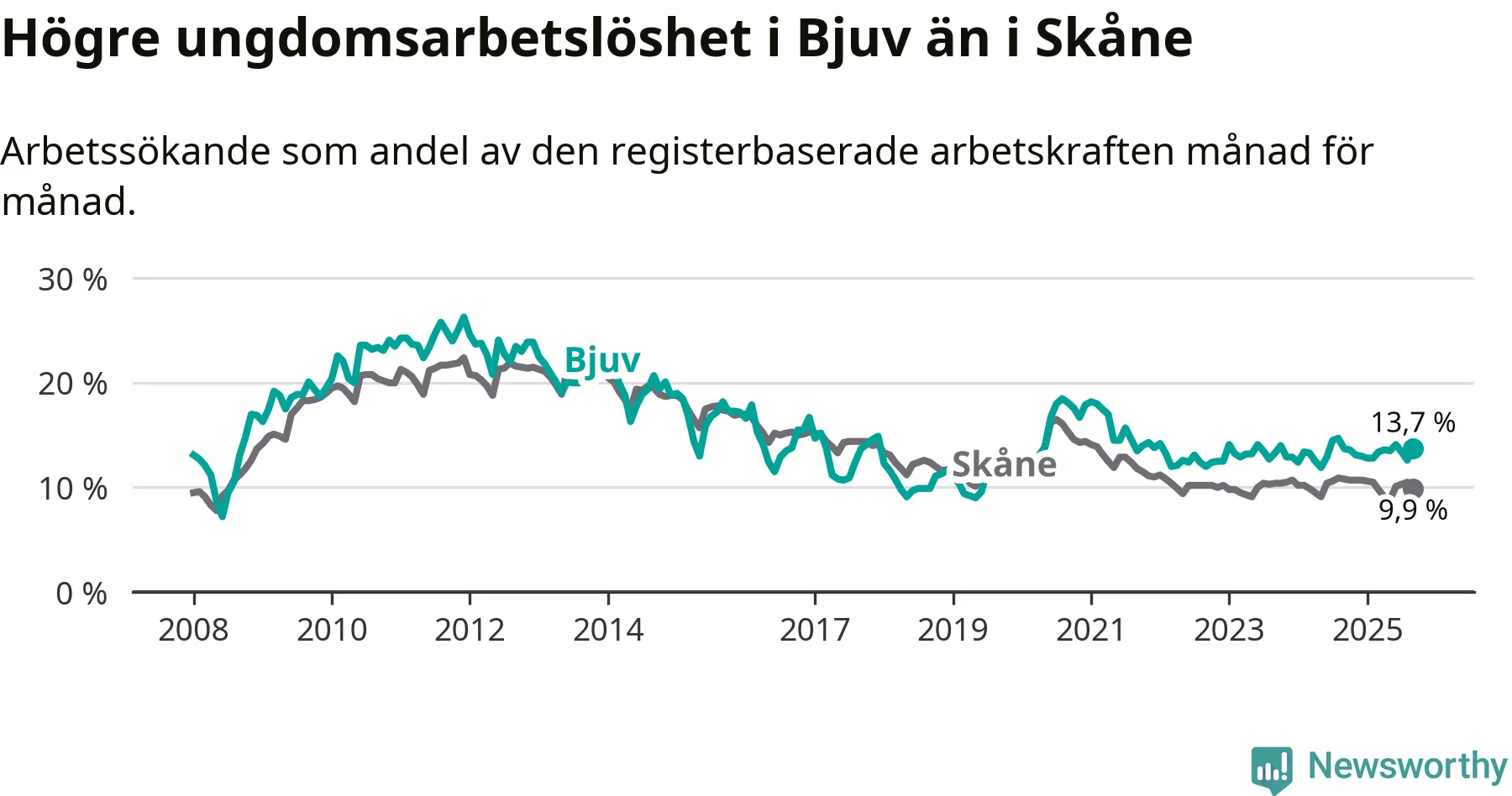 Precis som den totala arbetslösheten ligger ungdomsarbetslösheten i Bjuv högre än i Skåne som helhet. Skillnaden mellan kommunen och länet är 3,8 procentenheter.
