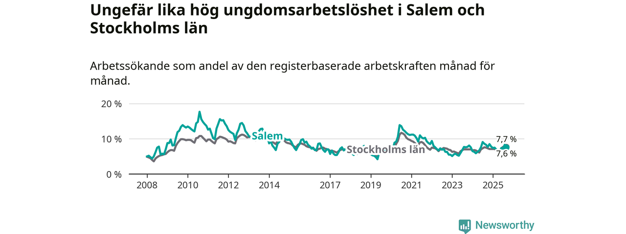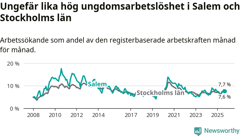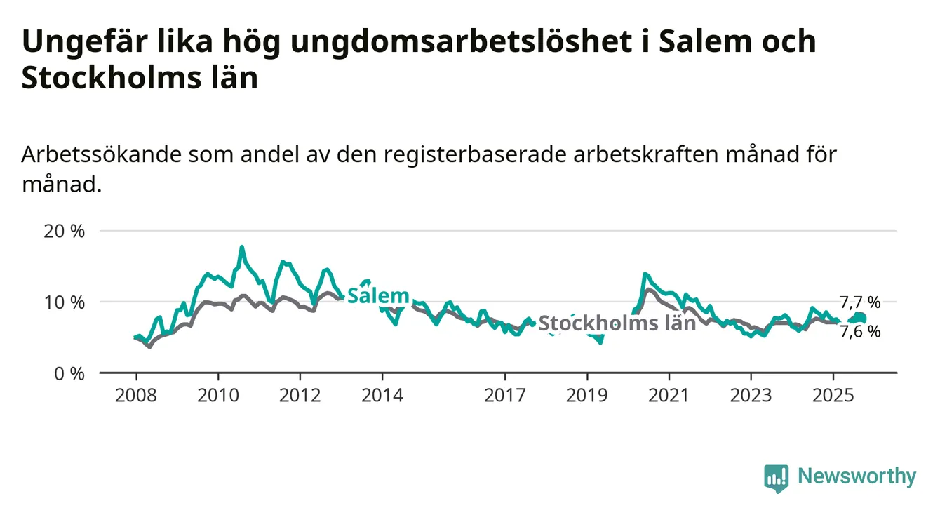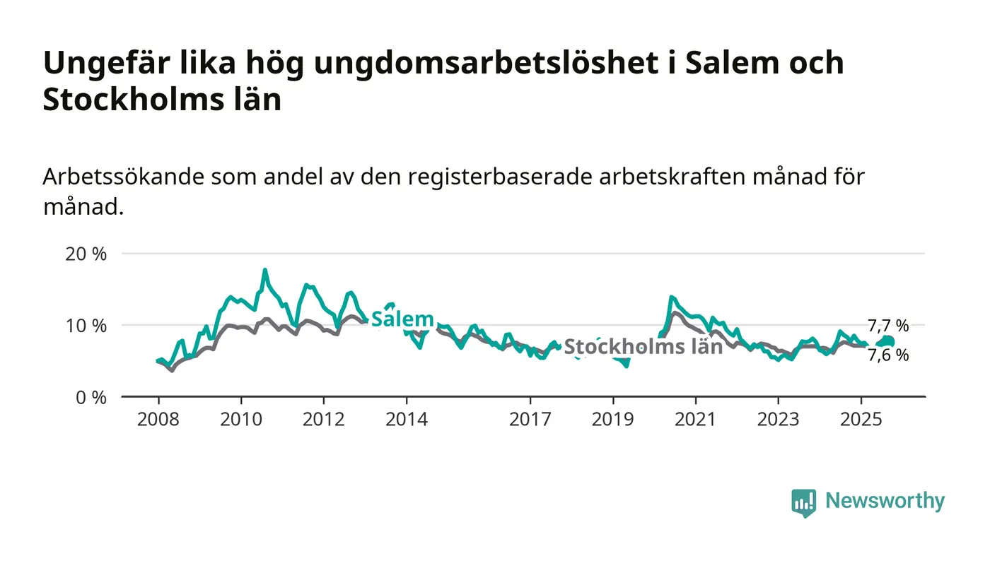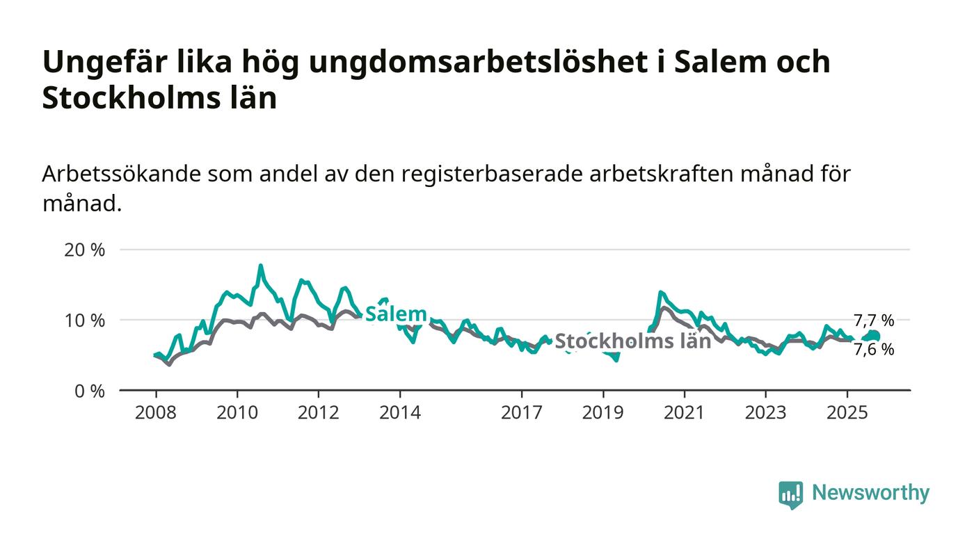 Medan Salem har lägre total arbetslöshet än Stockholms län, ligger ungdomsarbetslösheten på i stort sett samma nivå.