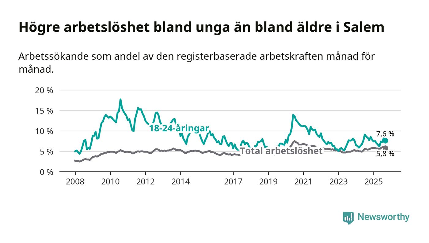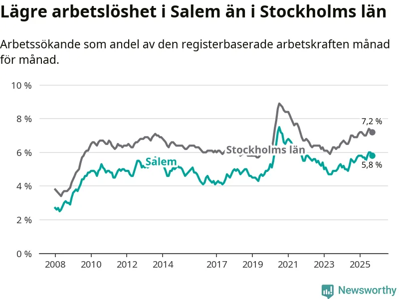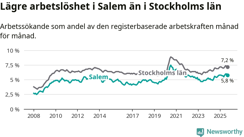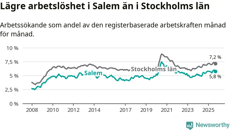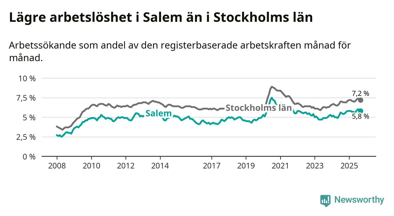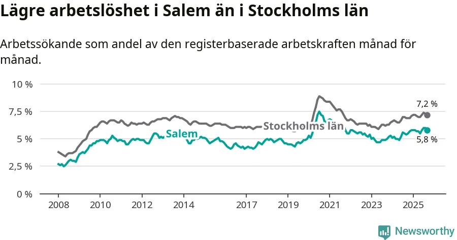 Under september månad rapporterade Salems kommun en total arbetslöshet på 5,8 procent. Det är en ökning jämfört med samma tidpunkt i fjol (+0,4 procentenheter). Även i Stockholms län stiger arbetslösheten .