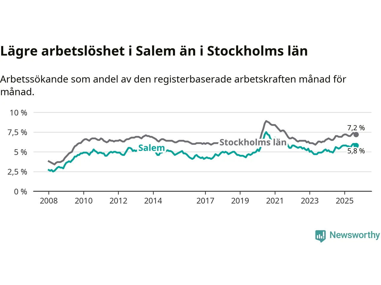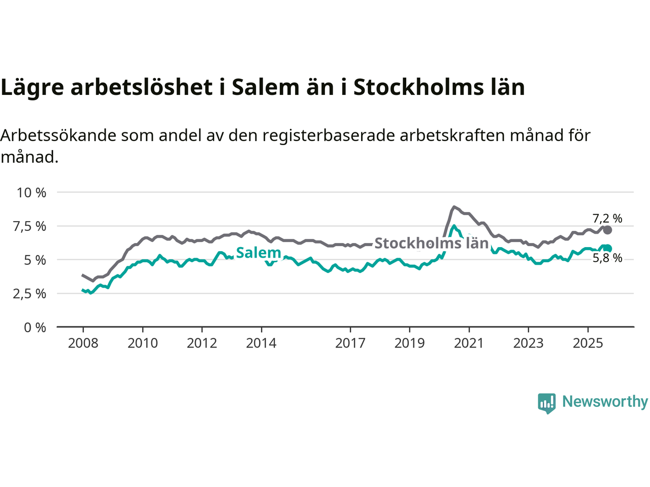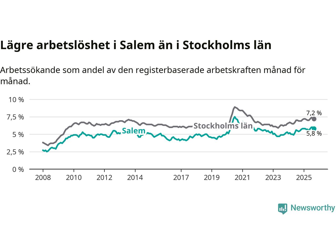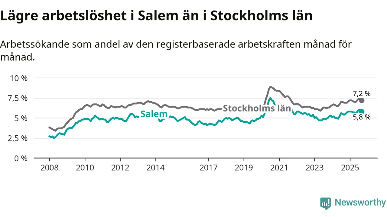 Graf: Arbetslöshet i Salems kommun och Stockholms län