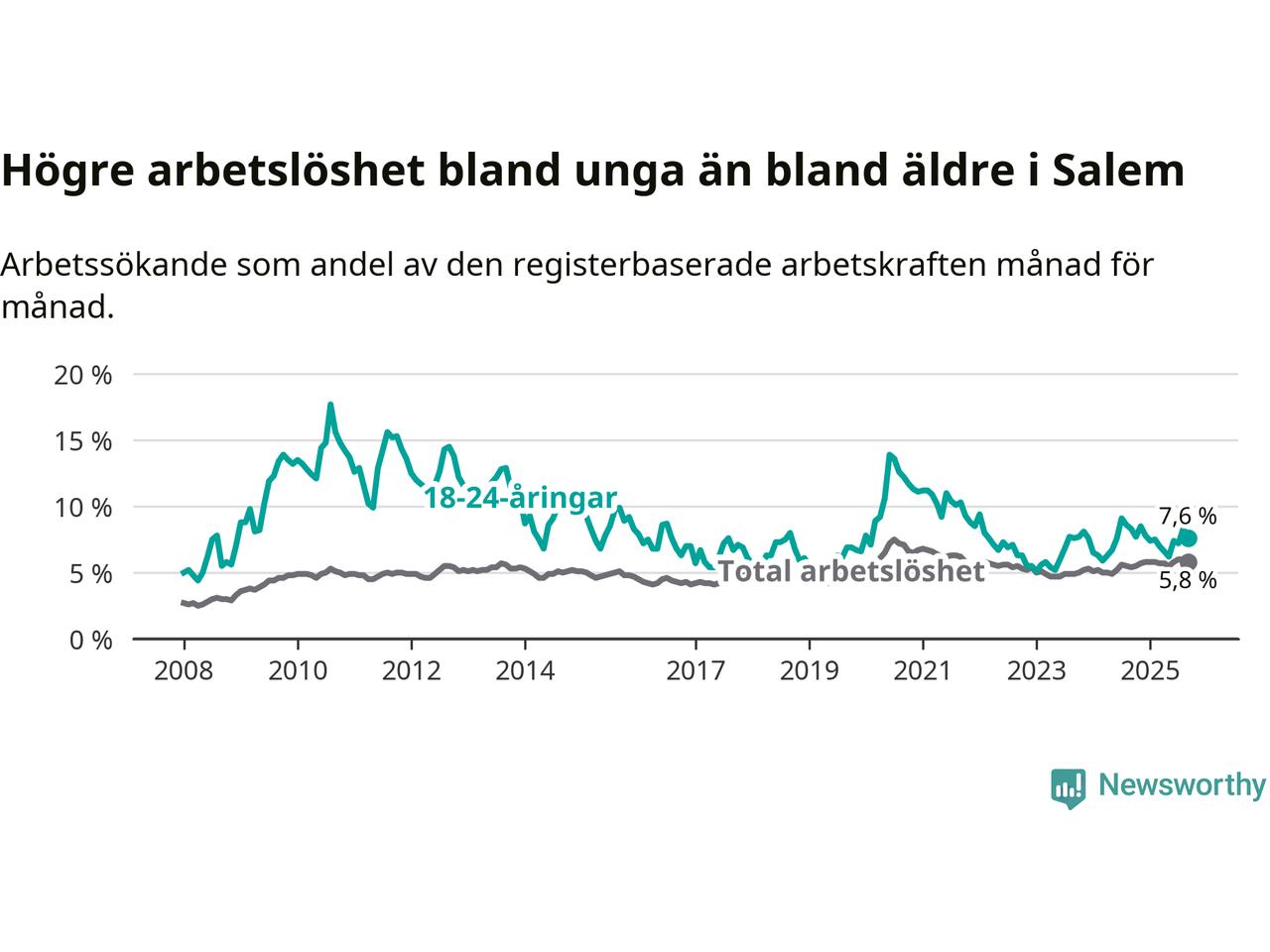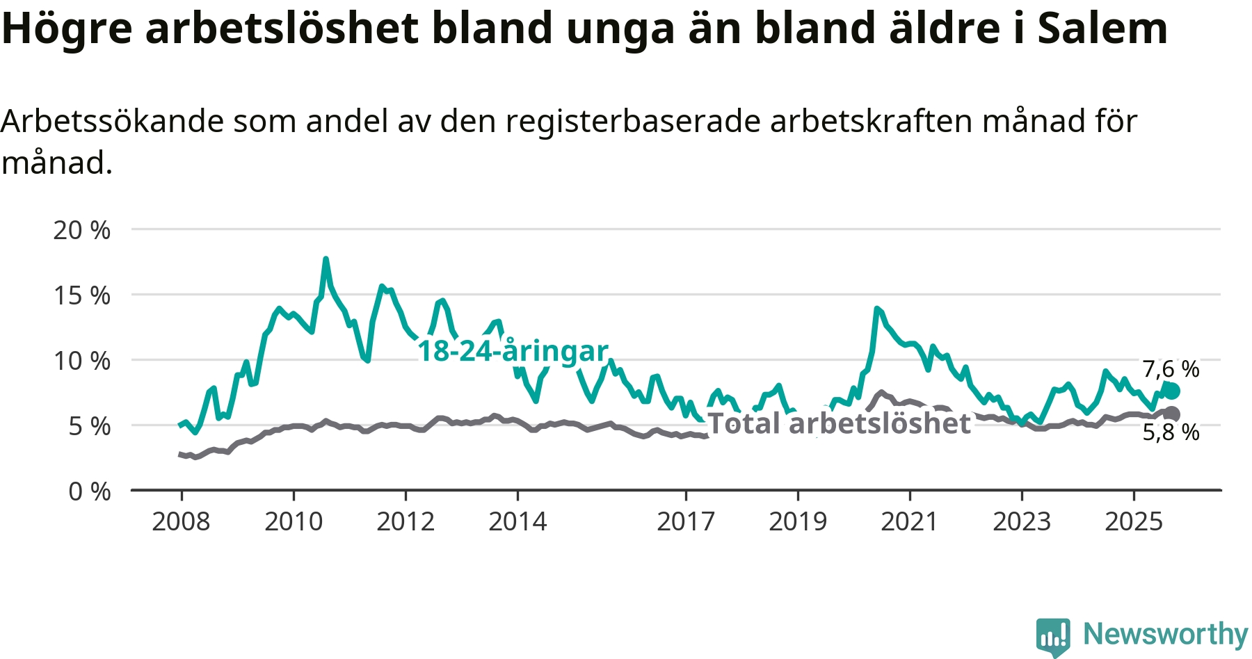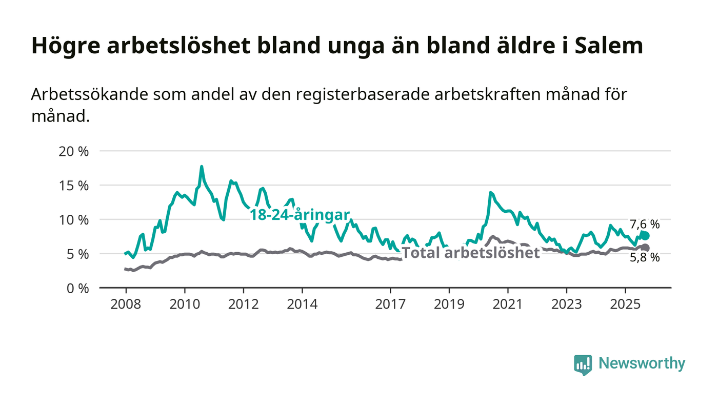 Graf: Skillnad i arbetslöshet mellan unga och hela befolkningen i Salems kommun