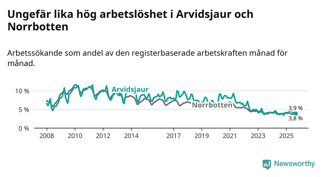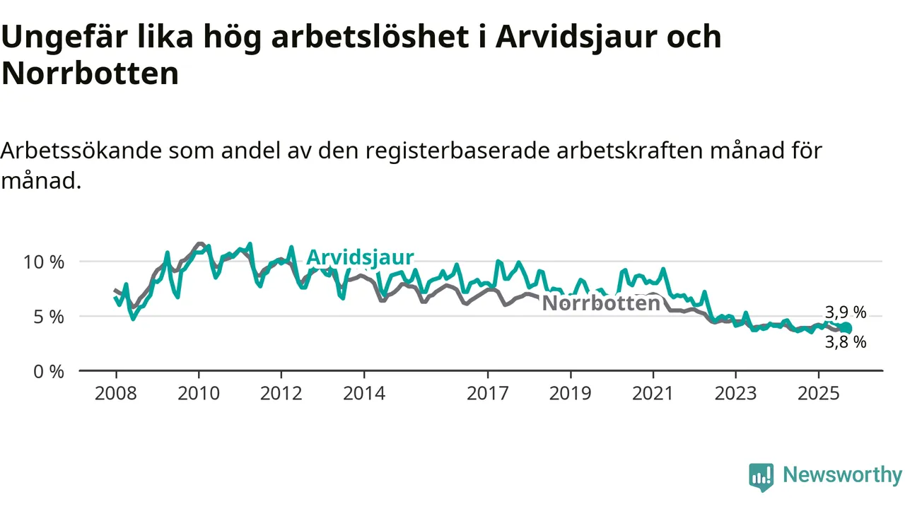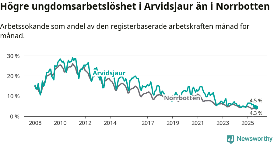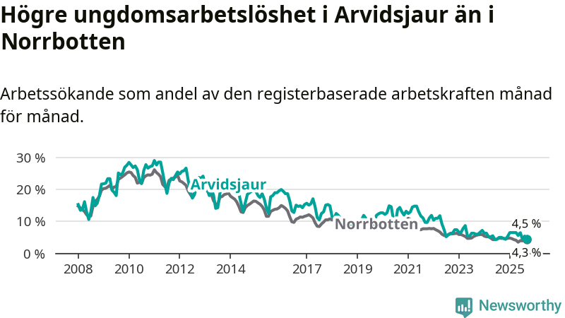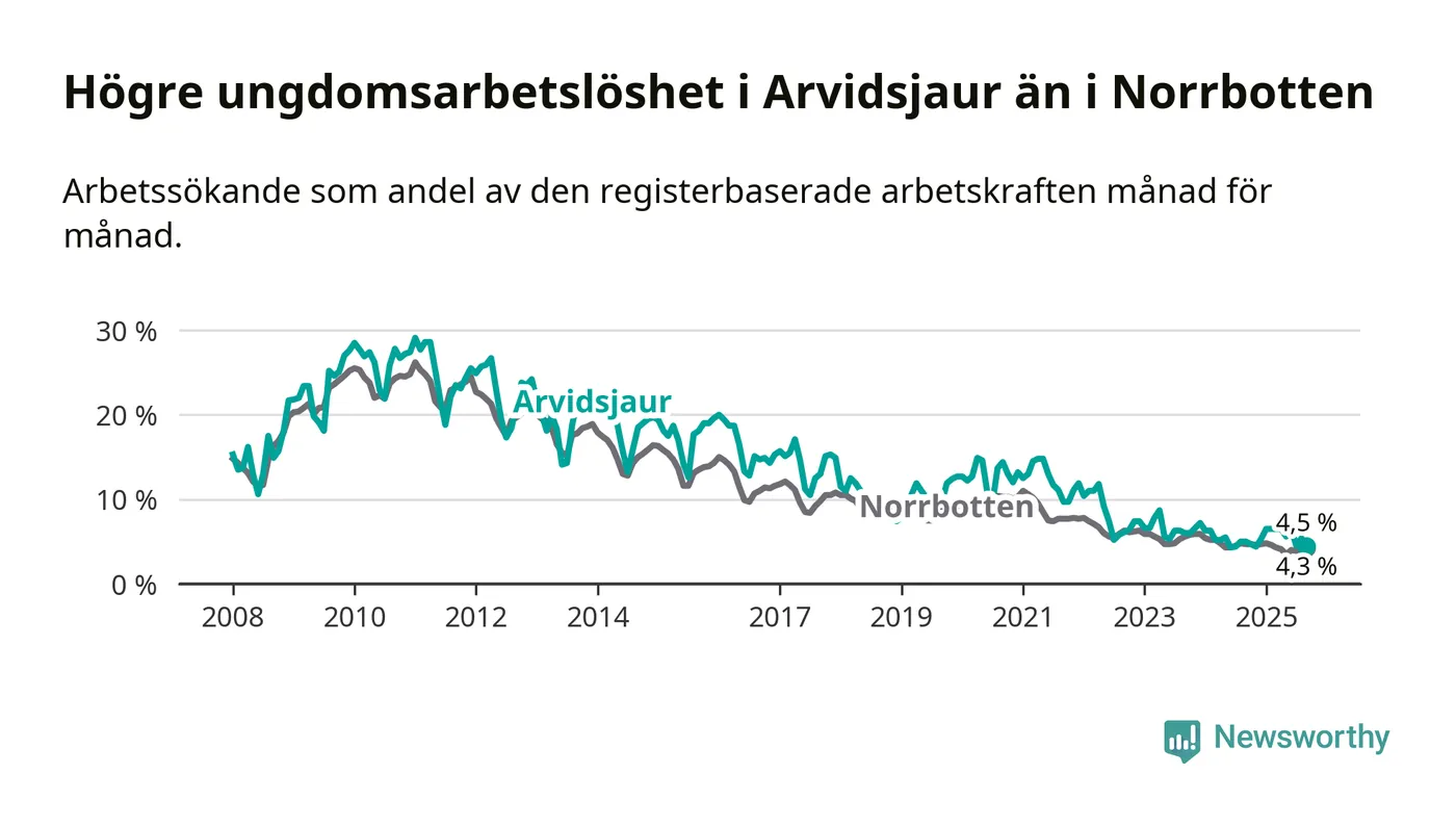 Medan Arvidsjaur har ungefär samma total arbetslöshet som Norrbotten, ligger ungdomsarbetslösheten 0,2 procentenheter högre i Arvidsjaur.