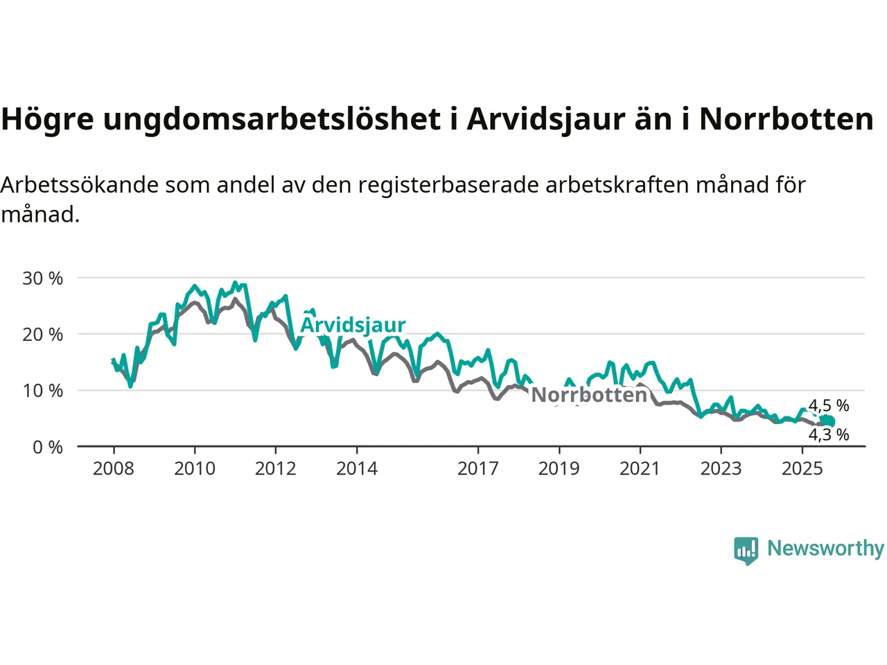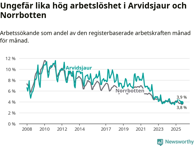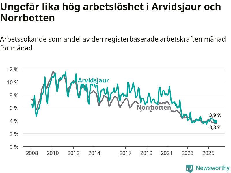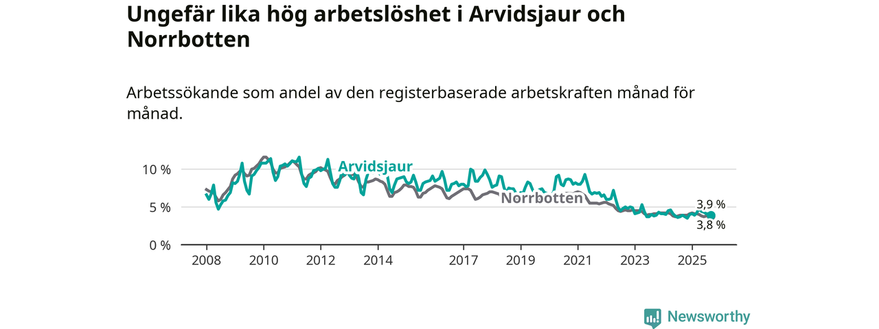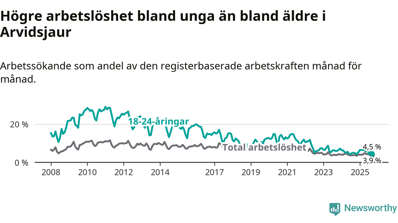 Medan Arvidsjaur har ungefär samma total arbetslöshet som Norrbotten, ligger ungdomsarbetslösheten 0,2 procentenheter högre i Arvidsjaur.