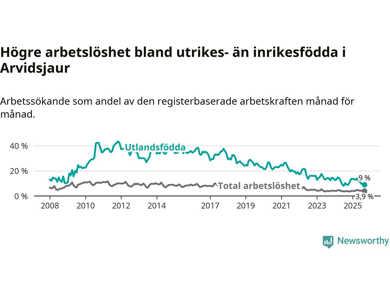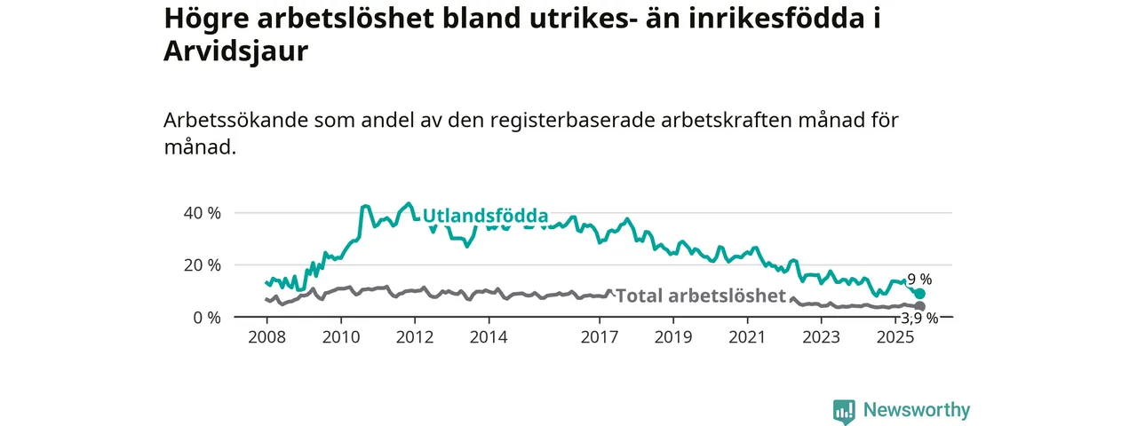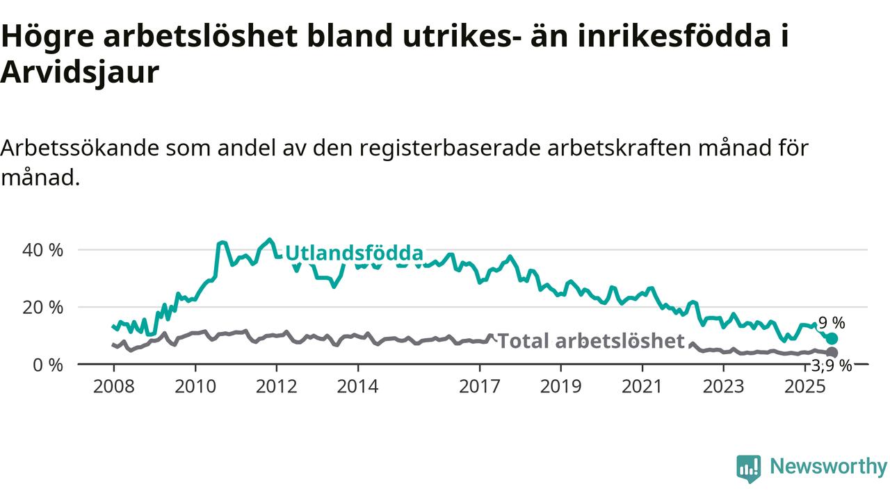 Arbetslösheten bland utlandsfödda var 9,0 procent i Arvidsjaur under september månad, motsvarande 31 av 344 personer. Det är 0,1 procentenheter fler än vid samma tidpunkt i fjol (±0 om man räknar personer). Den senaste månadens uppgång innebär ett trendbrott. Under de ett föregående månaderna hade arbetslösheten bland utlandsfödda varit lägre än motsvarande tidpunkt året innan.