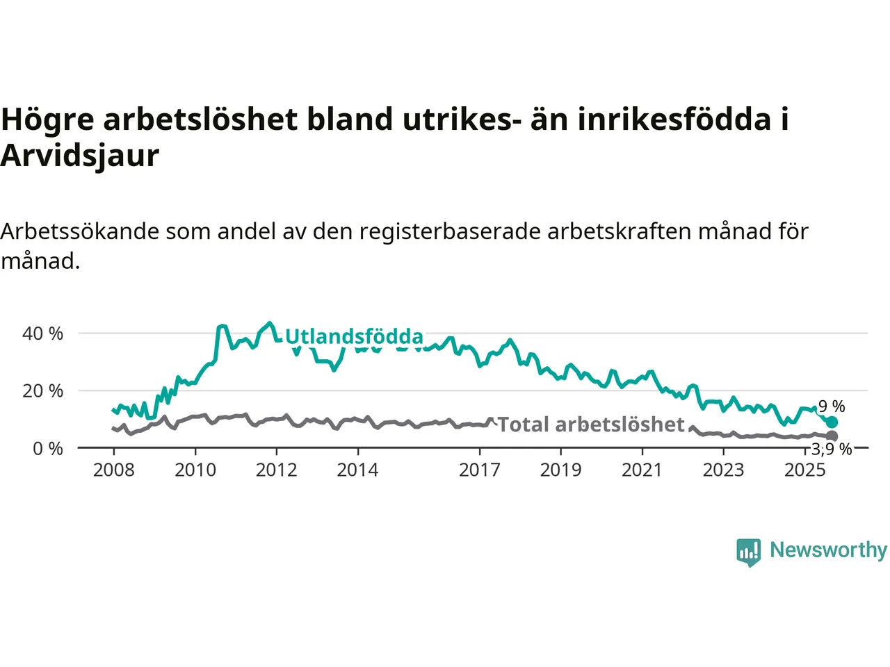 Bland utlandsfödda | 9,0 % | +0,1 % ▲ | 9,2 % | −0,7 % ▼ | 14,8 % | −0,4 % ▼ |