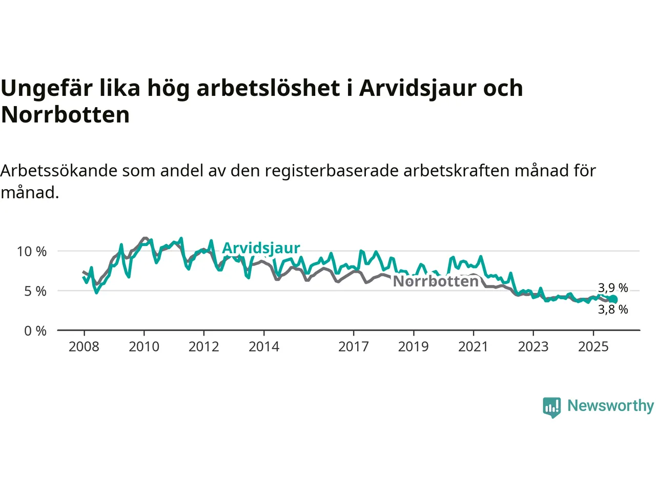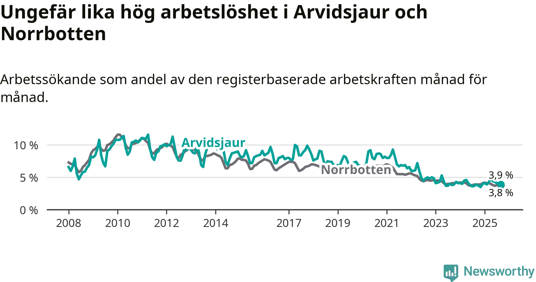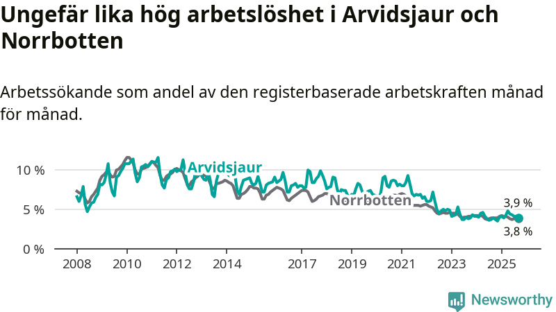 I de flesta andra kommuner i länet går arbetslösheten nedåt. Störst är minskningen i Arjeplog, där arbetslösheten sjunker med 0,6 procentenheter. I tabellen längre ner ser du utvecklingen i samtliga kommuner i länet.
