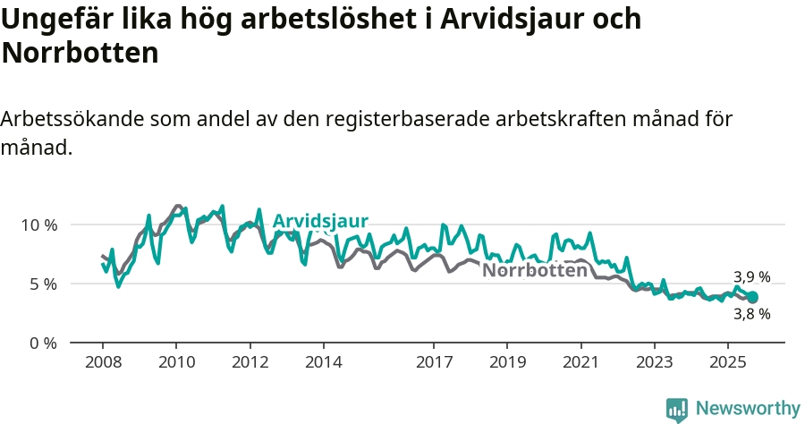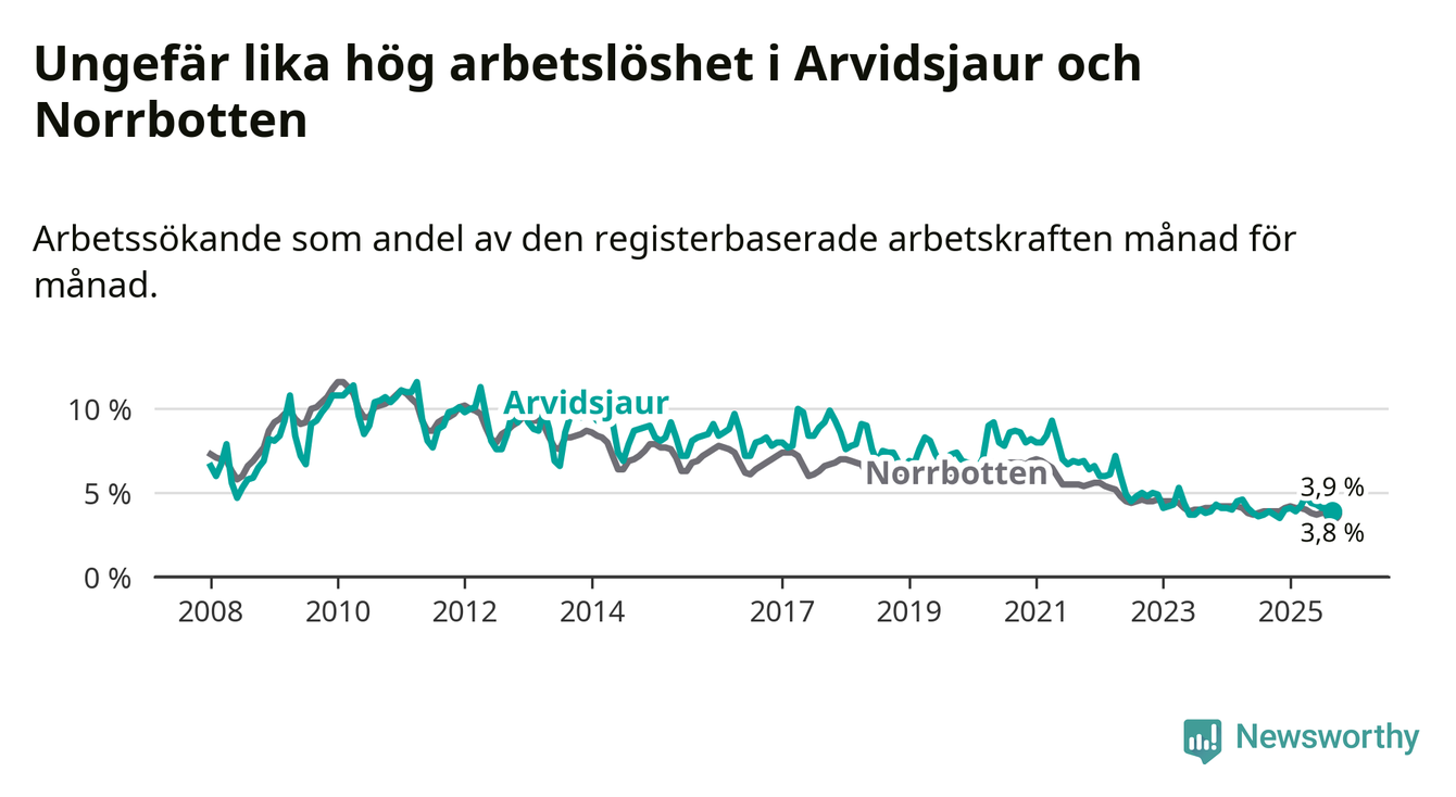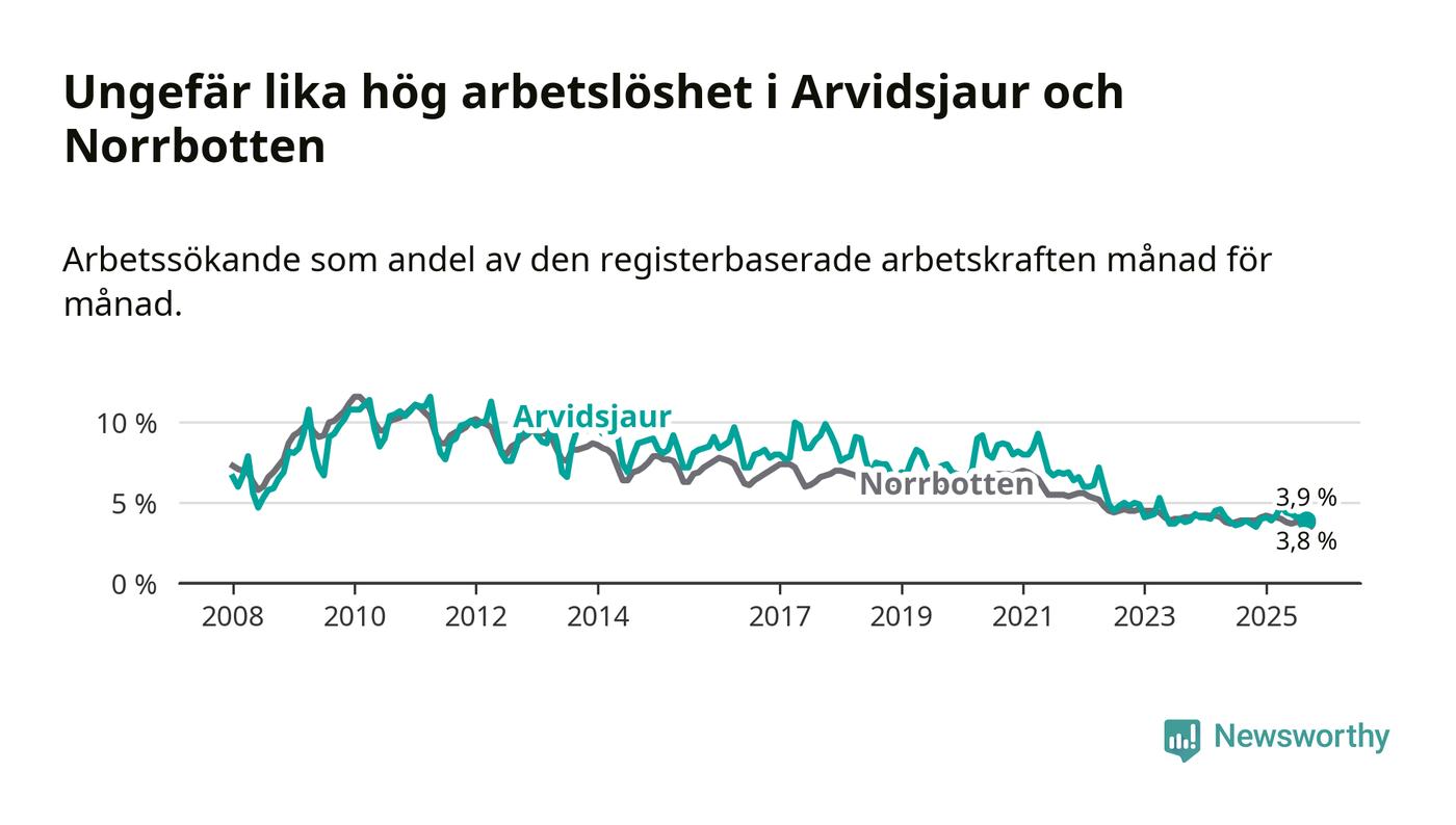 Arbetslösheten i Arvidsjaur ligger därmed kvar på i stort sett samma nivå som i hela Norrbottens län. Gällivare och Kiruna har den lägsta arbetslösheten i länet (2,6 procent), medan Haparanda och Överkalix har den högsta (6,4 procent). För att Arvidsjaur skulle komma ner i samma arbetslöshetsnivå som Gällivare och Kiruna skulle 37 personer behöva sysselsättas.