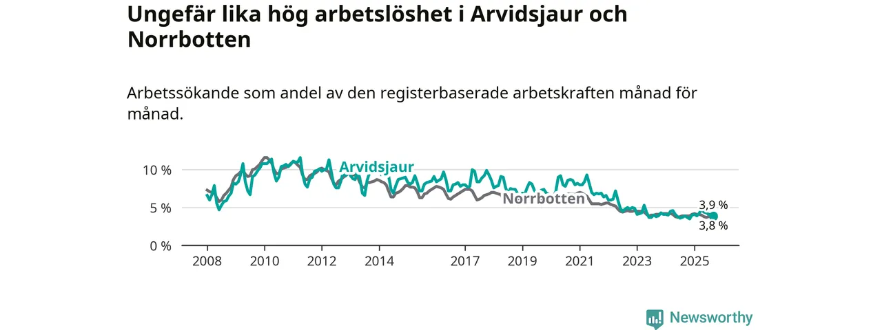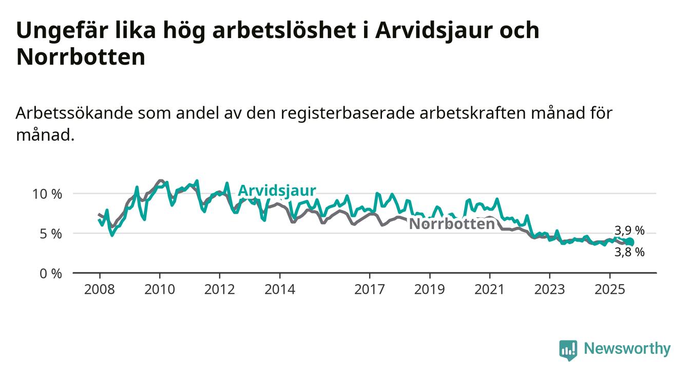 Under september månad rapporterade Arvidsjaurs kommun en total arbetslöshet på 3,9 procent. Det är i samma nivå som i september i fjol. I Norrbottens län däremot sjunker arbetslösheten något
