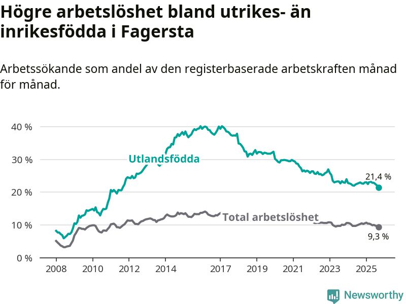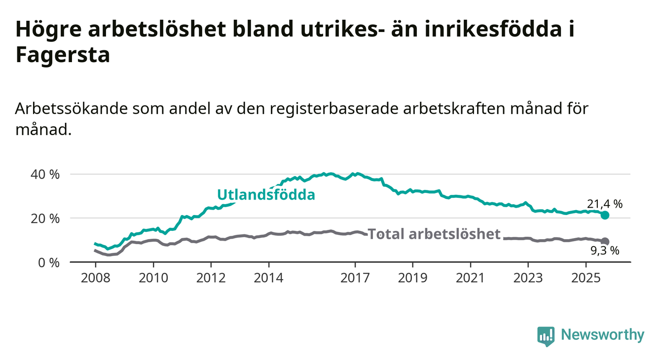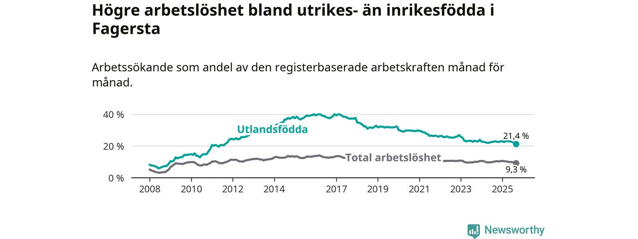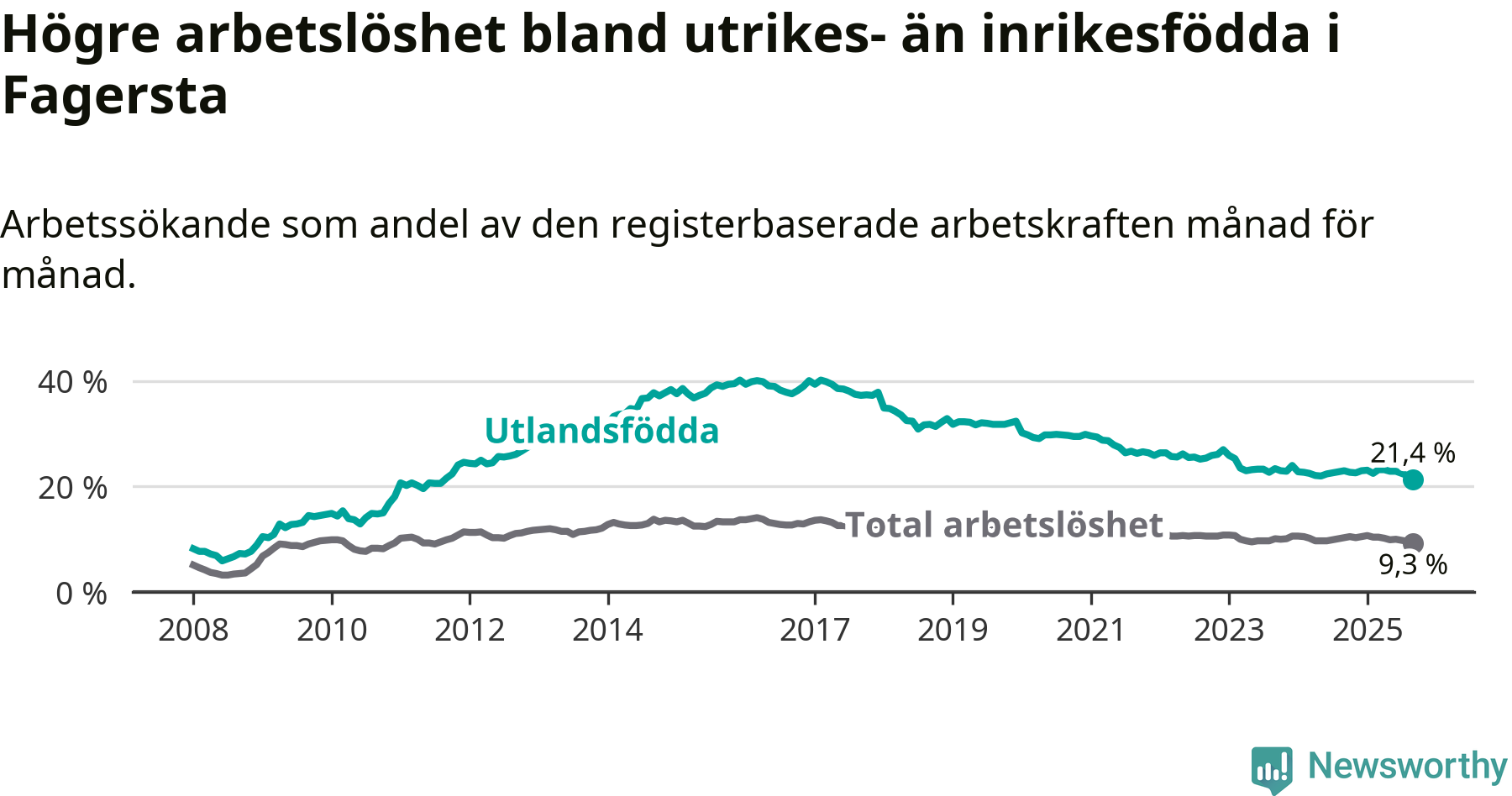 Skillnaden i arbetslöshet mellan utrikesfödda och hela befolkningen är 12,1 procentenheter i Fagersta. Det är en mindre skillnad än för ett år sedan (−0,6 procentenheter).