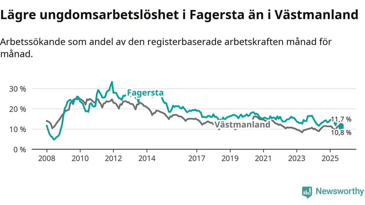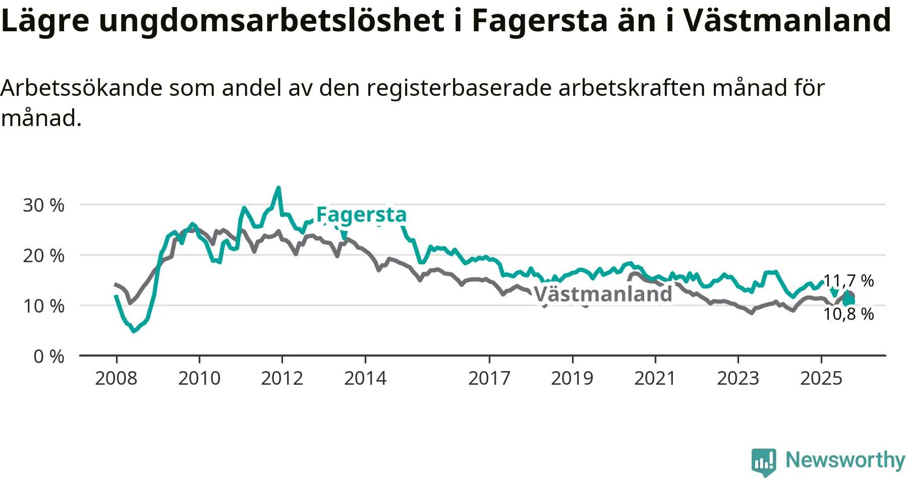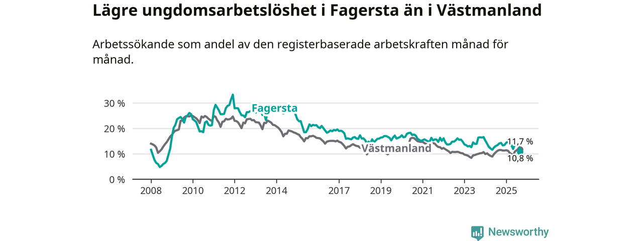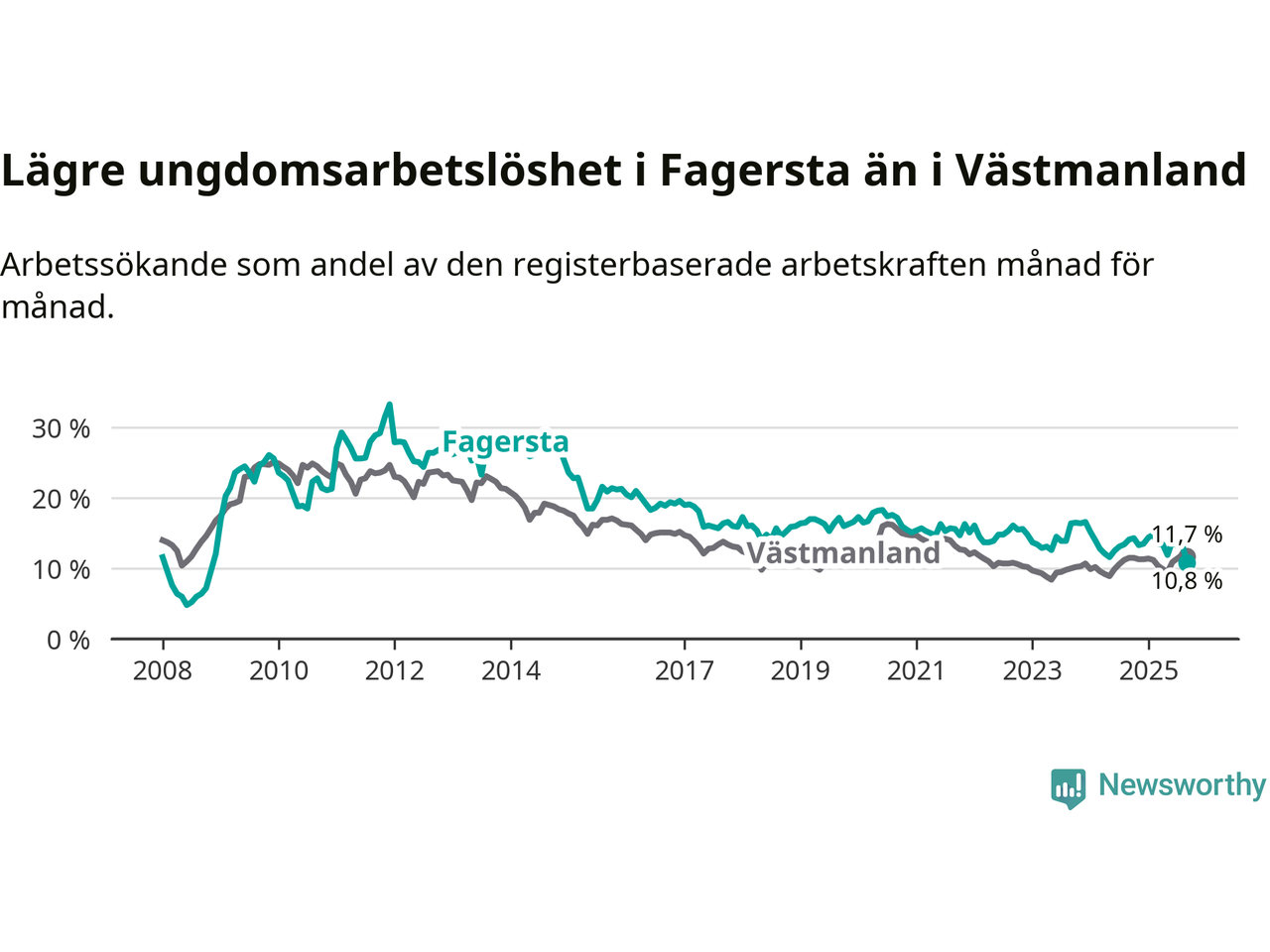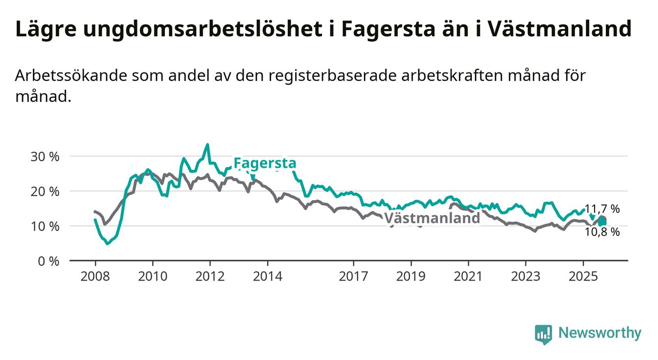 Medan Fagersta har högre total arbetslöshet än Västmanland, ligger ungdomsarbetslösheten 0,9 procentenheter lägre i Fagersta.