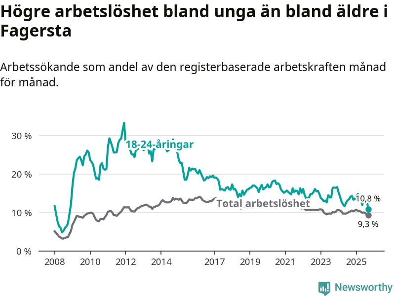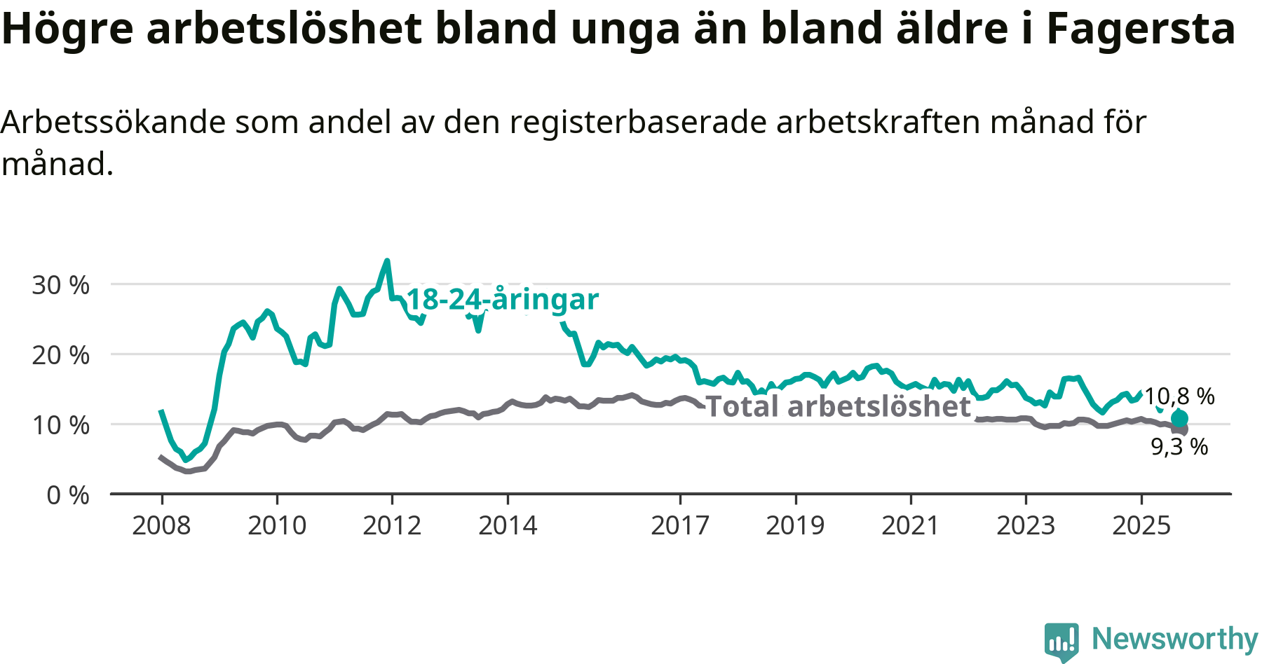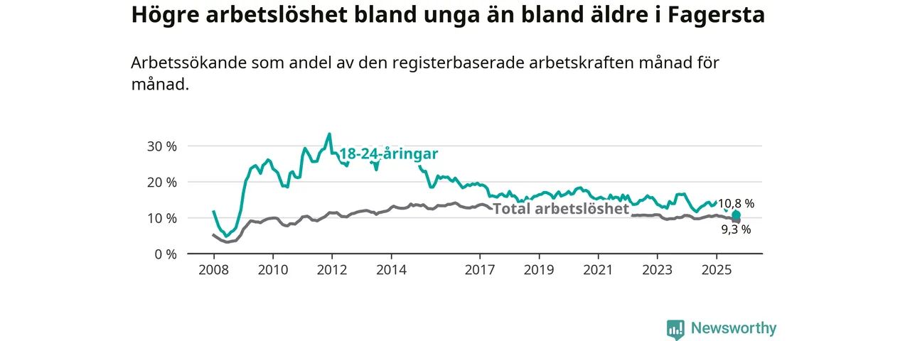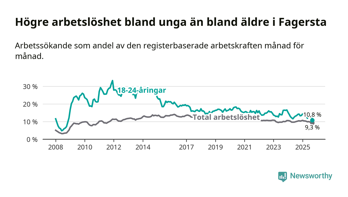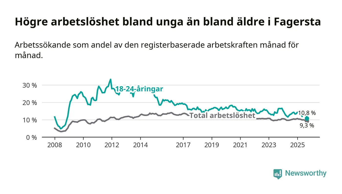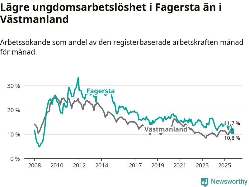 Medan Fagersta har högre total arbetslöshet än Västmanland, ligger ungdomsarbetslösheten 0,9 procentenheter lägre i Fagersta.