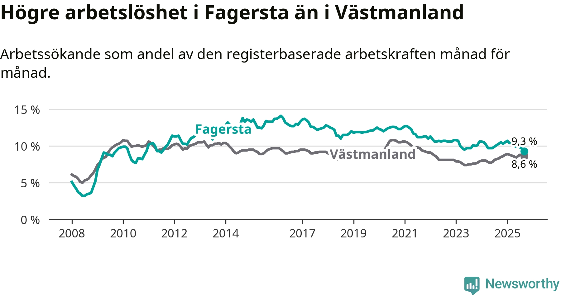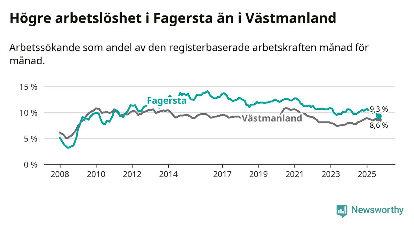 Under september månad rapporterade Fagersta kommun en total arbetslöshet på 9,3 procent. Det är en minskning jämfört med samma tidpunkt i fjol (−1,0 procentenheter). I Västmanlands län däremot stiger arbetslösheten .