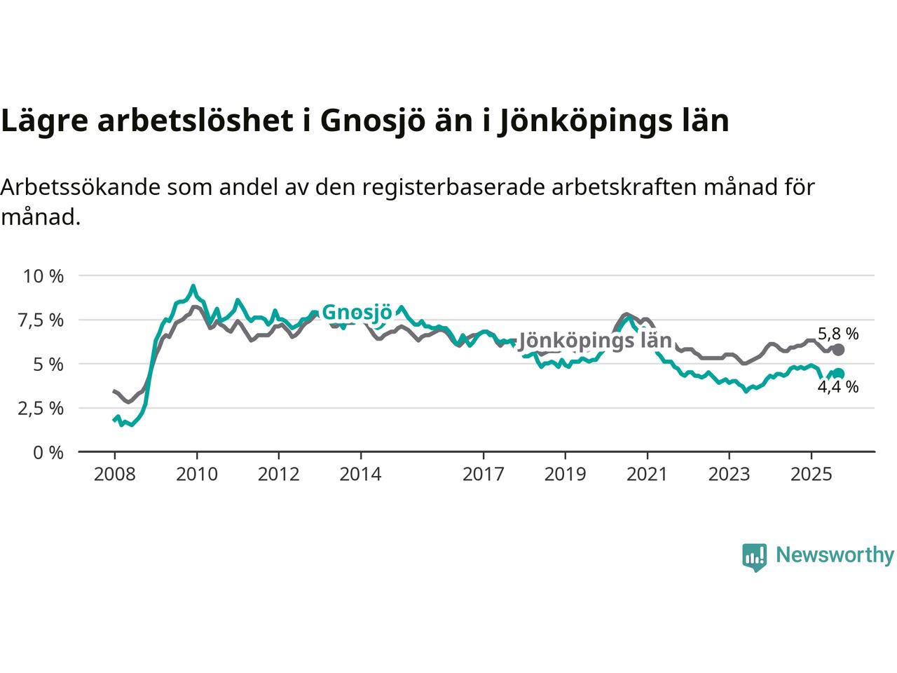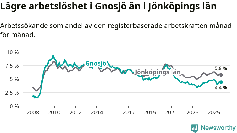 Gnosjö hade redan tidigare lägre arbetslöshet än snittet i hela Jönköpings län och nu växer klyftan (4,4 procent i kommunen, jämfört med 5,8 procent i hela länet). Habo har den lägsta arbetslösheten i länet (3,6 procent), medan Nässjö har den högsta (7,7 procent). För att Gnosjö skulle komma ner i samma arbetslöshetsnivå som Habo skulle 37 personer behöva sysselsättas.