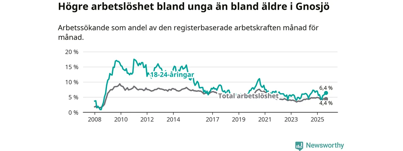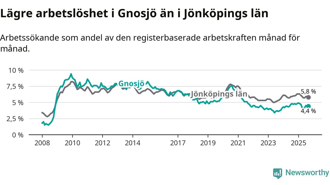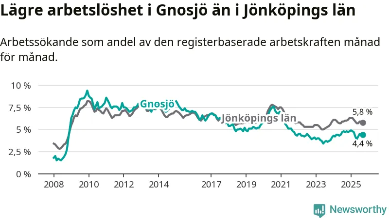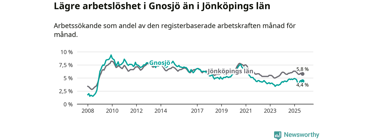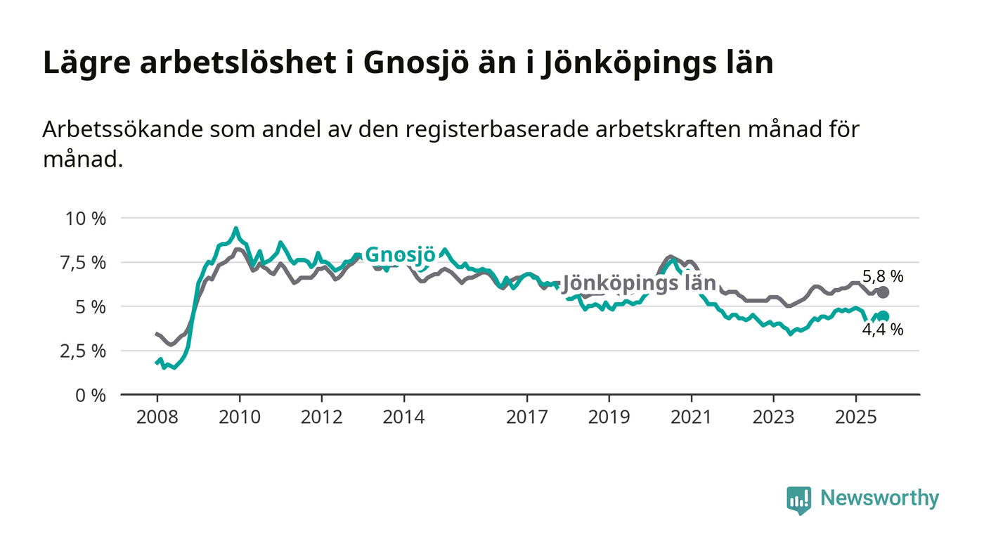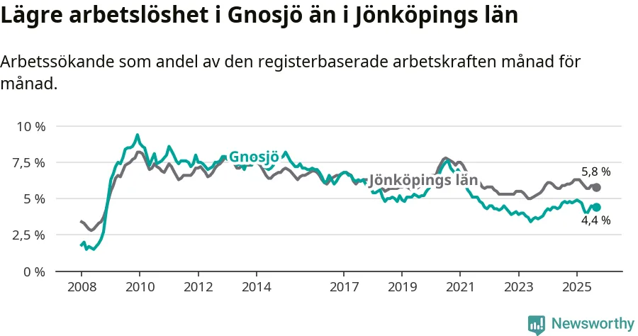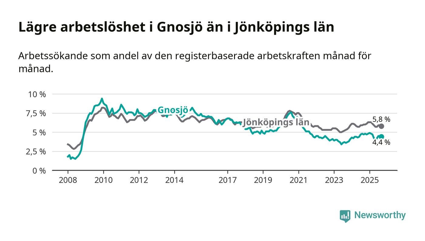 Under september månad rapporterade Gnosjö kommun en total arbetslöshet på 4,4 procent. Det är en minskning jämfört med samma tidpunkt i fjol (−0,3 procentenheter). Även i Jönköpings län sjunker arbetslösheten något.
