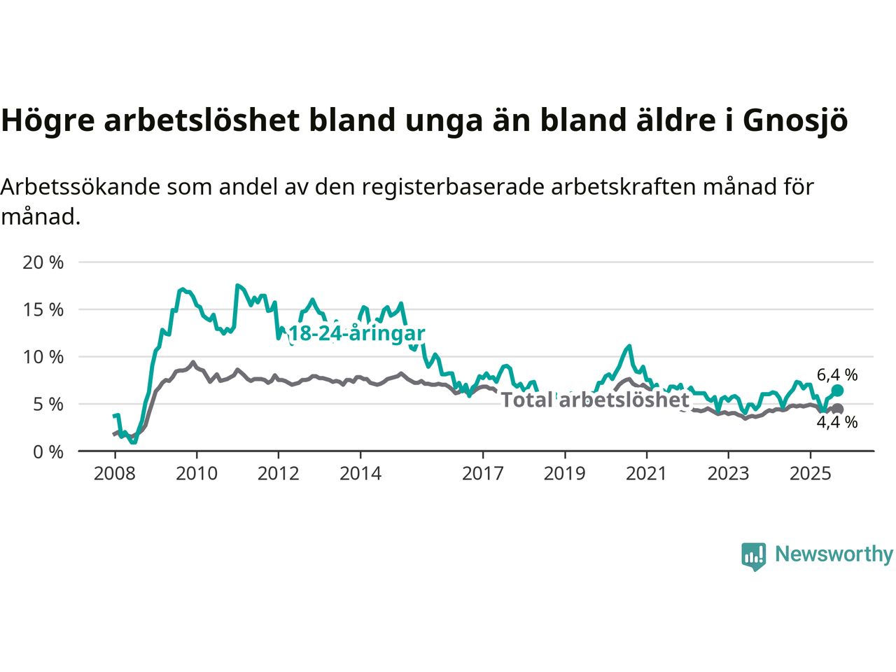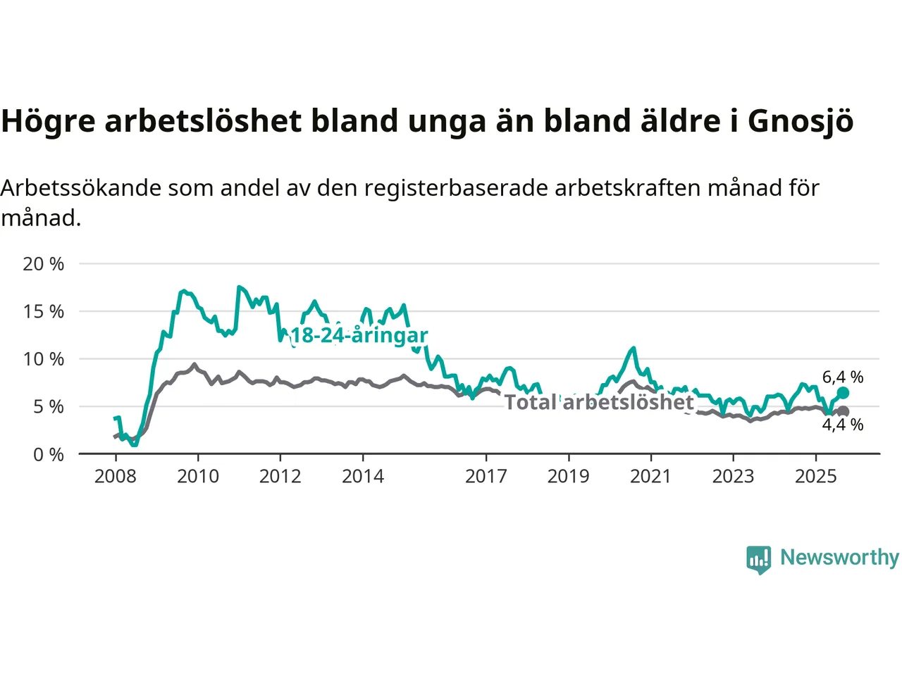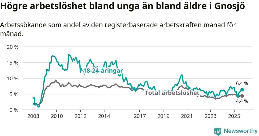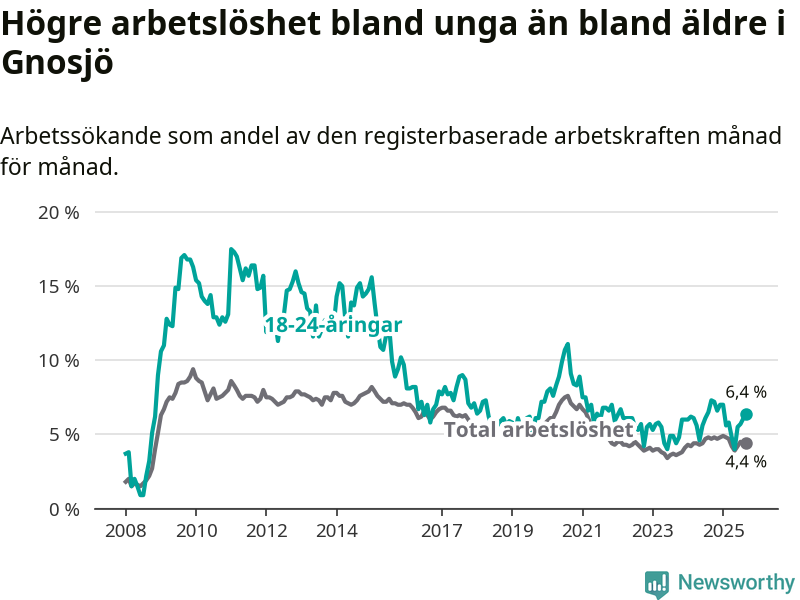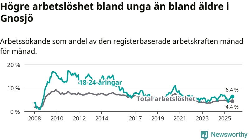 I och med den senaste månadens nedgång har de ungas arbetslöshet i Gnosjö sjunkit åtta månader i följd (ner från 7,0 procent i januari till 6,4 procent nu).
