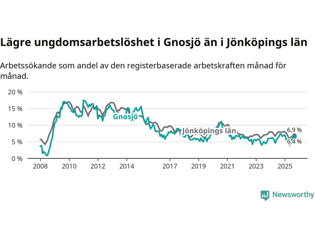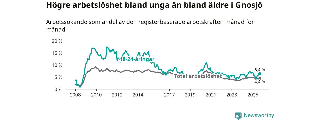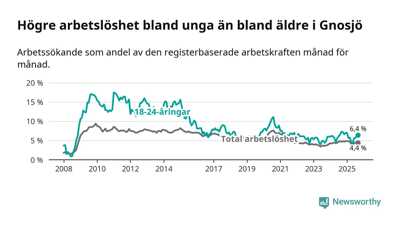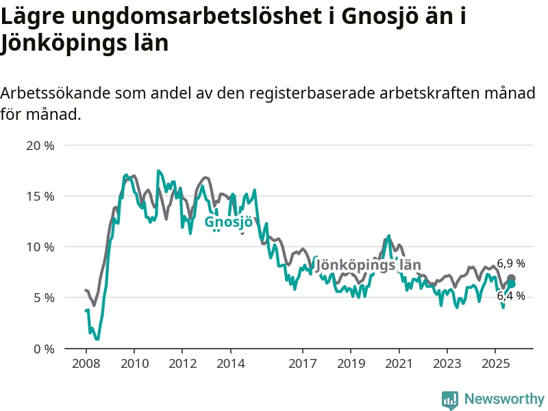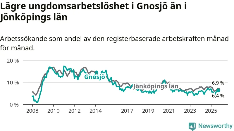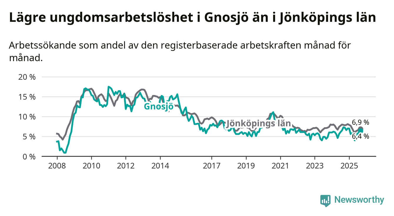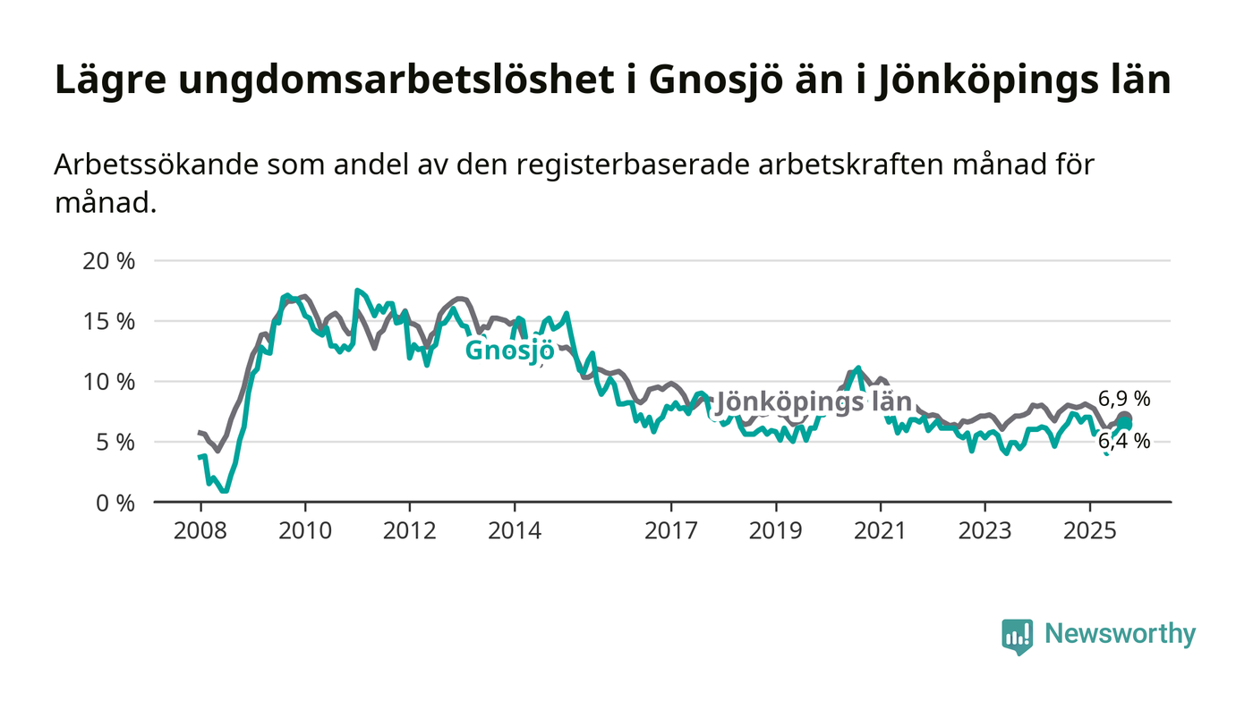 Precis som den totala arbetslösheten ligger ungdomsarbetslösheten i Gnosjö lägre än i Jönköpings län som helhet. Skillnaden mellan kommunen och länet är 0,5 procentenheter.