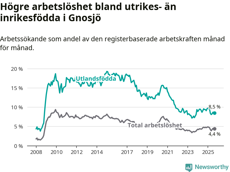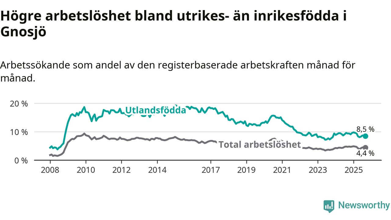 Skillnaden i arbetslöshet mellan utrikesfödda och hela befolkningen är 4,1 procentenheter i Gnosjö. Det är en mindre skillnad än för ett år sedan (−0,6 procentenheter).