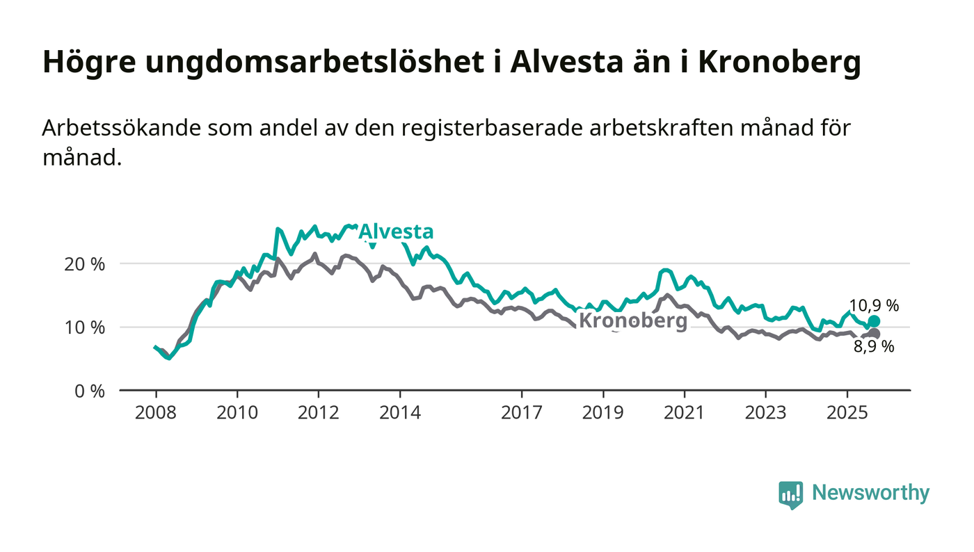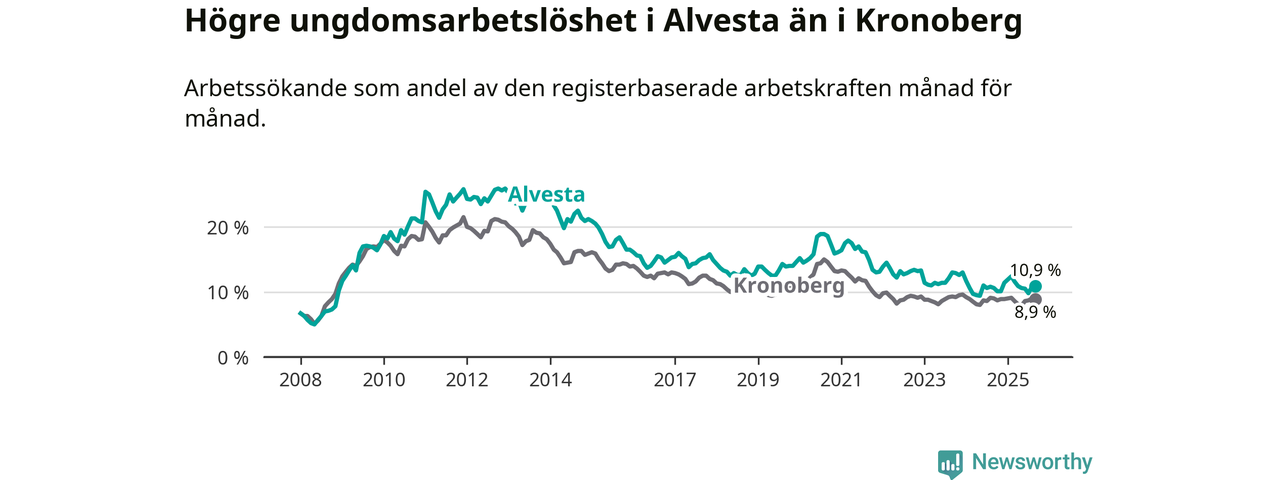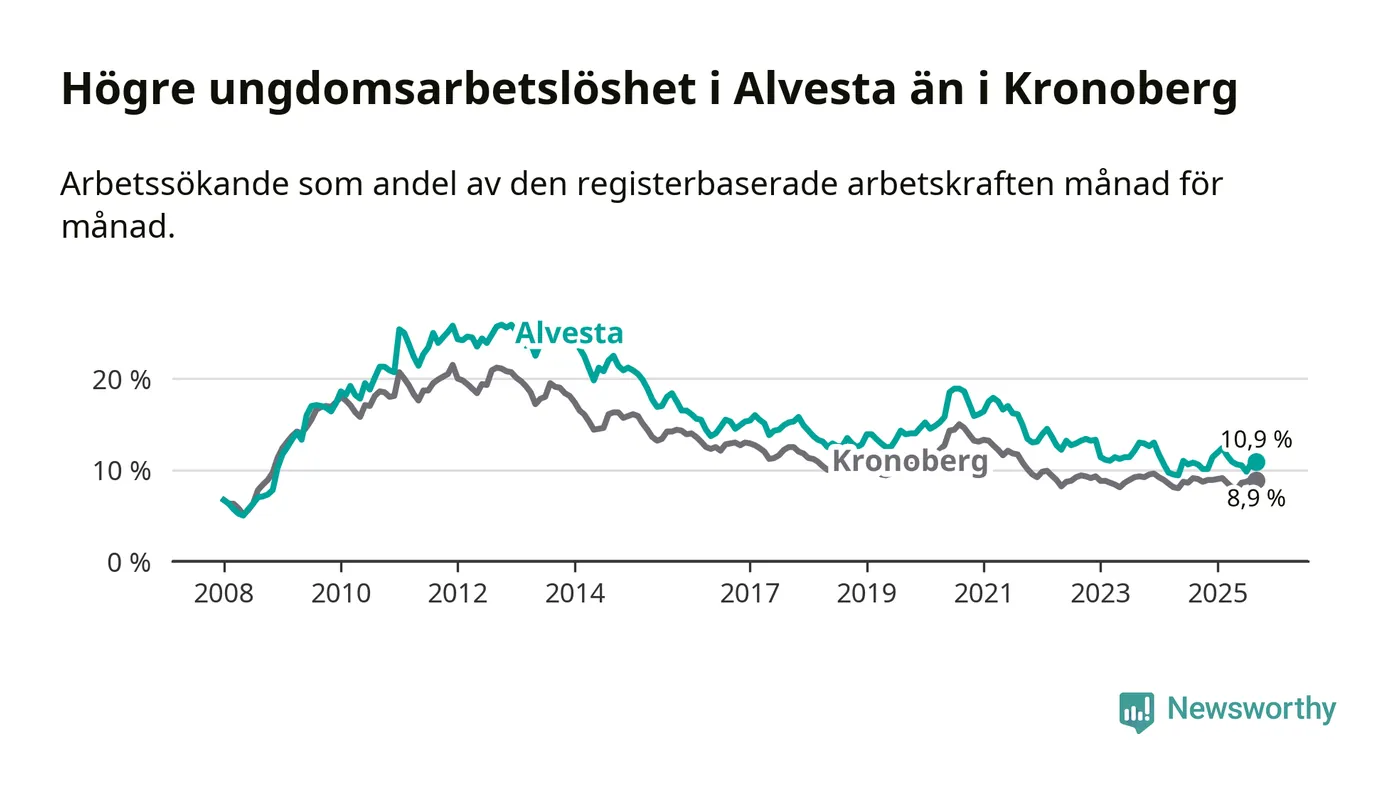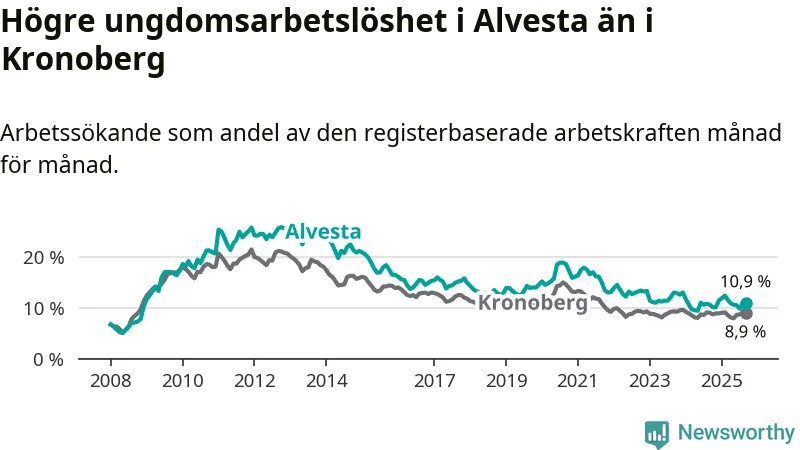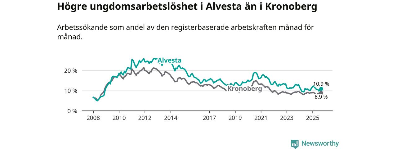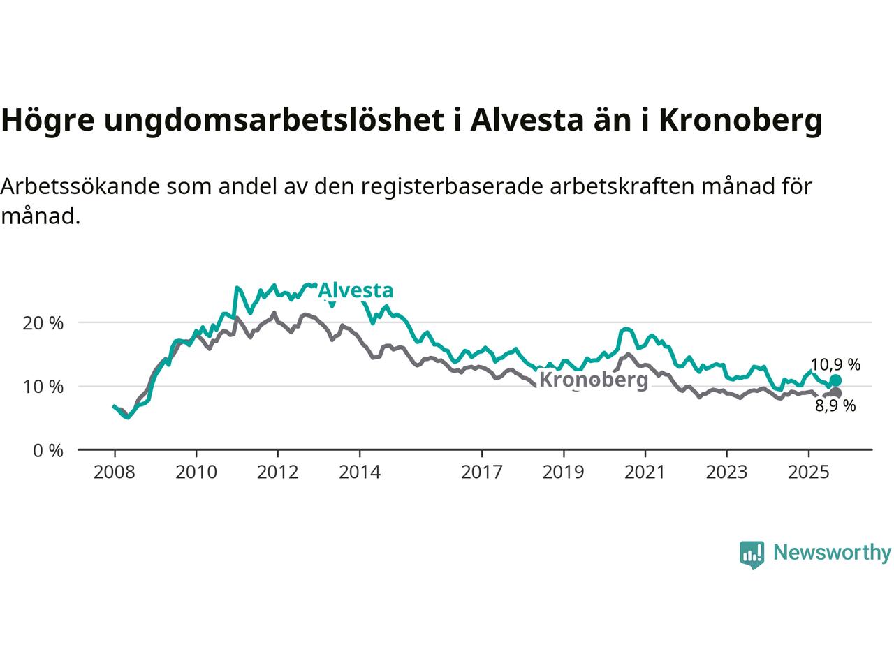 Precis som den totala arbetslösheten ligger ungdomsarbetslösheten i Alvesta högre än i Kronoberg som helhet. Skillnaden mellan kommunen och länet är 2,0 procentenheter.