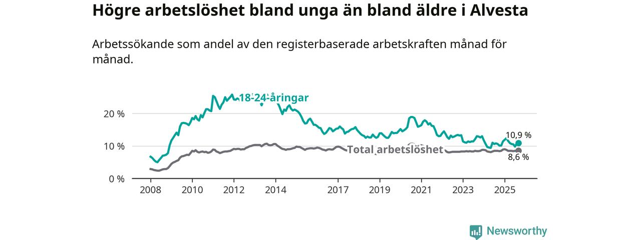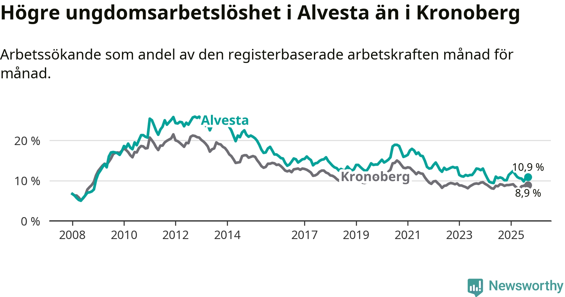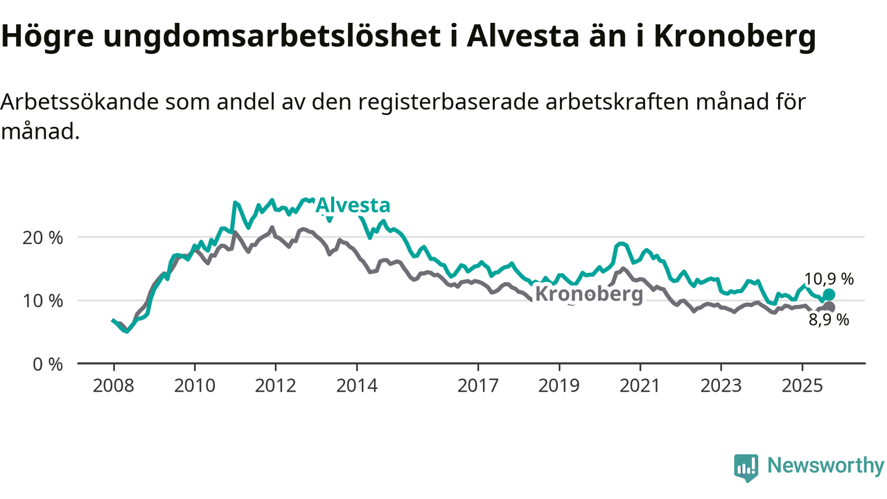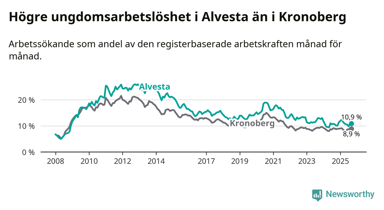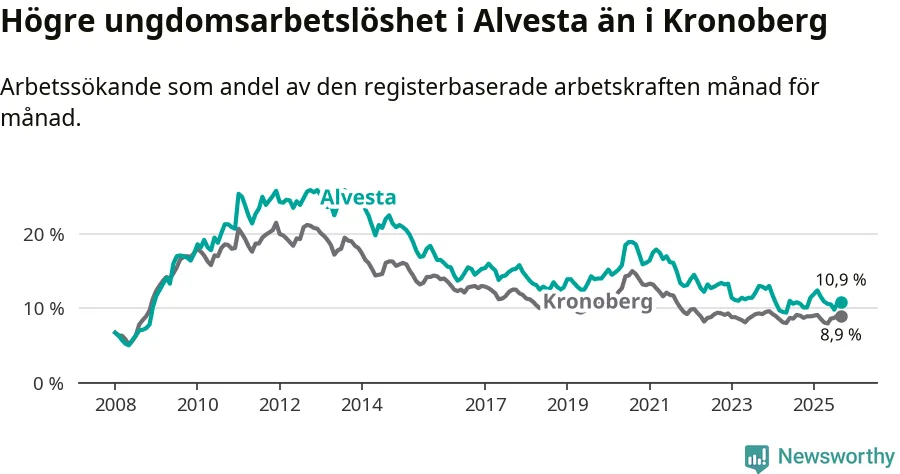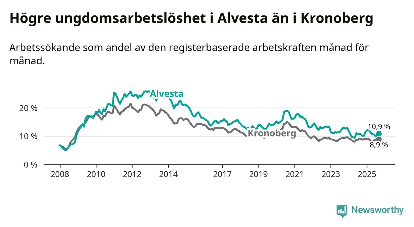 Precis som den totala arbetslösheten ligger ungdomsarbetslösheten i Alvesta högre än i Kronoberg som helhet. Skillnaden mellan kommunen och länet är 2,0 procentenheter.