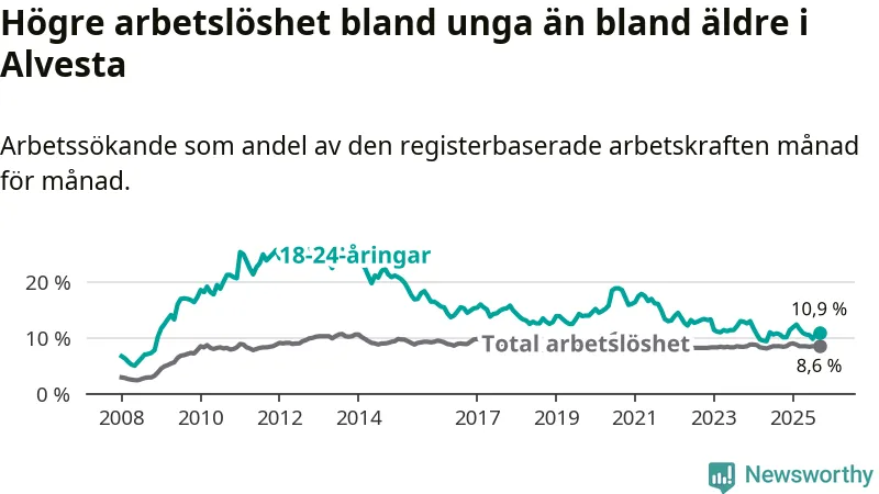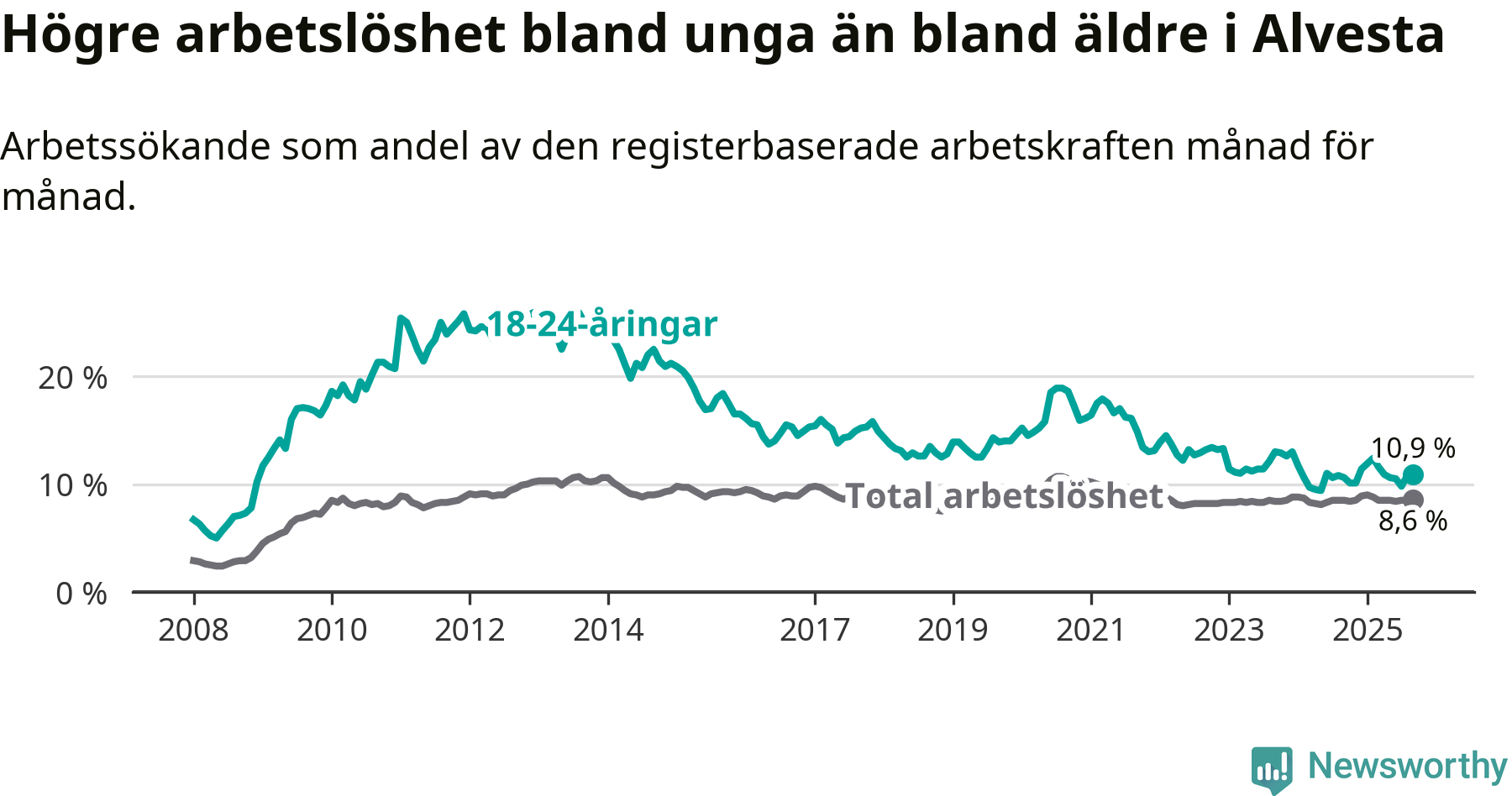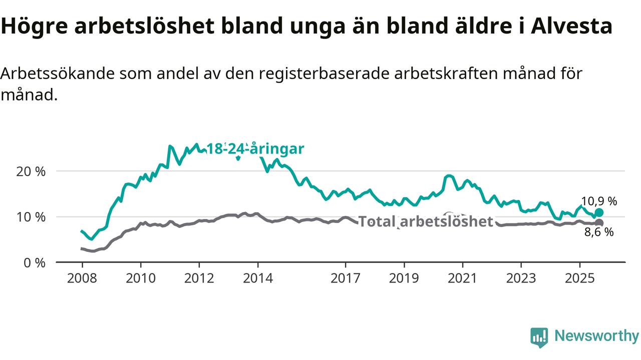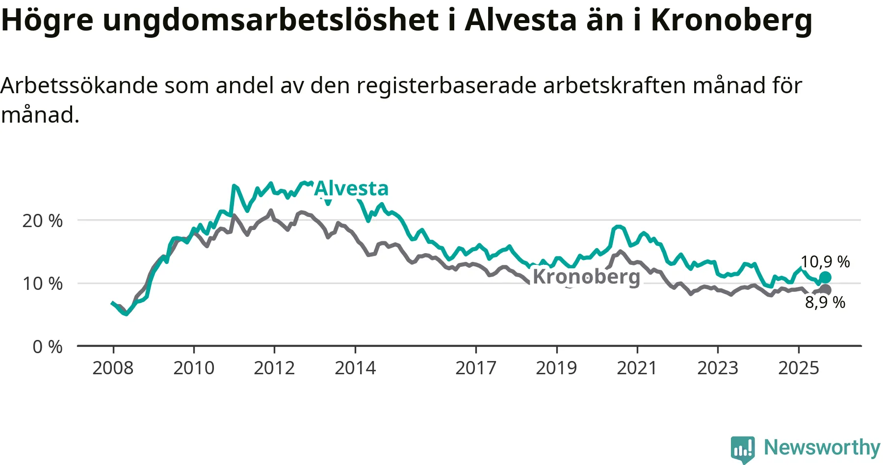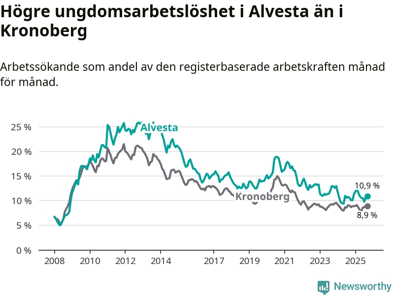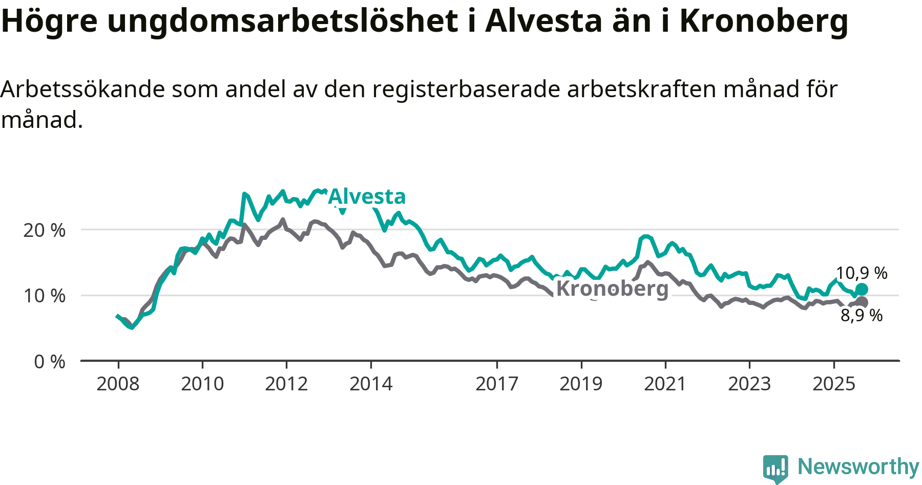 Precis som den totala arbetslösheten ligger ungdomsarbetslösheten i Alvesta högre än i Kronoberg som helhet. Skillnaden mellan kommunen och länet är 2,0 procentenheter.