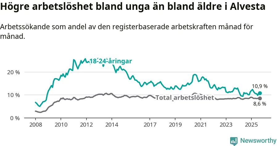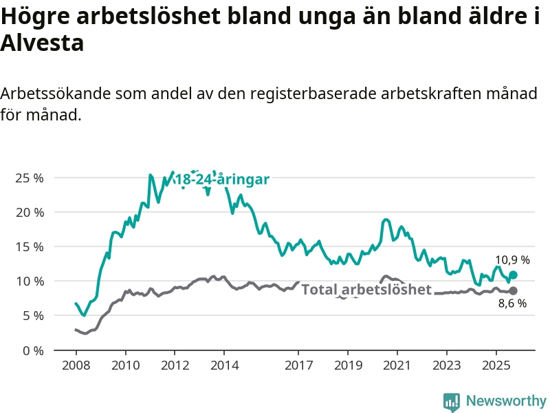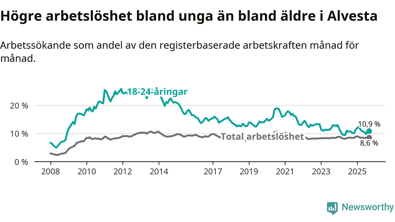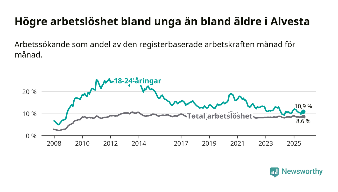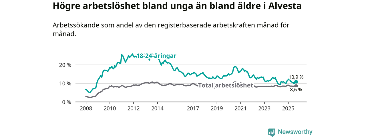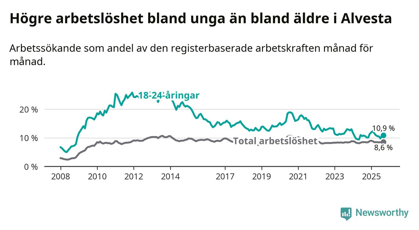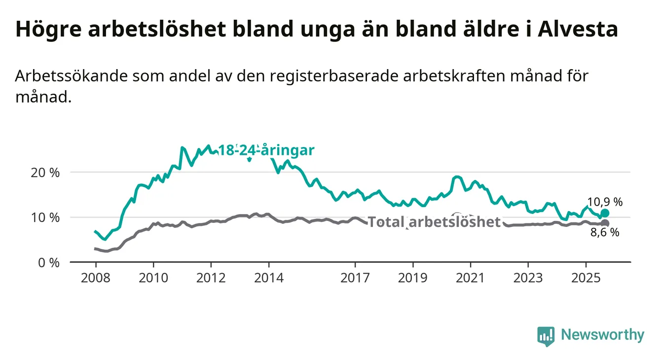 Precis som den totala arbetslösheten ligger ungdomsarbetslösheten i Alvesta högre än i Kronoberg som helhet. Skillnaden mellan kommunen och länet är 2,0 procentenheter.