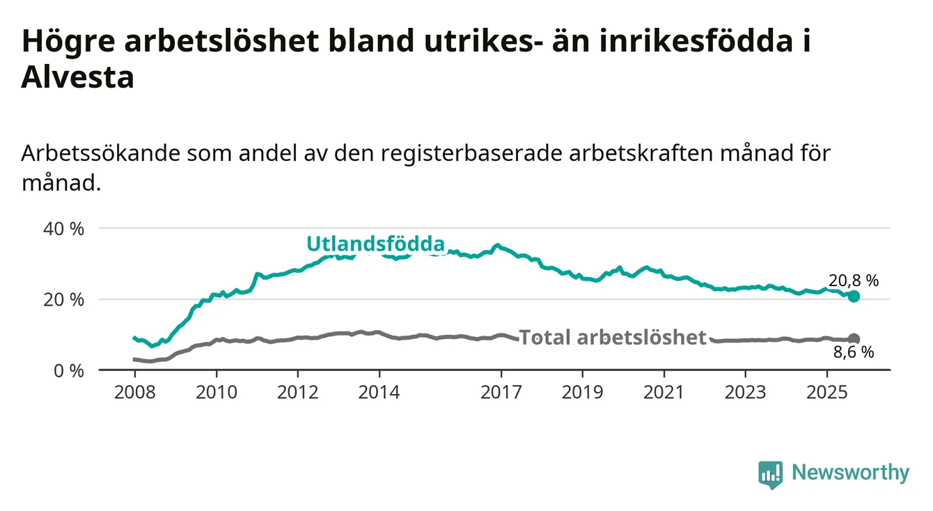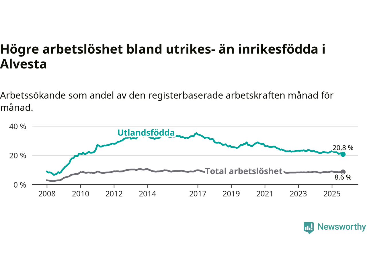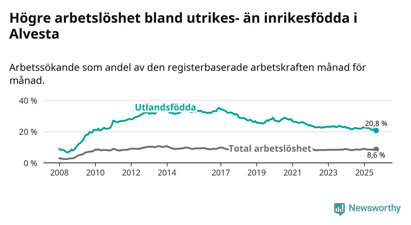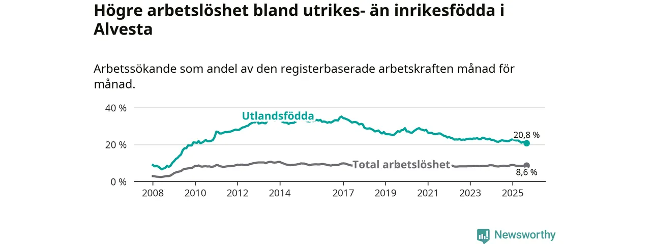Skillnaden i arbetslöshet mellan utrikesfödda och hela befolkningen är 12,2 procentenheter i Alvesta. Det är en mindre skillnad än för ett år sedan (−1,3 procentenheter).