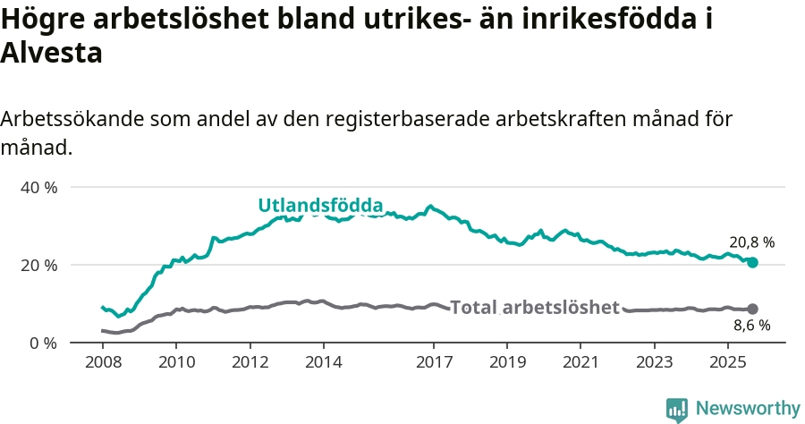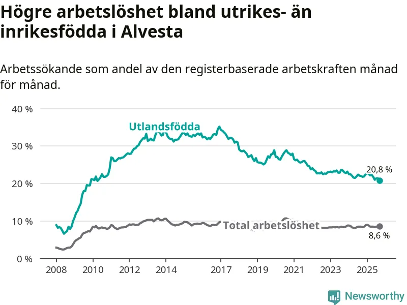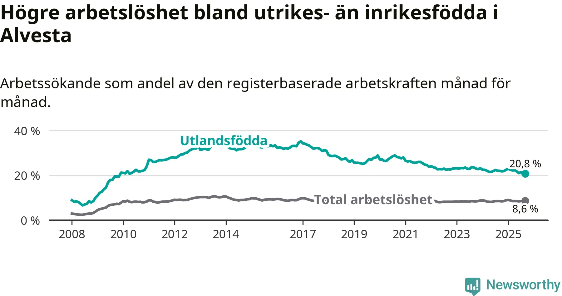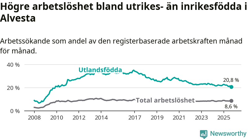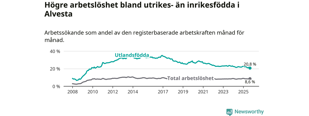 Skillnaden i arbetslöshet mellan utrikesfödda och hela befolkningen är 12,2 procentenheter i Alvesta. Det är en mindre skillnad än för ett år sedan (−1,3 procentenheter).
