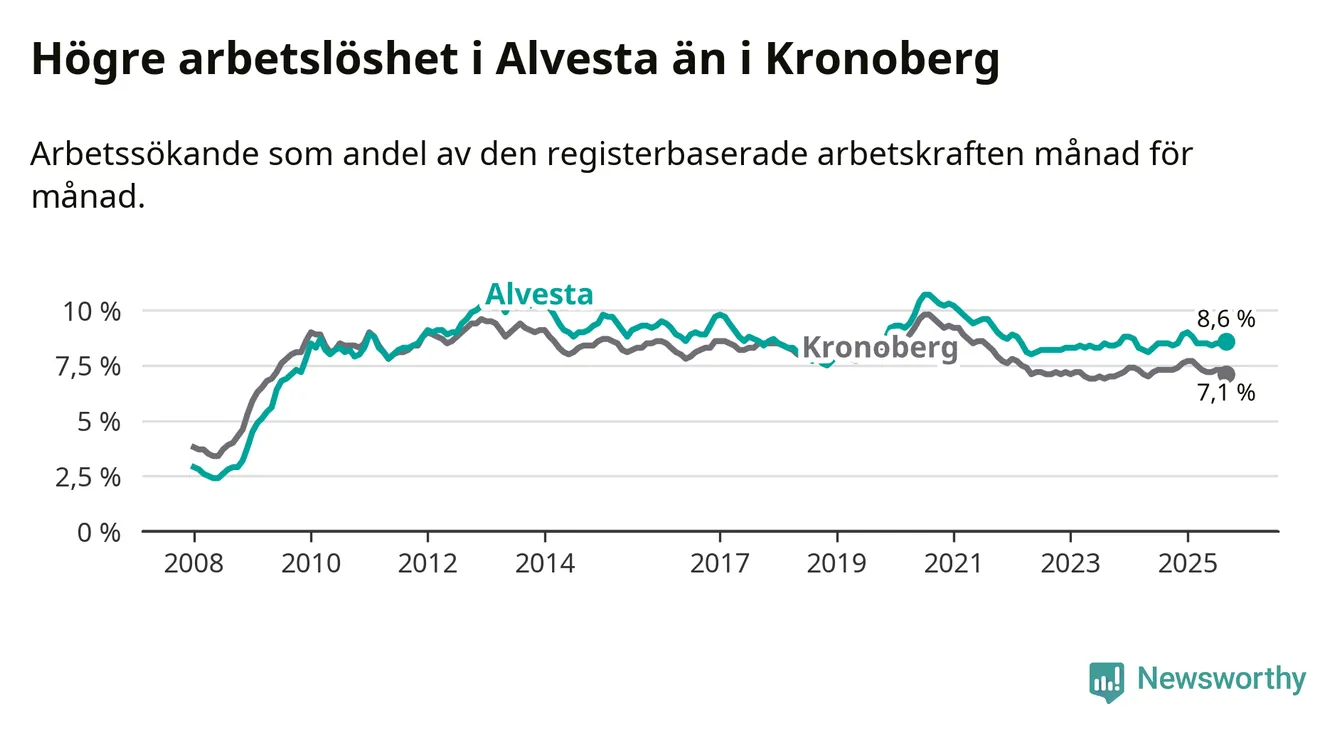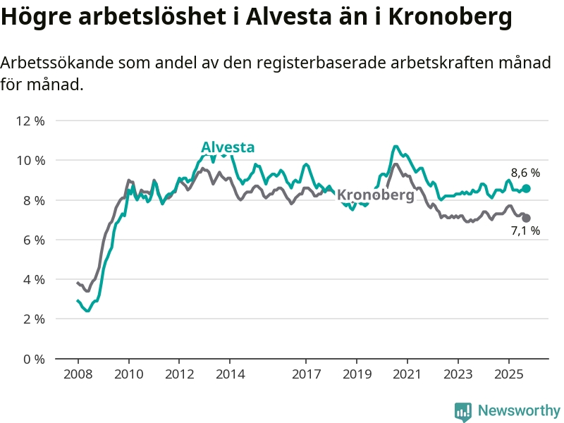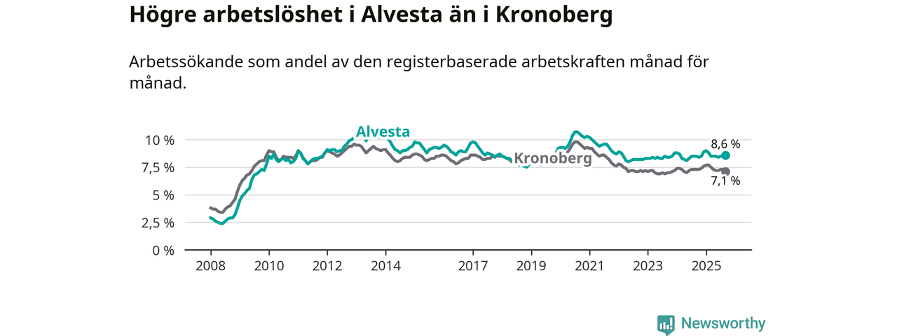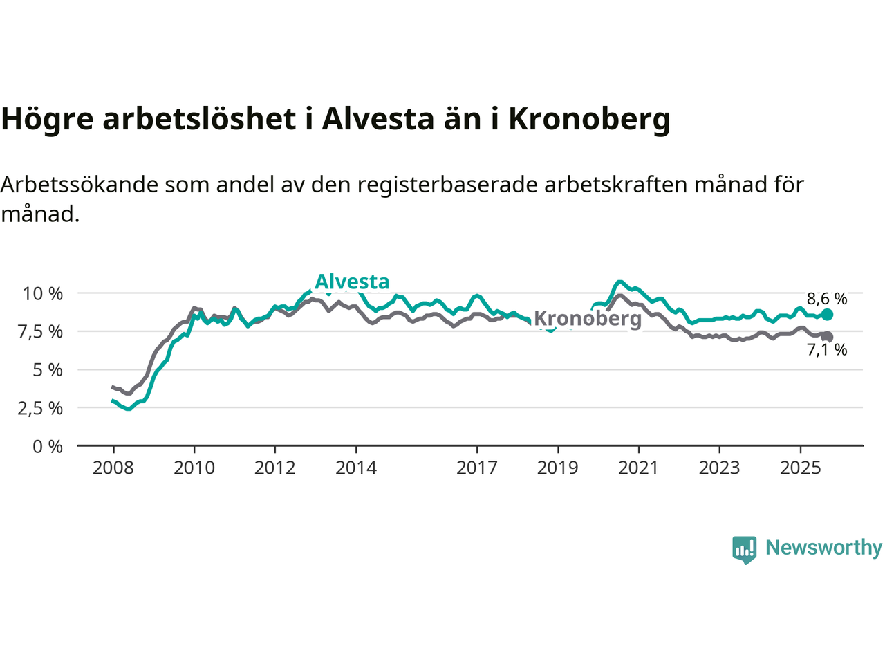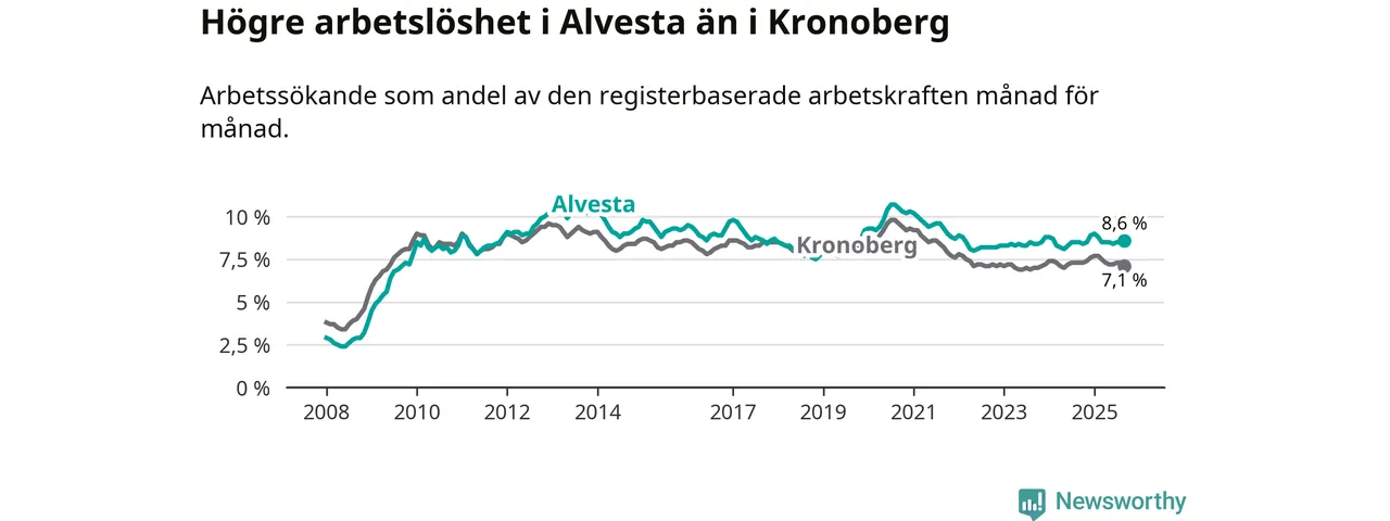 Under september månad rapporterade Alvesta kommun en total arbetslöshet på 8,6 procent. Det är en ökning jämfört med samma tidpunkt i fjol (+0,1 procentenheter). I Kronobergs län däremot sjunker arbetslösheten .