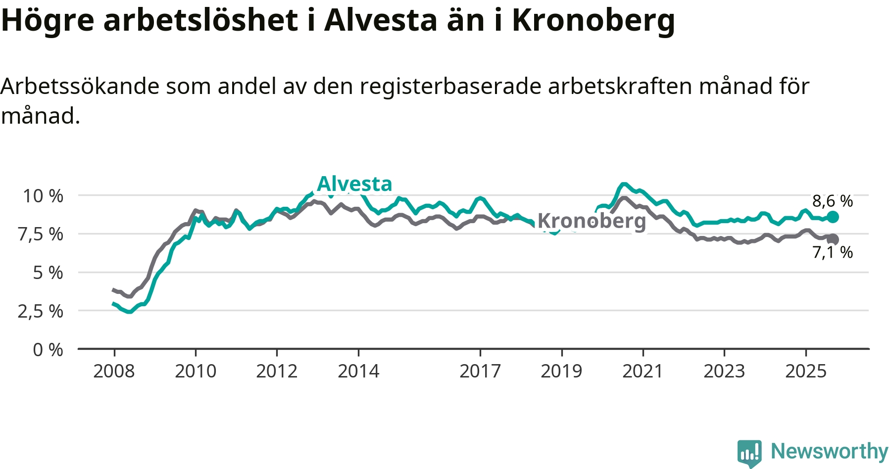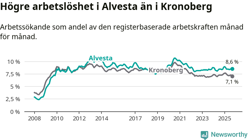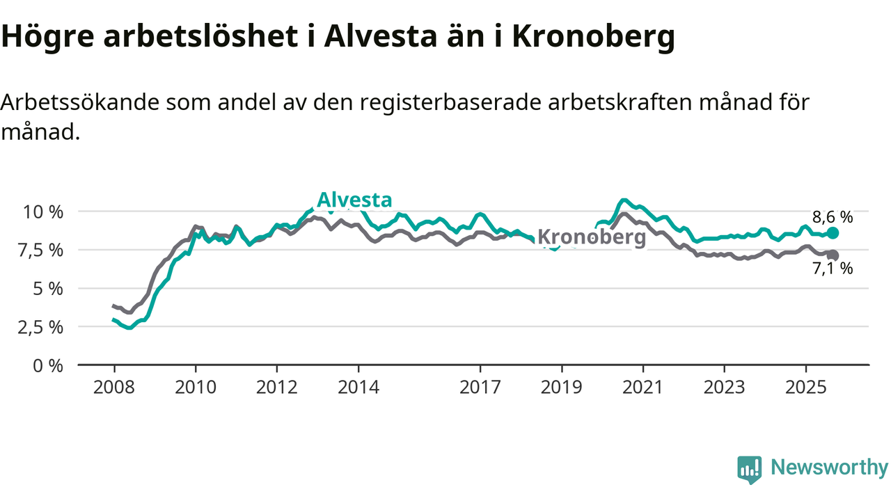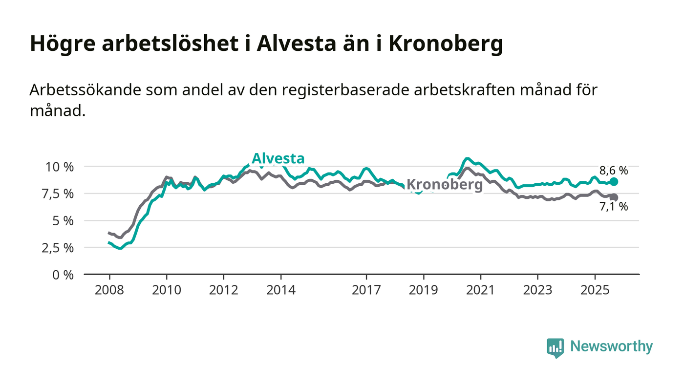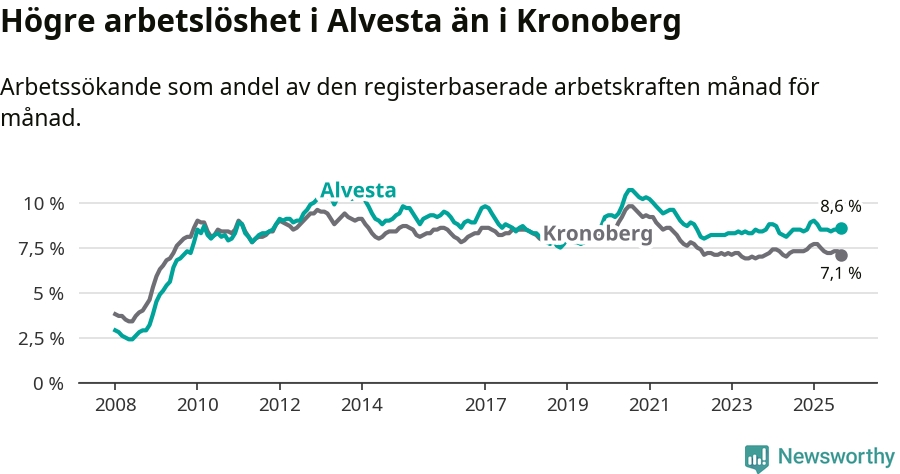 Under september månad rapporterade Alvesta kommun en total arbetslöshet på 8,6 procent. Det är en ökning jämfört med samma tidpunkt i fjol (+0,1 procentenheter). I Kronobergs län däremot sjunker arbetslösheten .