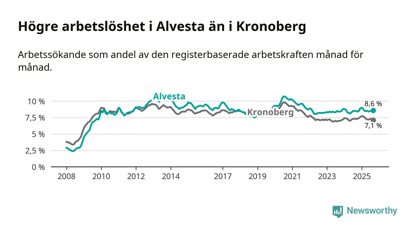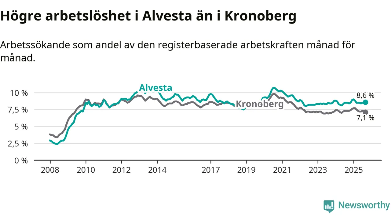 Alvesta hade redan tidigare högre arbetslöshet än snittet i hela Kronobergs län och nu växer klyftan (8,6 procent i kommunen, jämfört med 7,1 procent i hela länet). Ljungby har den lägsta arbetslösheten i länet (5,2 procent), medan Lessebo har den högsta (10,1 procent). För att Alvesta skulle komma ner i samma arbetslöshetsnivå som Ljungby skulle 319 personer behöva sysselsättas.