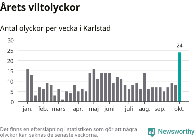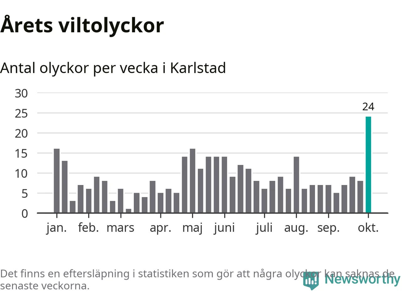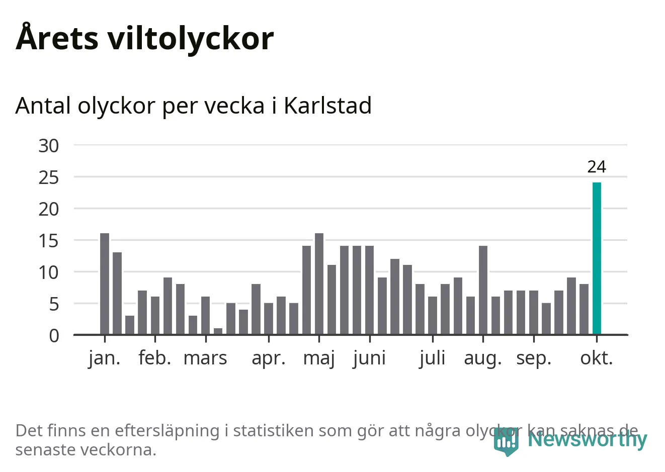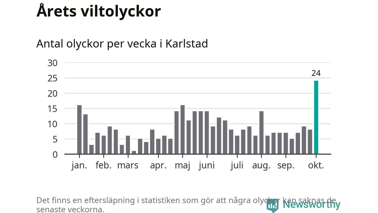 Hittills har 24 viltolyckor rapporterats in i Karlstads kommun från vecka 41. Det är en av de högsta höstsiffrorna för en enskild vecka på över tio år.