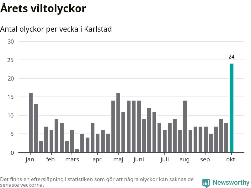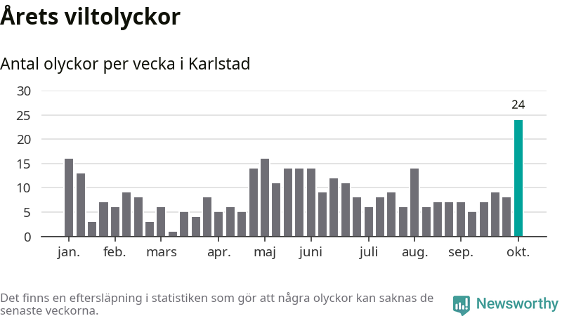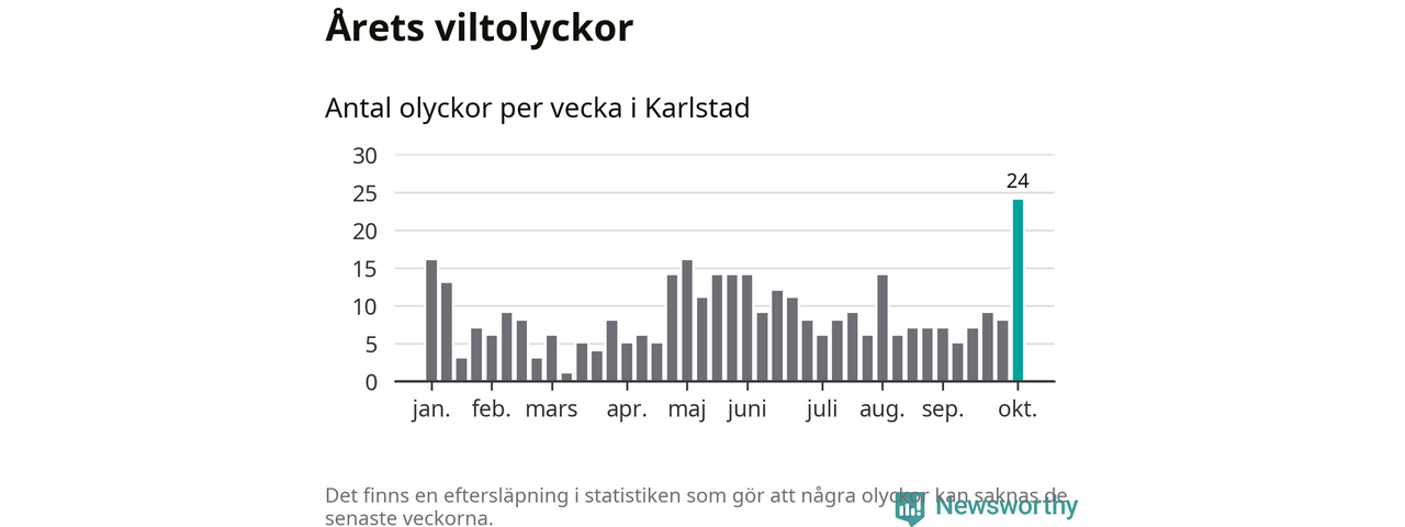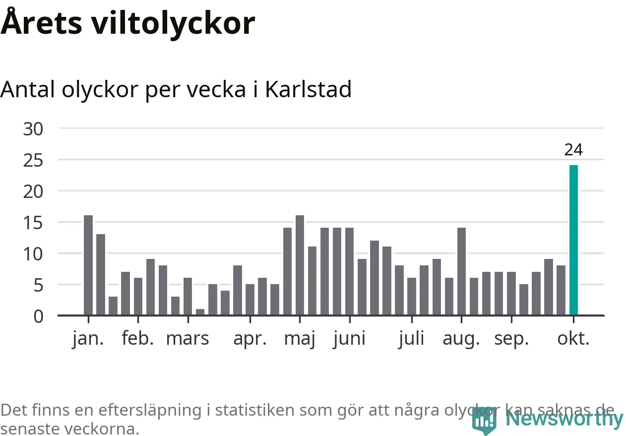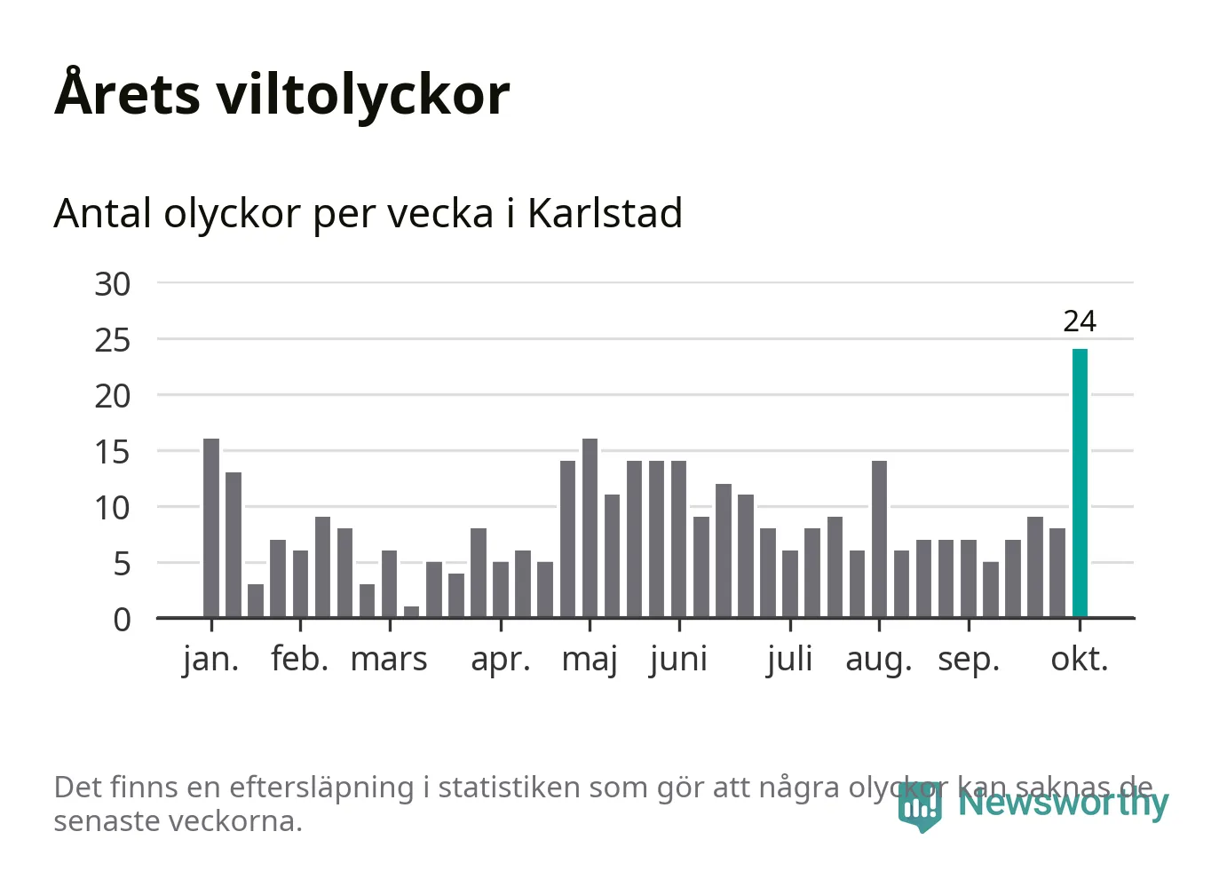Hittills har 24 viltolyckor rapporterats in i Karlstads kommun från vecka 41. Det är en av de högsta höstsiffrorna för en enskild vecka på över tio år.