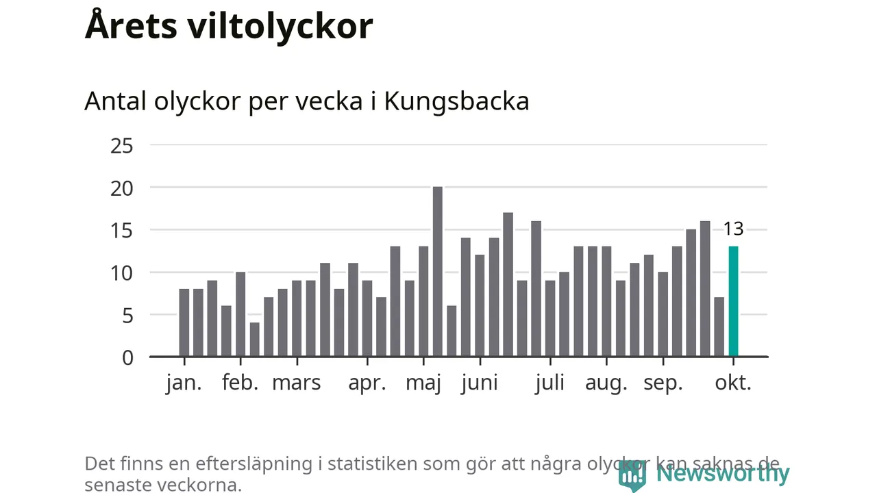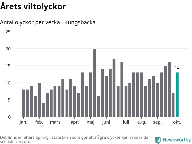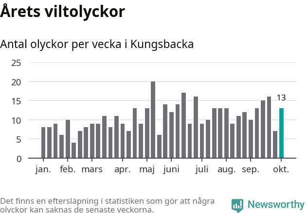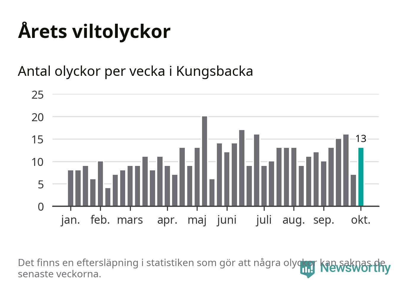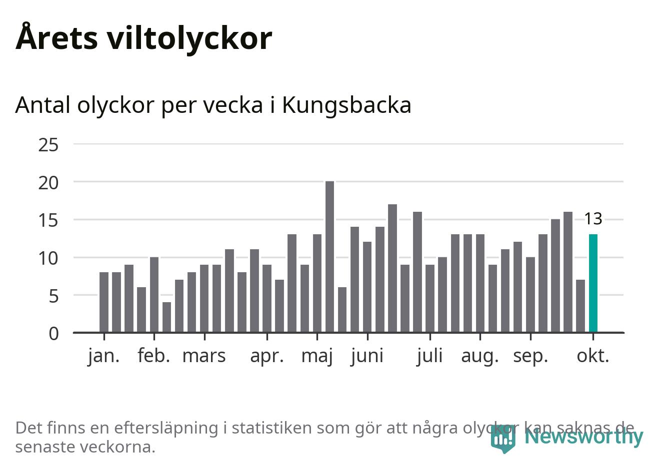 Hittills har 13 viltolyckor rapporterats in i Kungsbacka kommun från vecka 41. Se listan här.