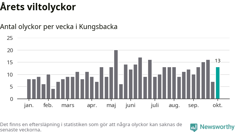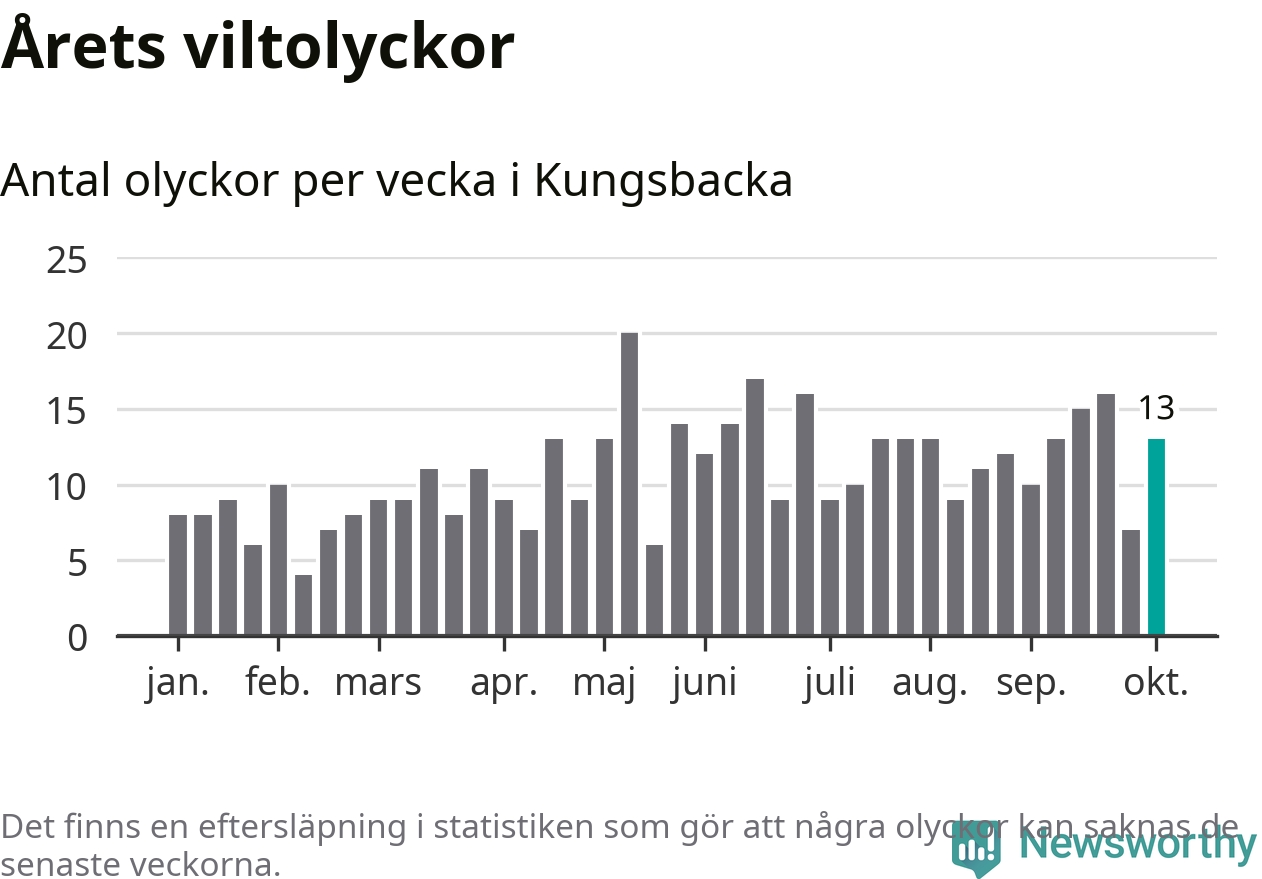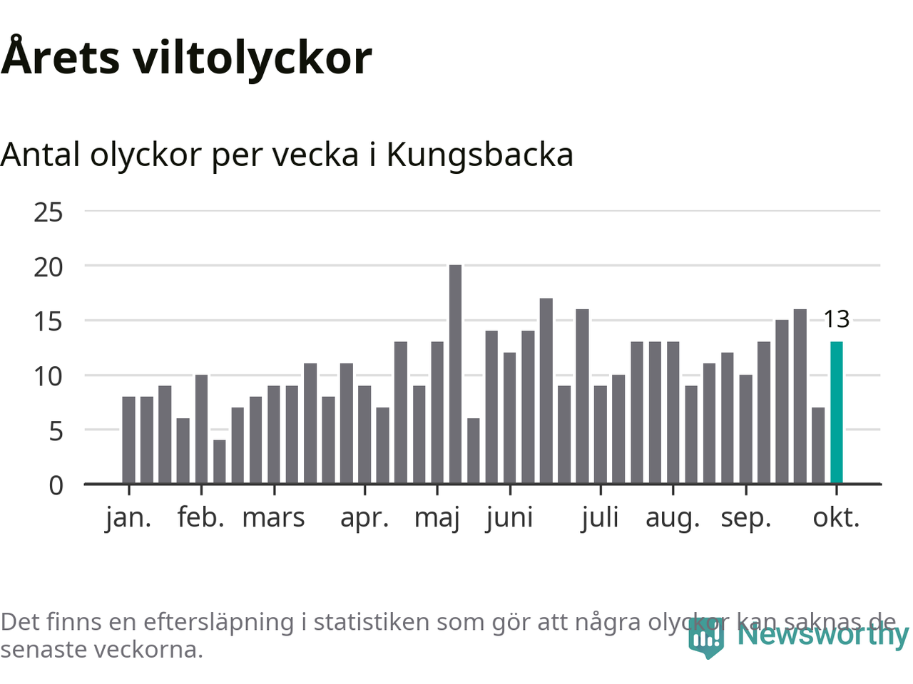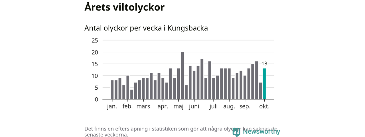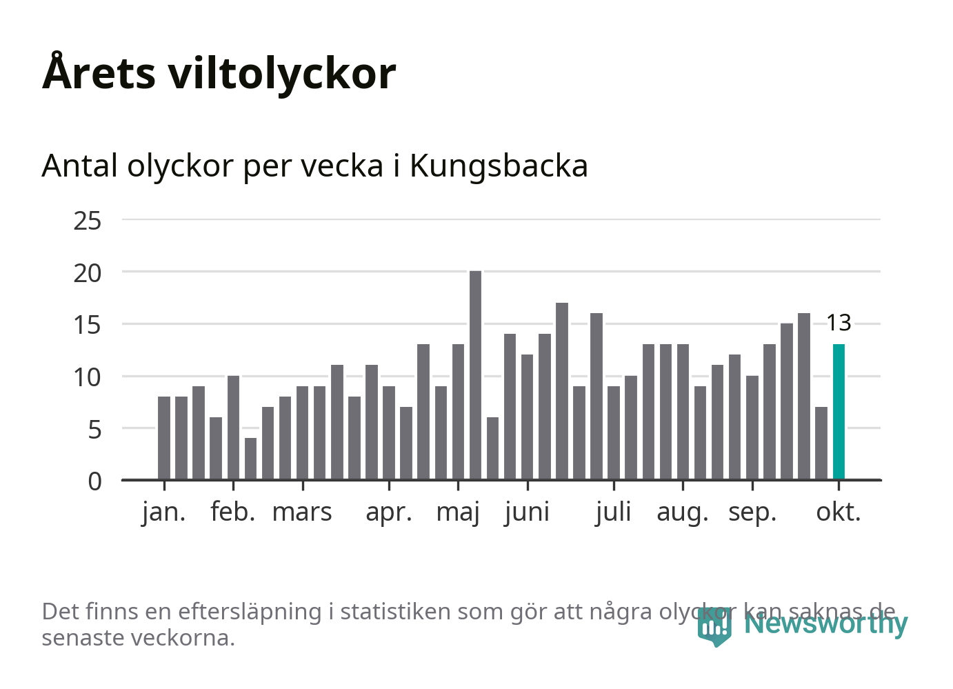 Hittills har 13 viltolyckor rapporterats in i Kungsbacka kommun från vecka 41. Se listan här.